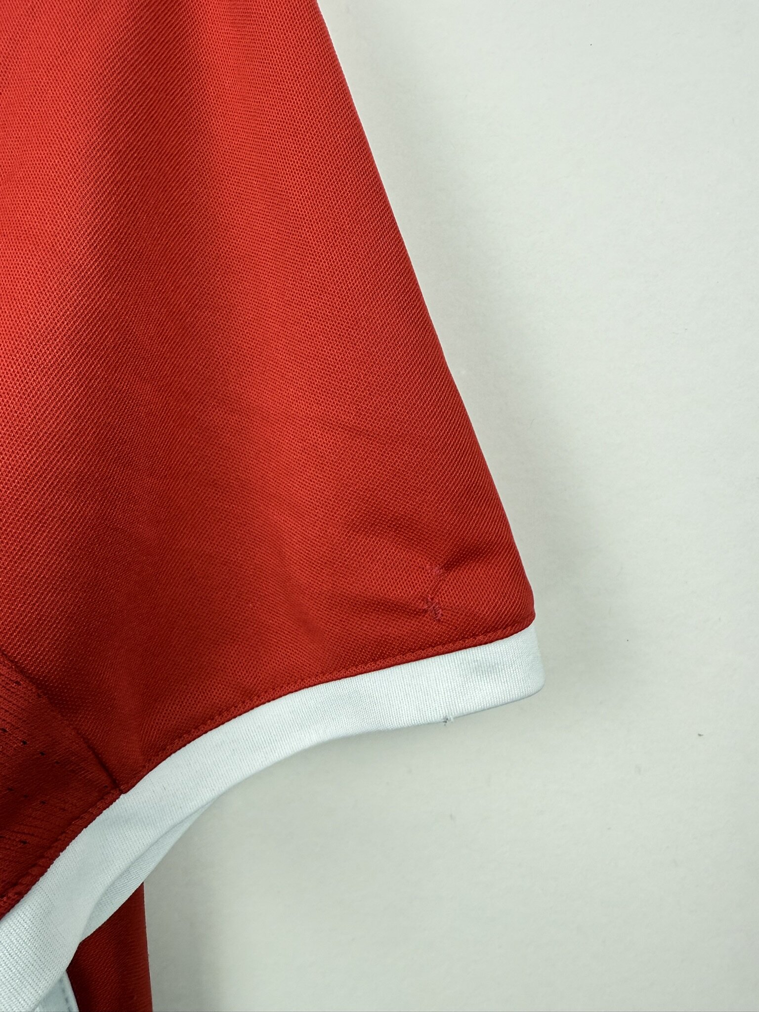 Ta oryginalna domowa koszulka Bayernu Monachium z sezonu 2016/17, wyprodukowana przez Adidasa, to klasyczny model w tradycyjnych czerwonych barwach, wzbogacony o elegancki kołnierzyk w stylu polo z zapięciem na guziki. Egzemplarz posiada oficjalny nadruk Joshuy Kimmicha na plecach – jednego z najbardziej wszechstronnych i utalentowanych piłkarzy młodego pokolenia, który właśnie w tym okresie umacniał swoją pozycję w drużynie.