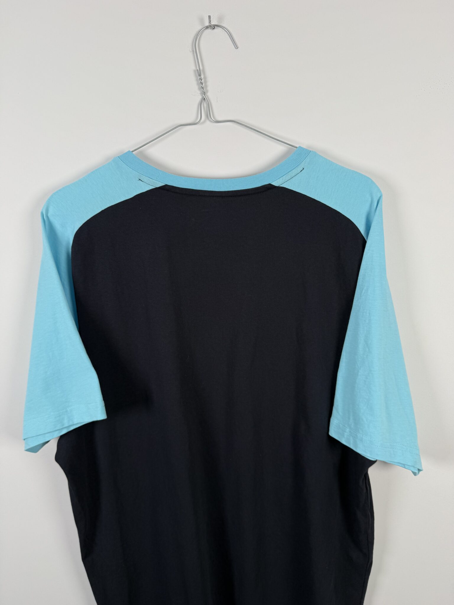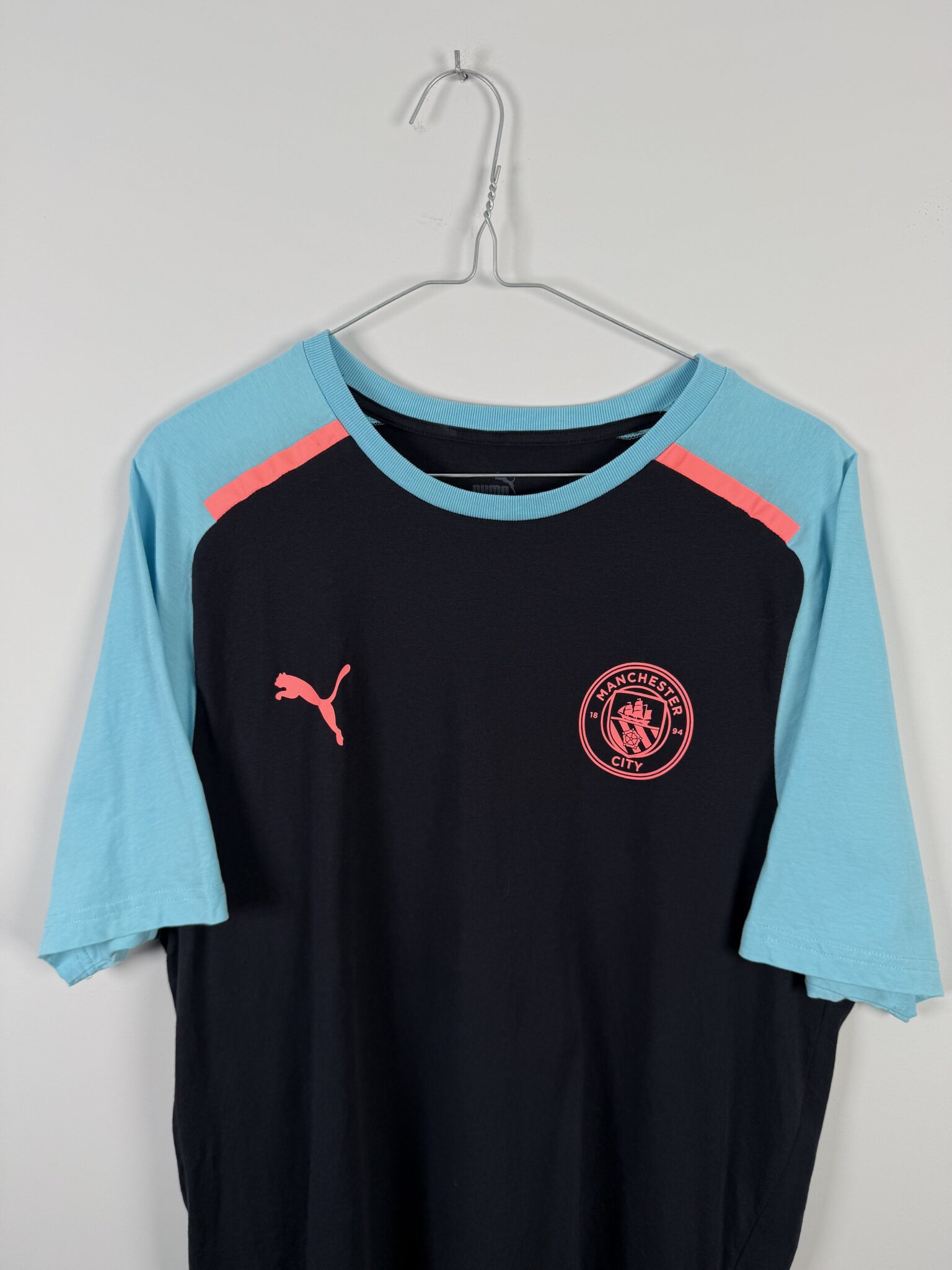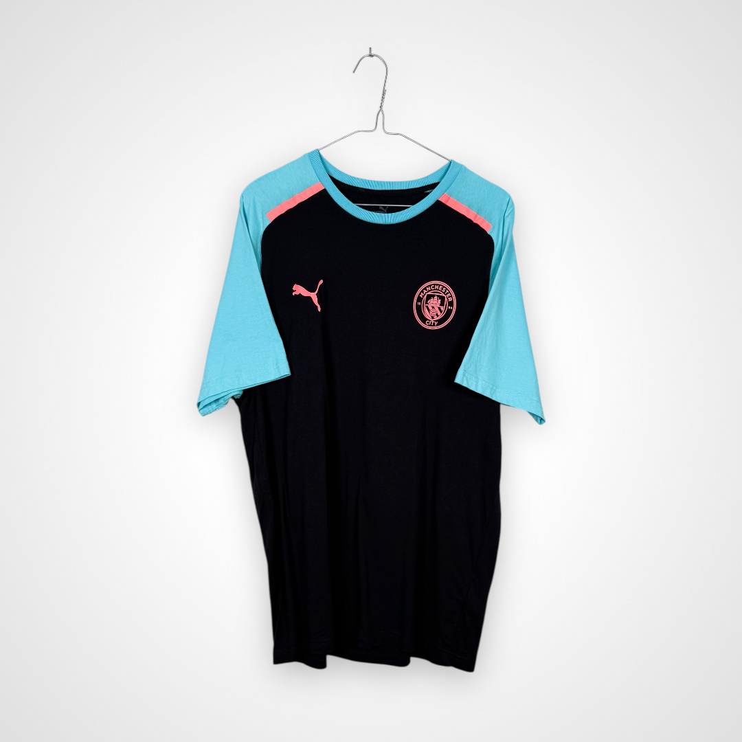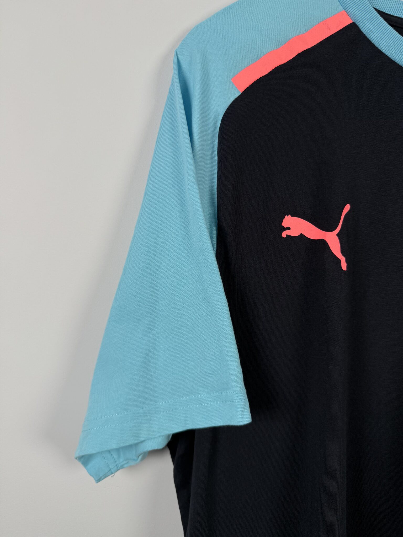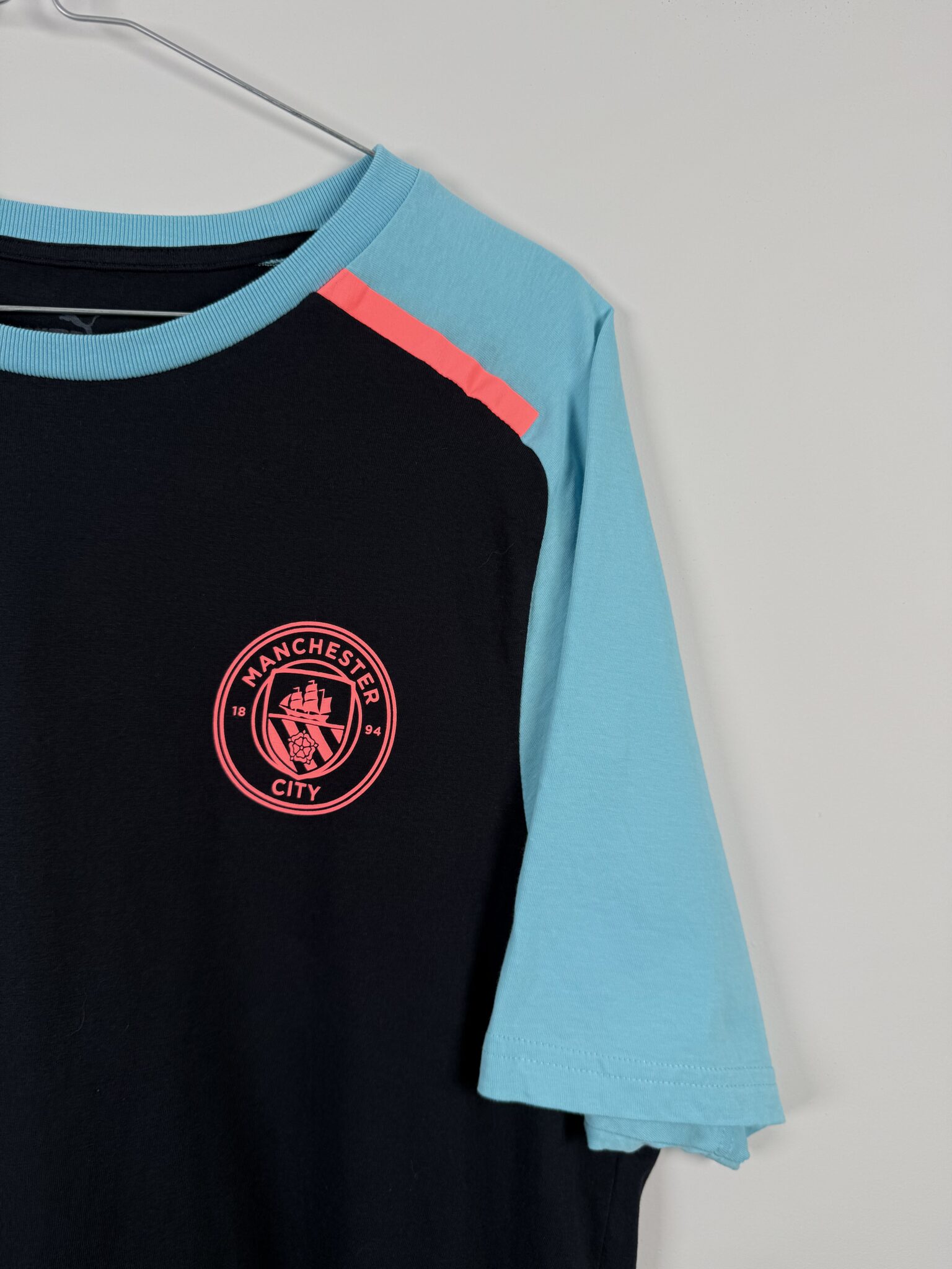 Ta bawełniana koszulka Manchesteru City z sezonu 2023/24, wyprodukowana przez Pumę, to stylowy model w czarnym kolorze, przełamany kontrastującymi turkusowymi rękawkami, które nadają jej nowoczesnego i energetycznego charakteru. Na froncie wyróżniają się różowe logo Pumy oraz herb klubowy Manchester City, co tworzy unikatowe zestawienie barw, idealnie wpisujące się w dynamiczny wizerunek „The Citizens”.