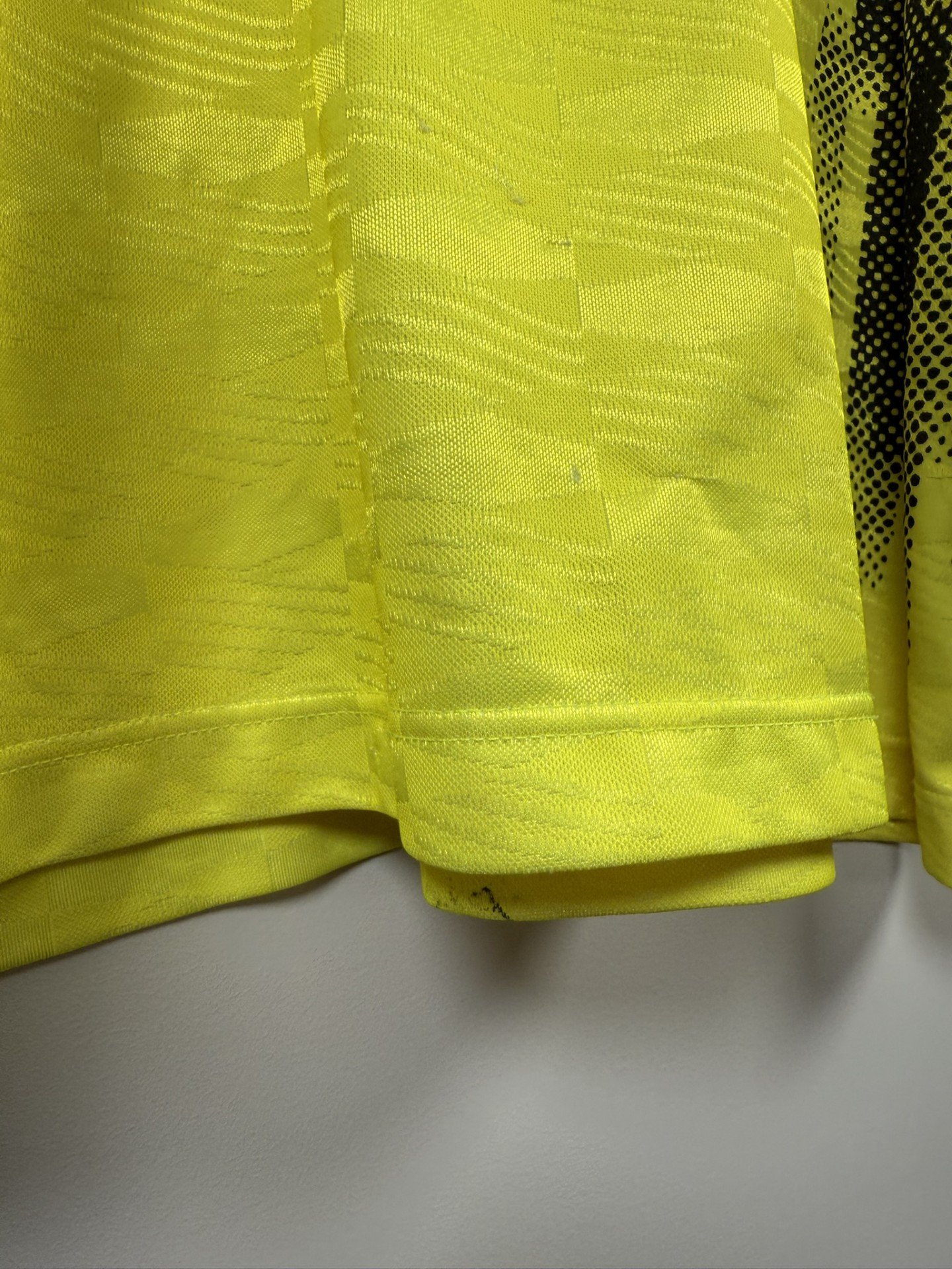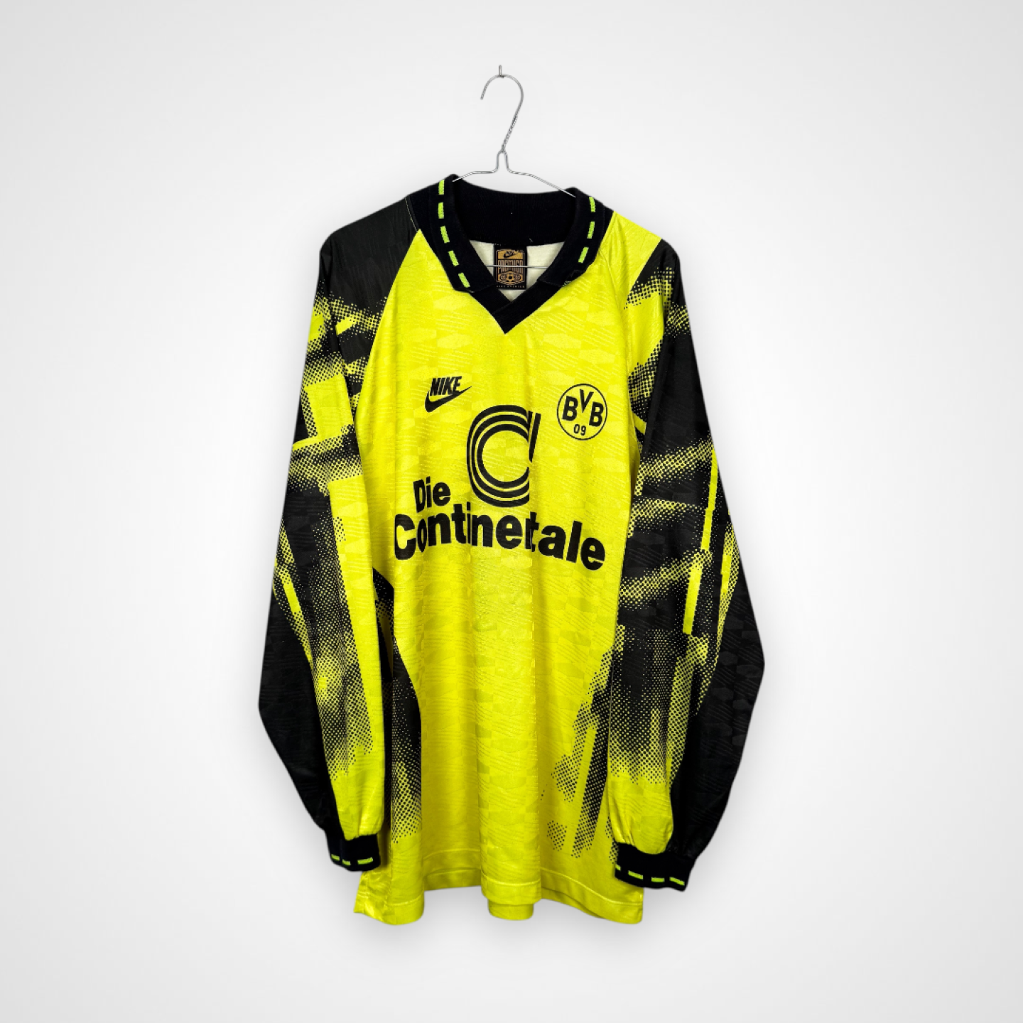 Ta oryginalna domowa koszulka Borussii Dortmund z sezonu 1992/93 to wyjątkowy model marki Nike, przygotowany w wersji z długim rękawem. Utrzymana w klasycznej dla klubu żółto-czarnej kolorystyce, wyróżnia się charakterystycznym dla wczesnych lat 90. dynamicznym wzornictwem oraz luźnym krojem, typowym dla piłkarskich trykotów z tamtej epoki.