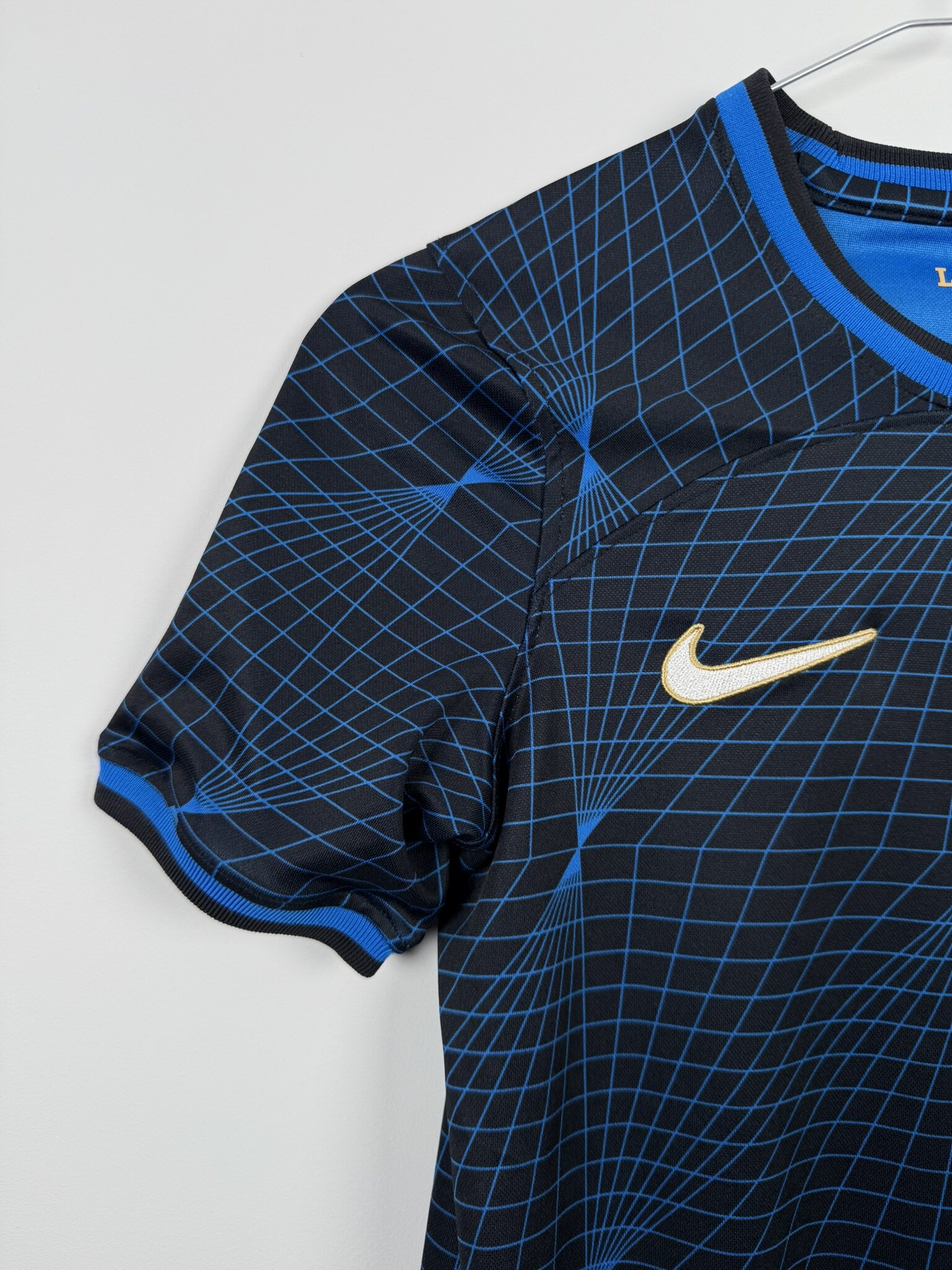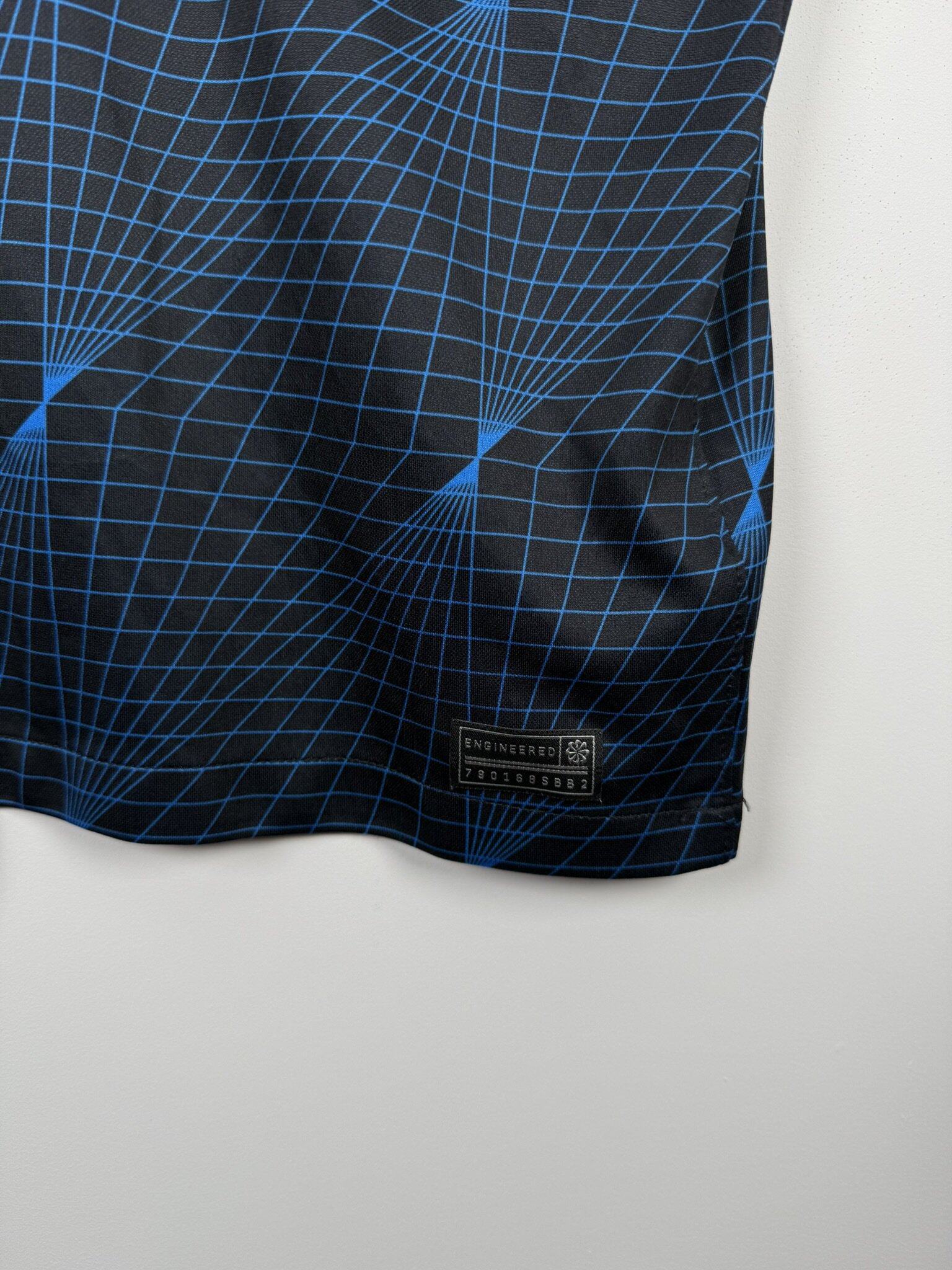 Ta oryginalna wyjazdowa koszulka Chelsea FC z sezonu 2023/24, wyprodukowana przez Nike, to młodzieżowa wersja na wzrost 147 cm, ozdobiona oficjalnym nadrukiem Christophera Nkunku wraz z numerem na plecach. Projekt wyjazdowego stroju łączy odcienie niebieskiego i turkusu z geometrycznym wzorem na całej powierzchni, co nadaje mu nowoczesny i dynamiczny charakter.