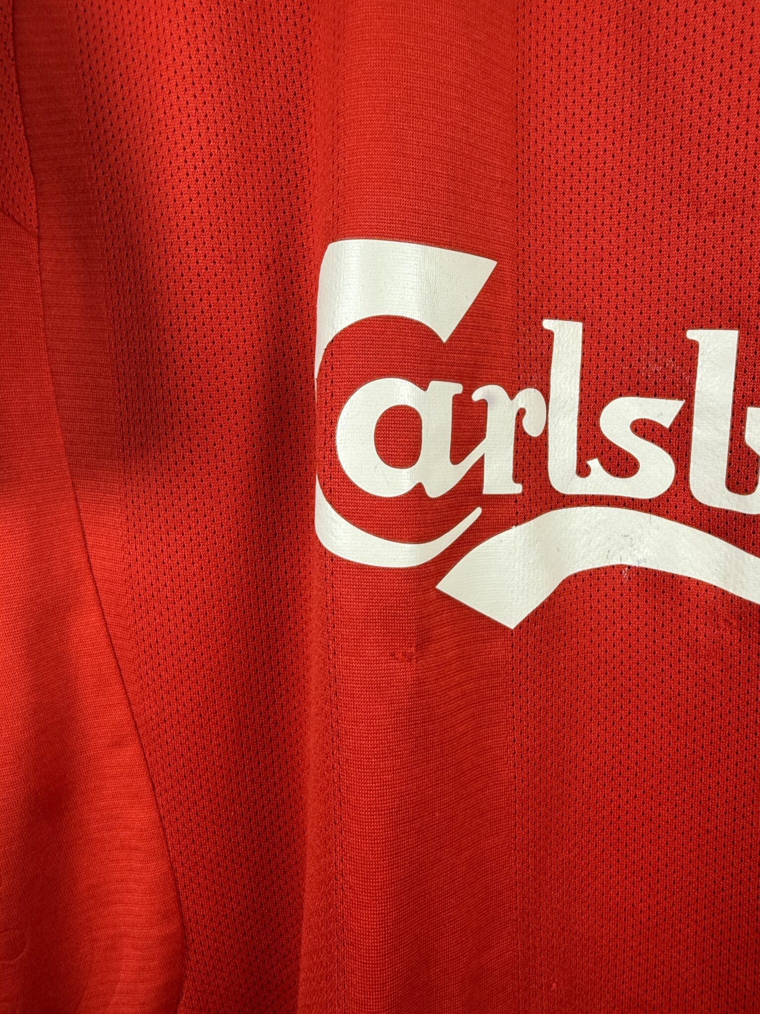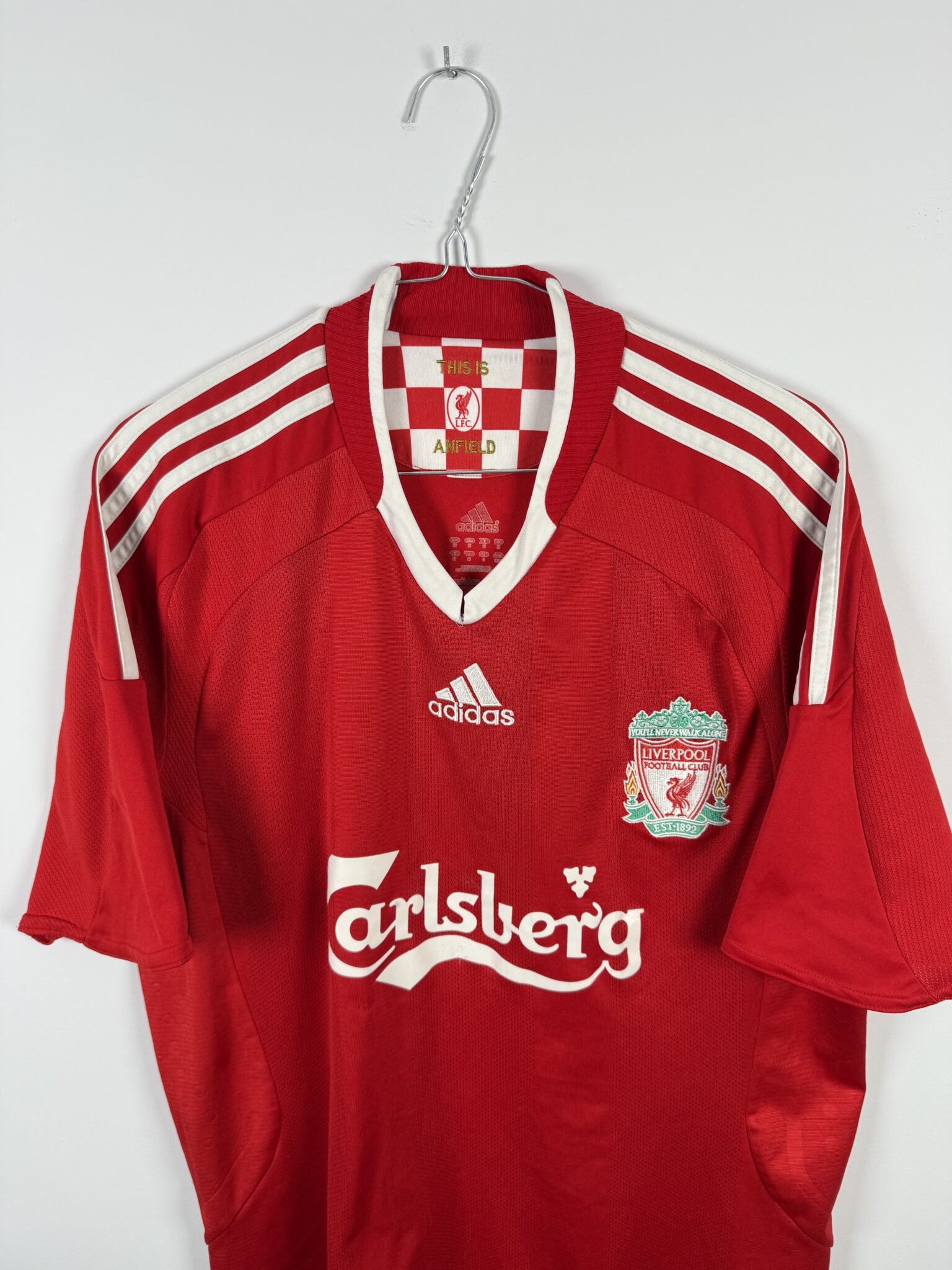 Koszulka wyróżnia się eleganckim krojem z delikatnym kołnierzykiem ze złotymi detalami oraz charakterystycznymi białymi paskami Adidasa na ramionach. Na froncie znajduje się logo sponsora Carlsberg, herb Liverpoolu oraz znak Adidasa, które tworzą ponadczasowy zestaw elementów kojarzony z końcówką pierwszej dekady XXI wieku. Model ten został wykonany w technologii Adidas ClimaCool, zapewniającej piłkarzom lekkość, przewiewność i komfort podczas gry.