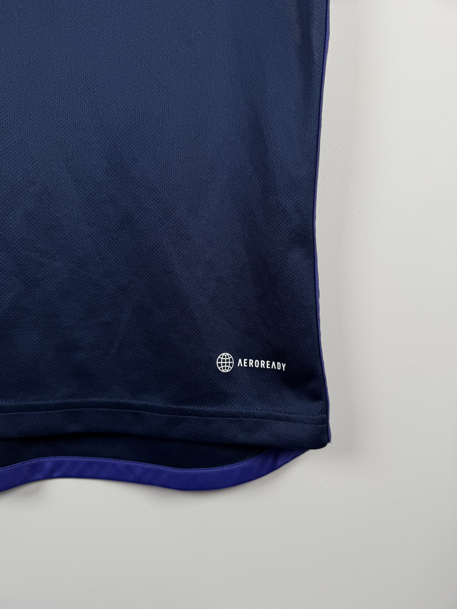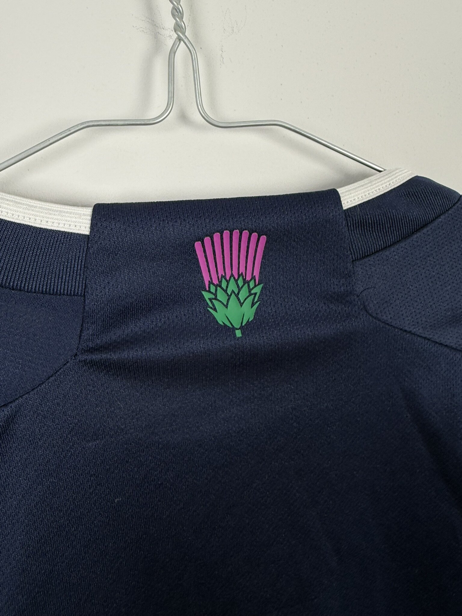 Ta oryginalna domowa koszulka reprezentacji Szkocji z lat 2022–2024, wyprodukowana przez Adidasa, to młodzieżowa wersja na wzrost 164 cm. Model utrzymany jest w klasycznym dla szkockiej kadry granatowym kolorze, który został wzbogacony o unikatowe detale – fioletowe paski Adidasa na ramionach i rękawkach oraz subtelny motyw szkockiej kraty na karku i zakończeniach rękawków. Te elementy nadają koszulce wyjątkowego charakteru, łącząc tradycję ze współczesnym stylem.