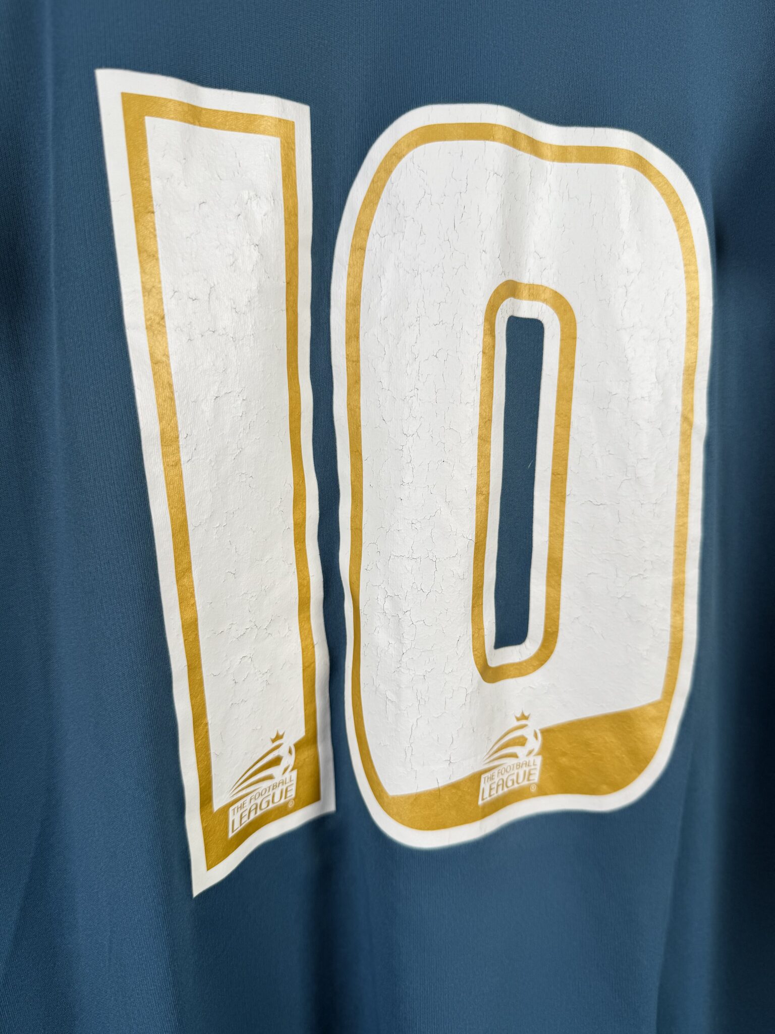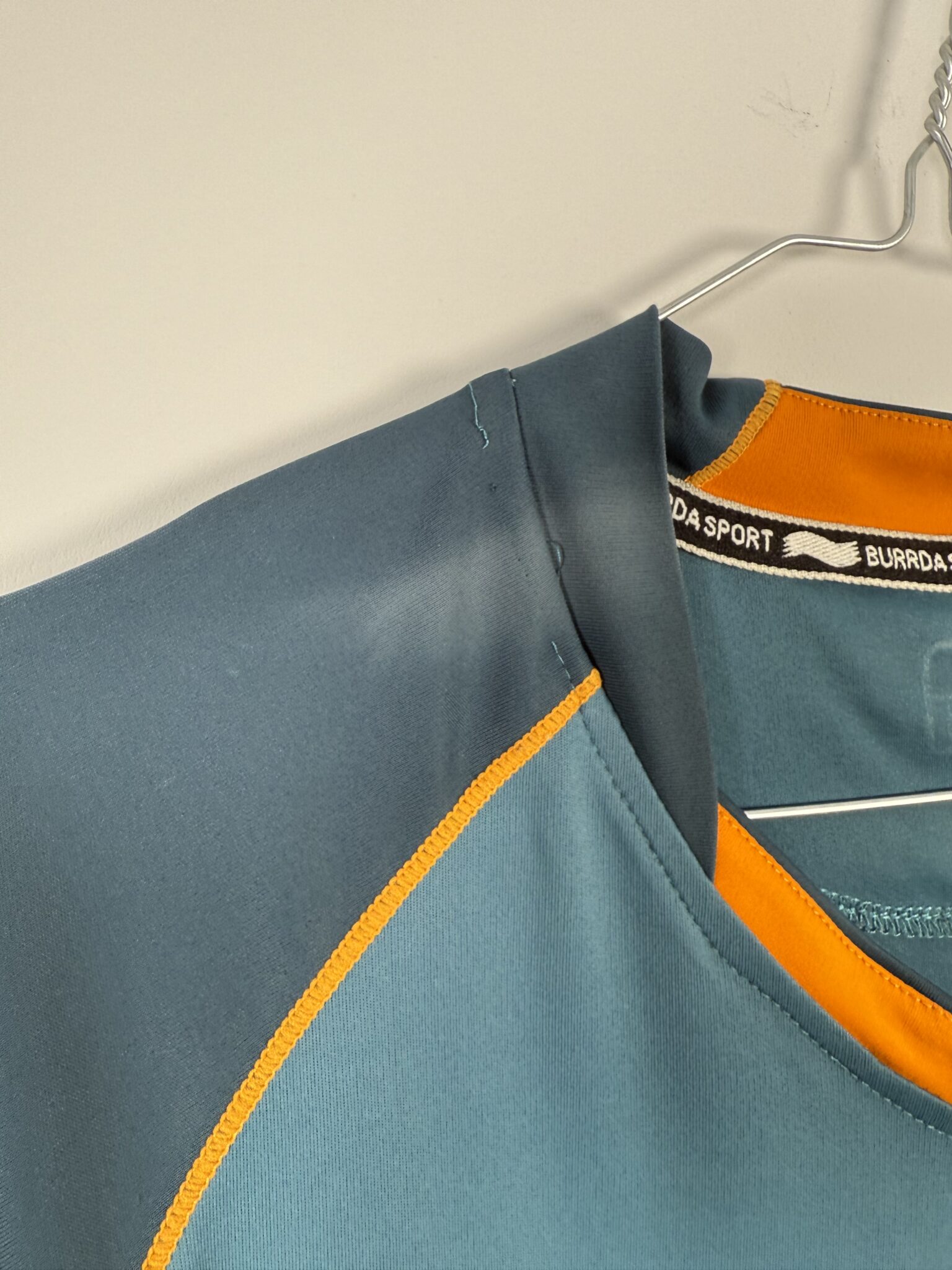 Stan: Dobry – przebarwiony materiał przy kołnierzu na froncie oraz popękane cyfry na plecach.