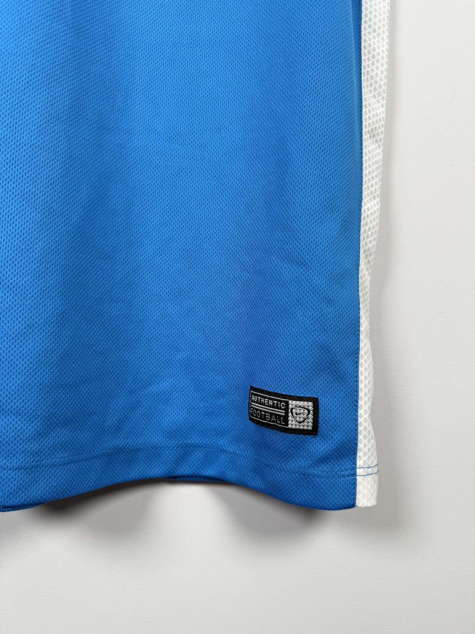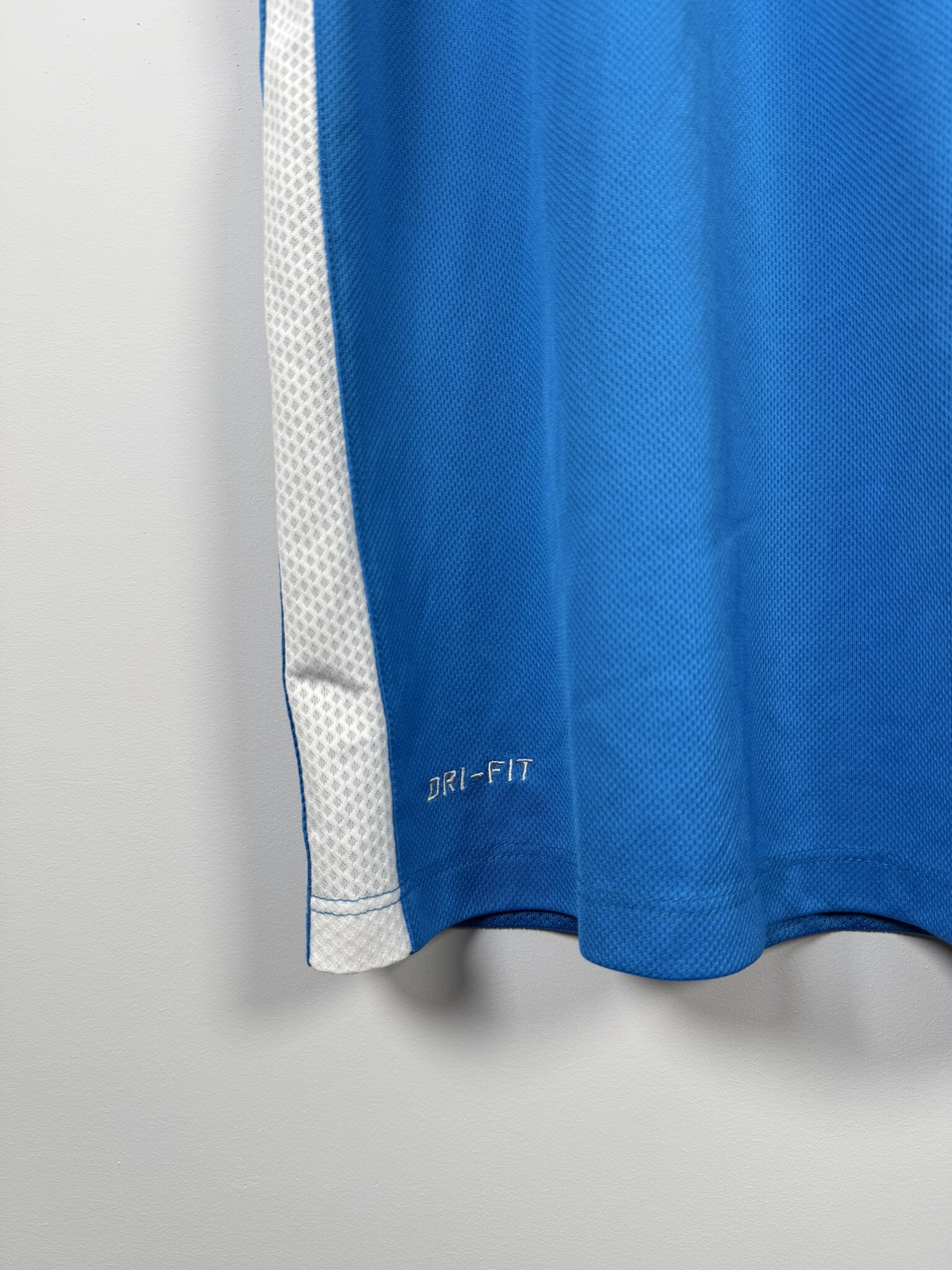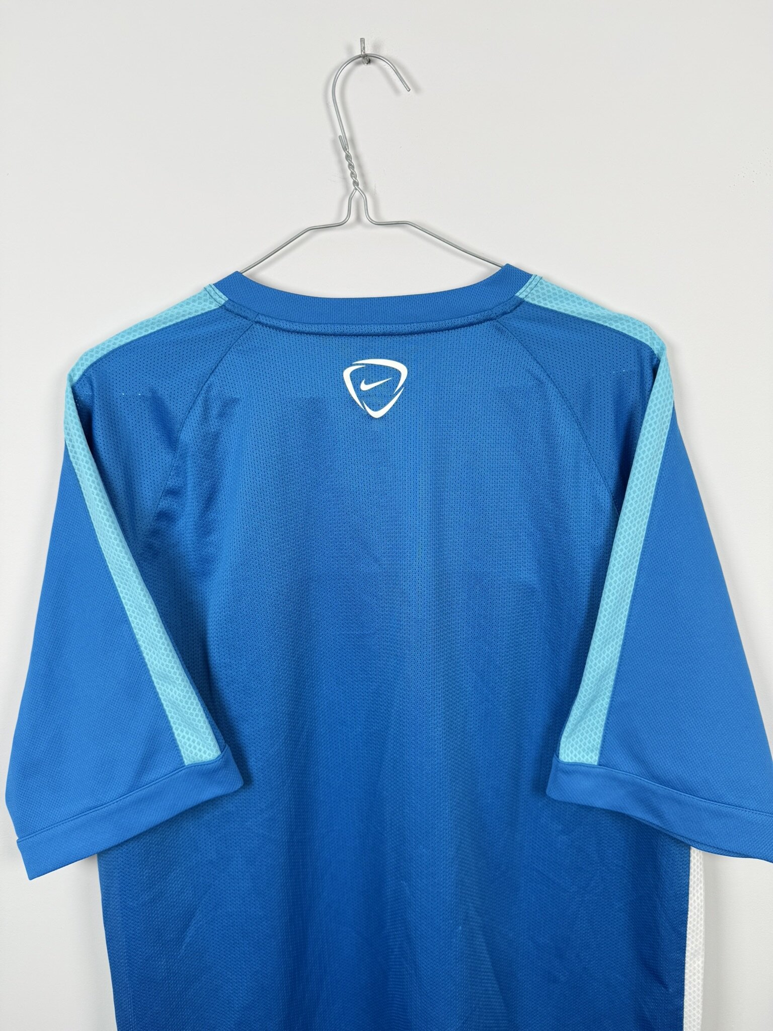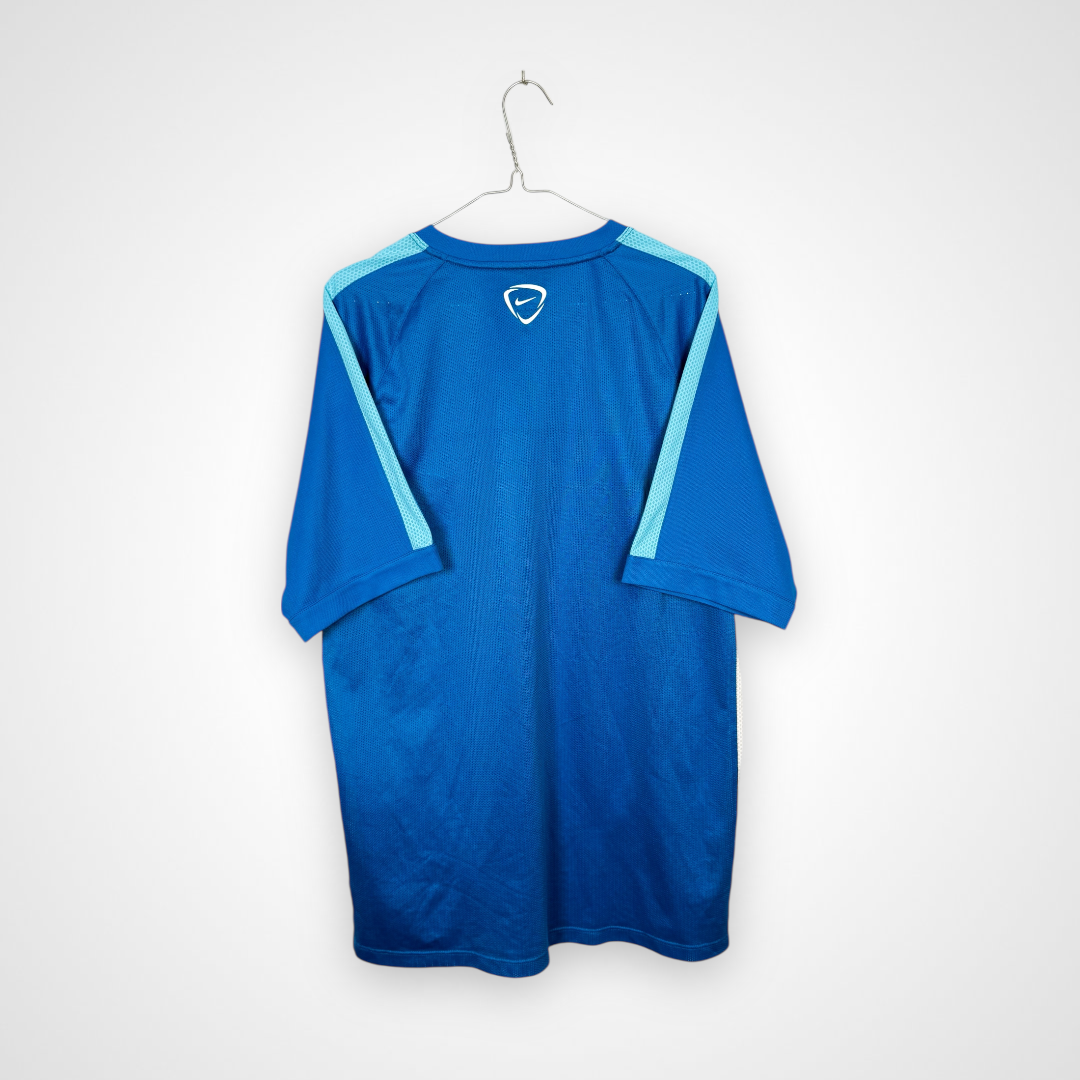 Ta oryginalna koszulka treningowa reprezentacji Francji z lat 2012–2014 to oficjalny model stworzony przez Nike, wyróżniający się efektownym turkusowym kolorem i minimalistycznym designem. Na piersi znajduje się herb FFF oraz logo Nike, a całość wykonana jest z lekkiego, oddychającego materiału z technologią Dri-FIT, zapewniającą wygodę podczas treningu i codziennego noszenia. Świetna propozycja dla fanów Les Bleus i kolekcjonerów nowoczesnej odzieży piłkarskiej.