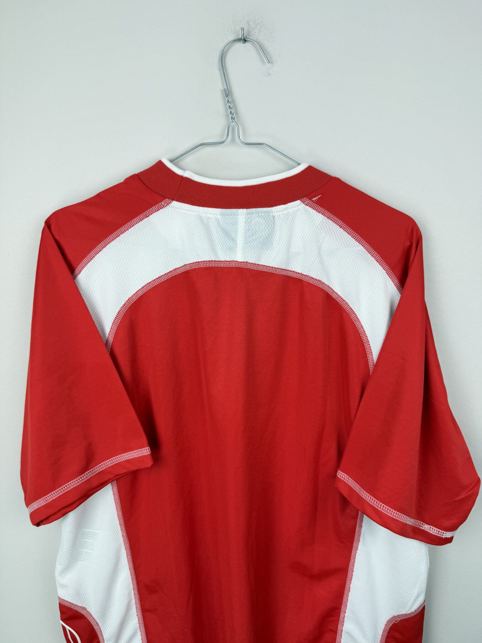 Ta oryginalna koszulka piłkarska Rot Weiss Oberhausen z sezonu 2002/03 to prawdziwa perełka z początków XXI wieku, która przenosi nas do czasów intensywnej rywalizacji w 2. Bundeslidze. Wykonana przez niemiecką firmę Uhlsport, domowa wersja stroju utrzymana jest w tradycyjnych barwach klubu – czerwieni z białymi akcentami – i charakteryzuje się klasycznym krojem oraz solidnym wykonaniem typowym dla tamtej epoki.
