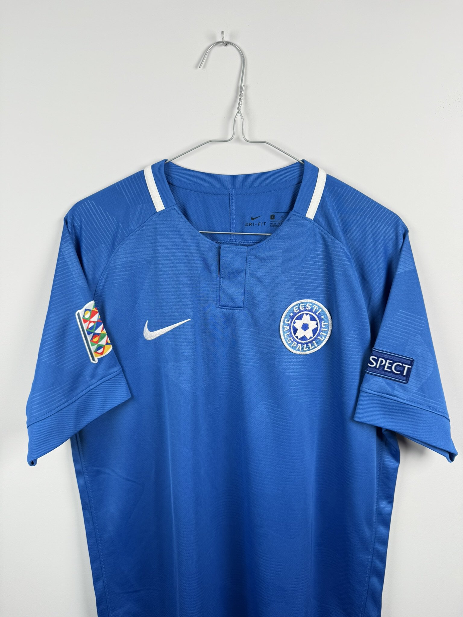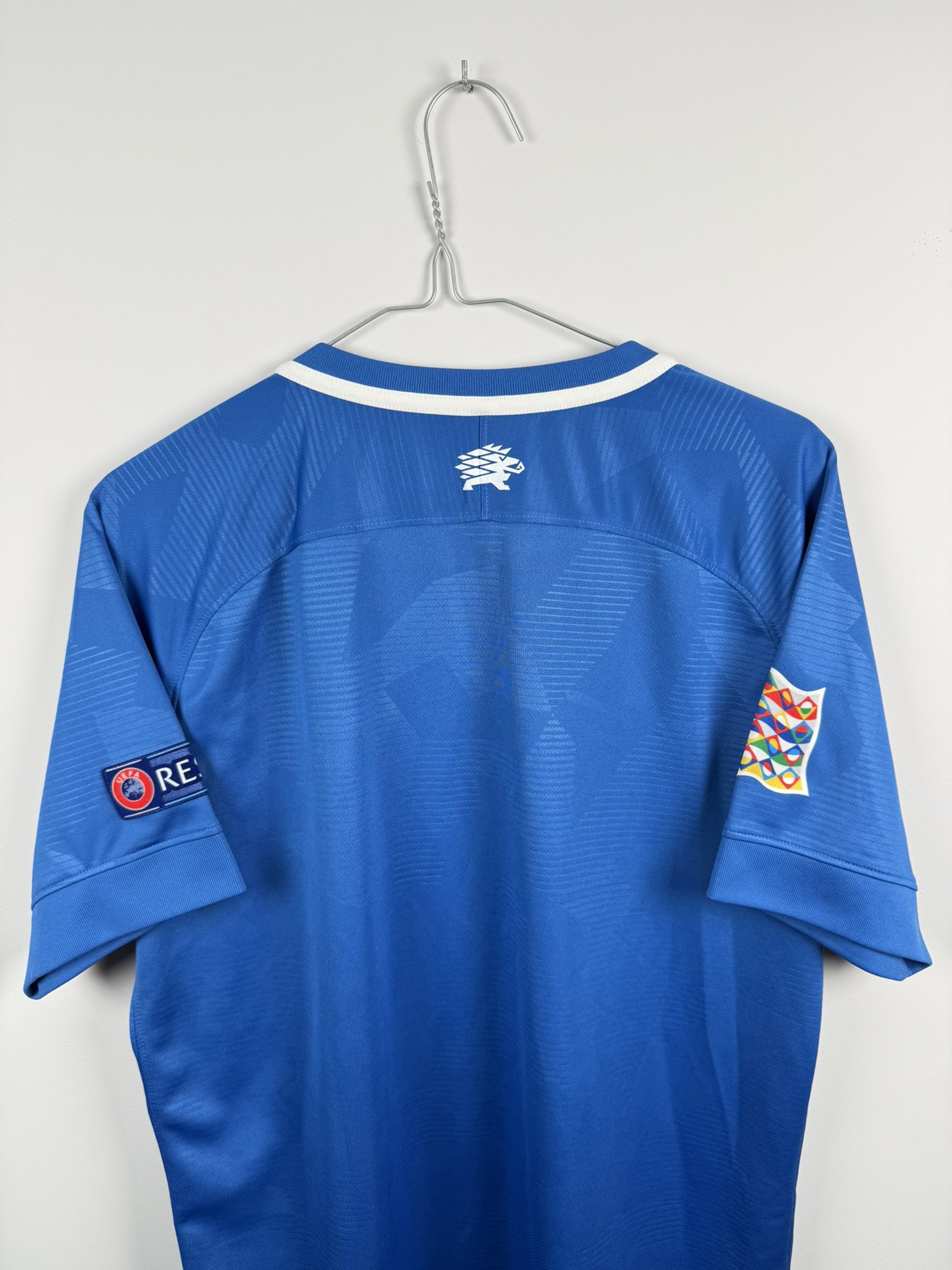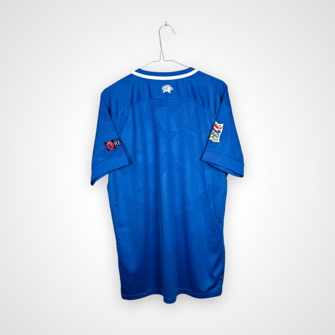 Niewątpliwie ciekawa propozycja dla fanów bałtyckiego futbolu i nieoczywistych koszulek. Oryginalna domowa koszulka piłkarska reprezentacji Estonii, w której występowali w latach 2018-21, ten ezgemplarz posiada emblematy rozgrywek Ligi Narodów na rękawkach, co czyni go jeszcze bardziej unikatowym.