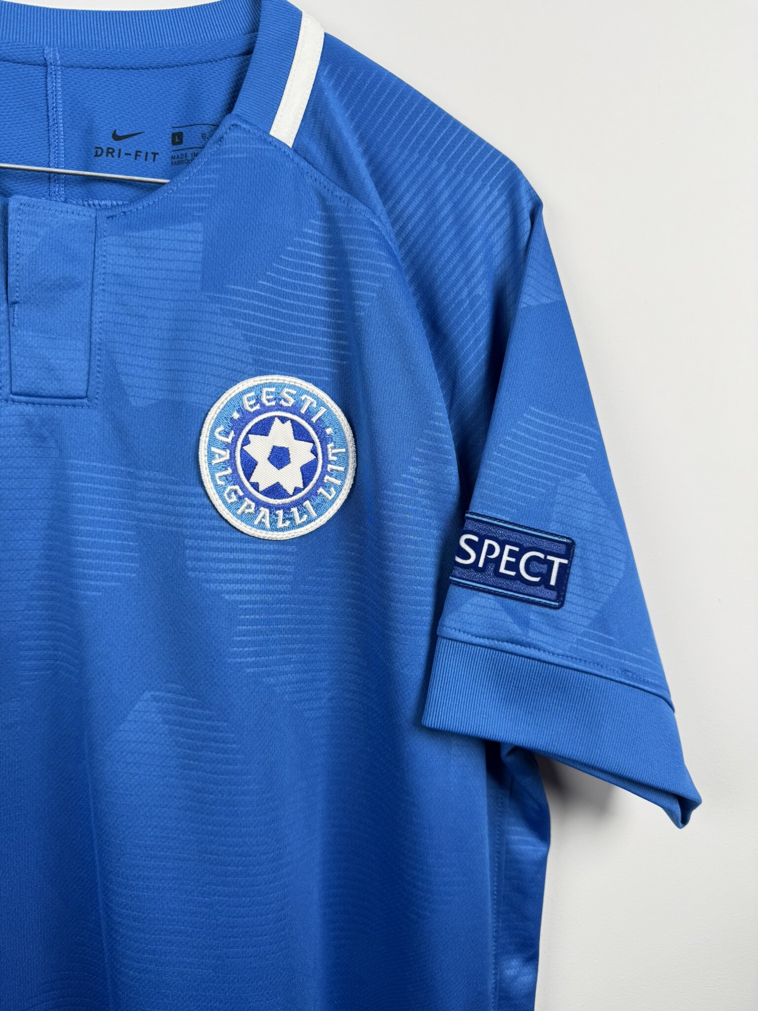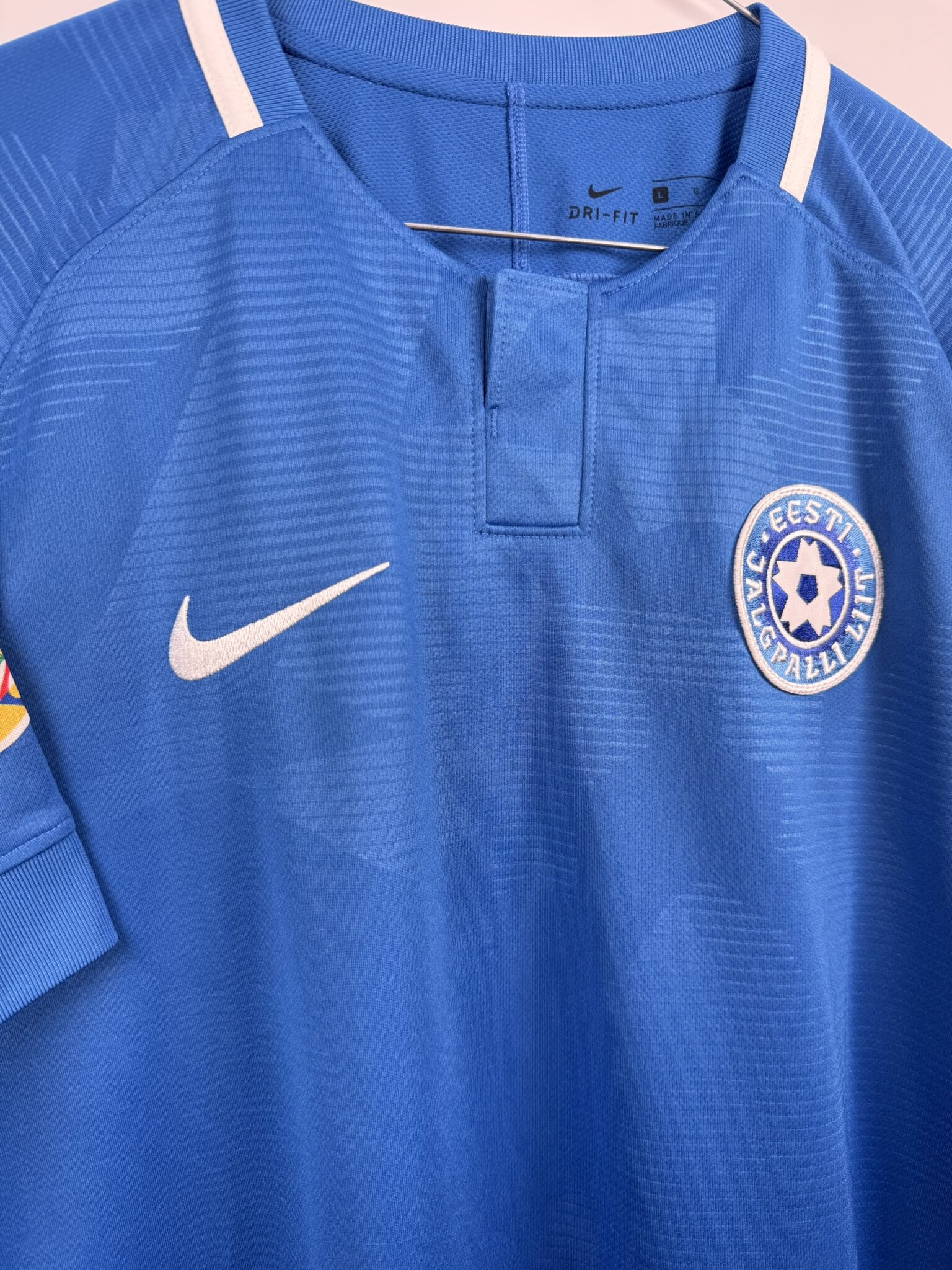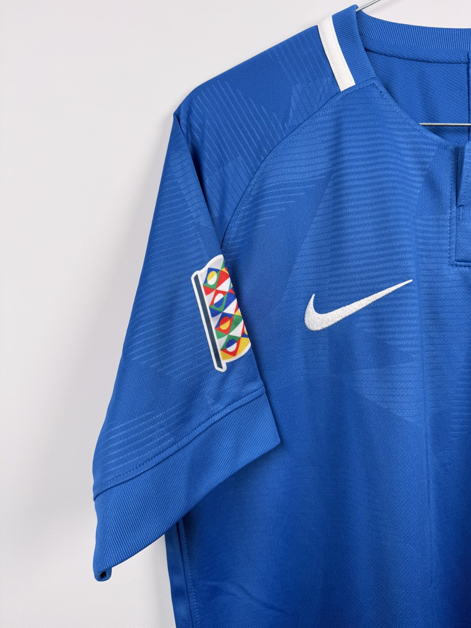 Niewątpliwie ciekawa propozycja dla fanów bałtyckiego futbolu i nieoczywistych koszulek. Oryginalna domowa koszulka piłkarska reprezentacji Estonii, w której występowali w latach 2018-21, ten ezgemplarz posiada emblematy rozgrywek Ligi Narodów na rękawkach, co czyni go jeszcze bardziej unikatowym.