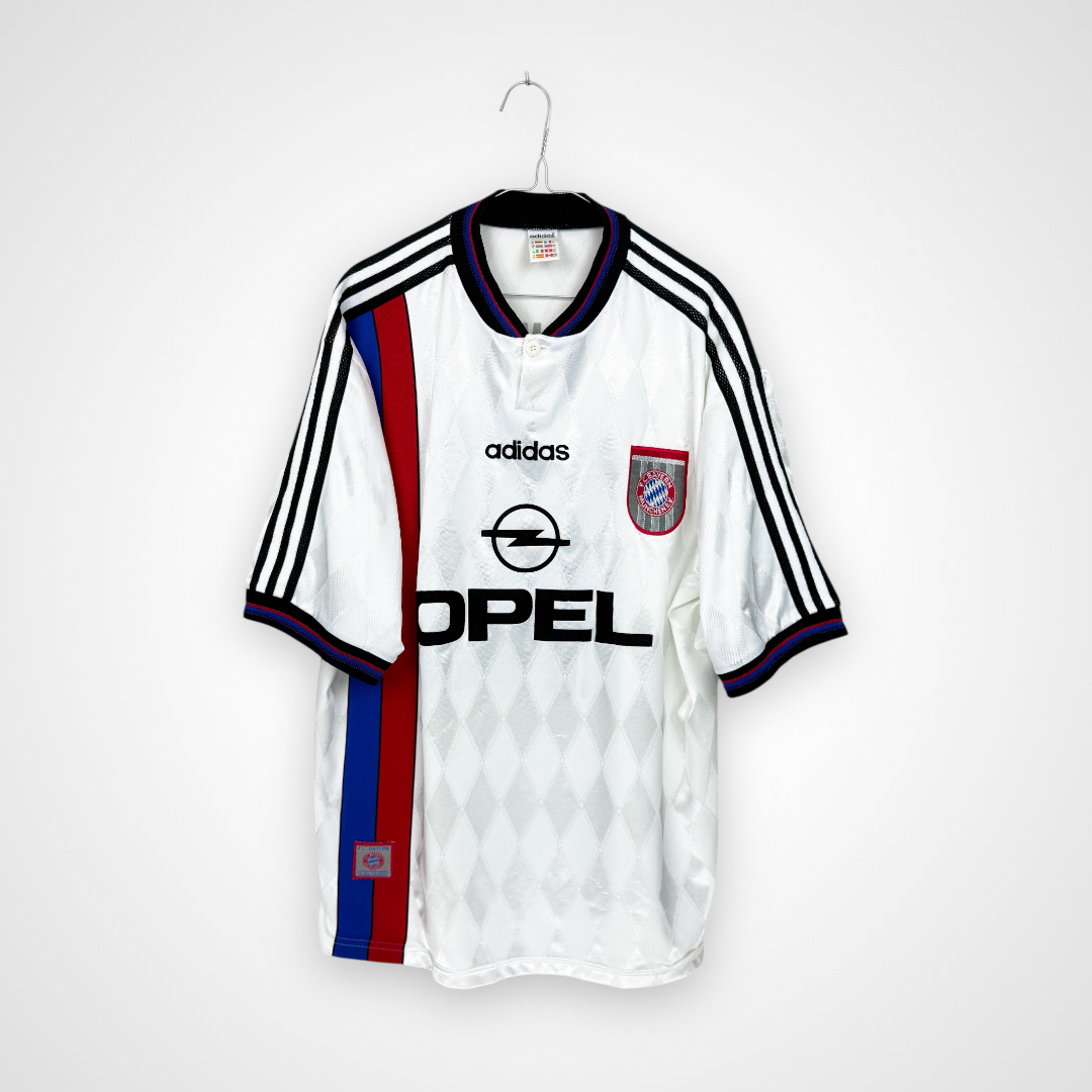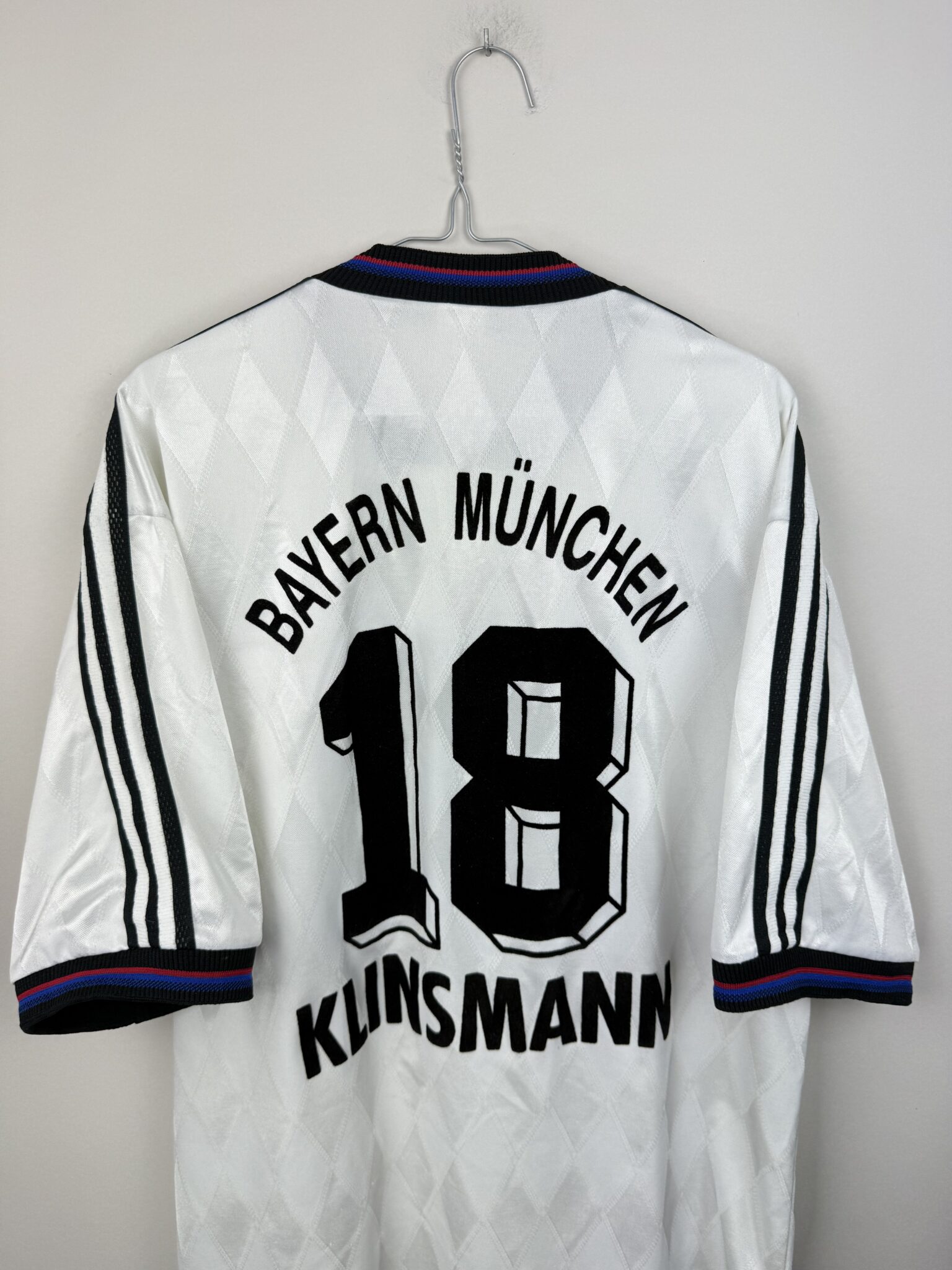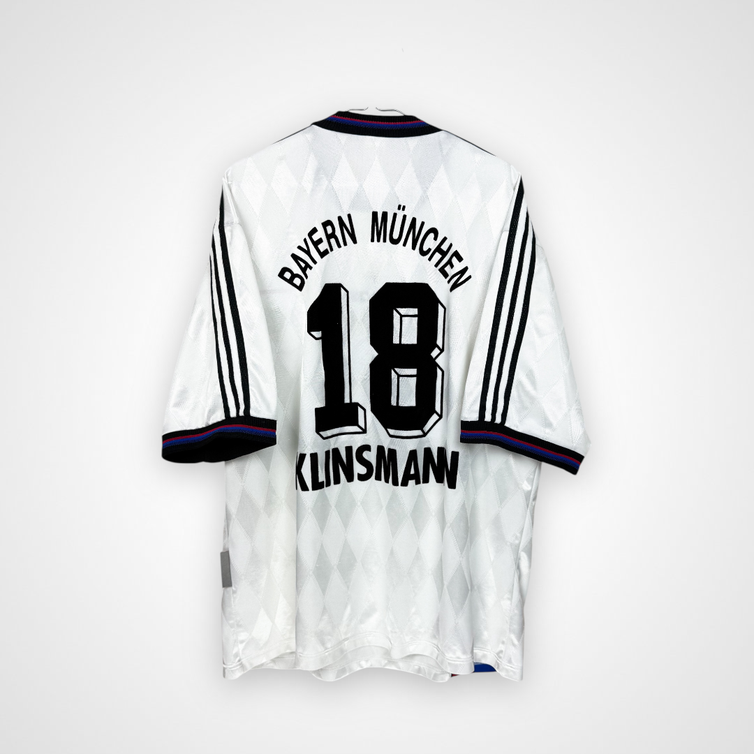 Oryginalna wyjazdowa koszulka piłkarska Bayernu Monachium – Adidas 1995-97 z nadrukiem Jürgena Klinsmanna.