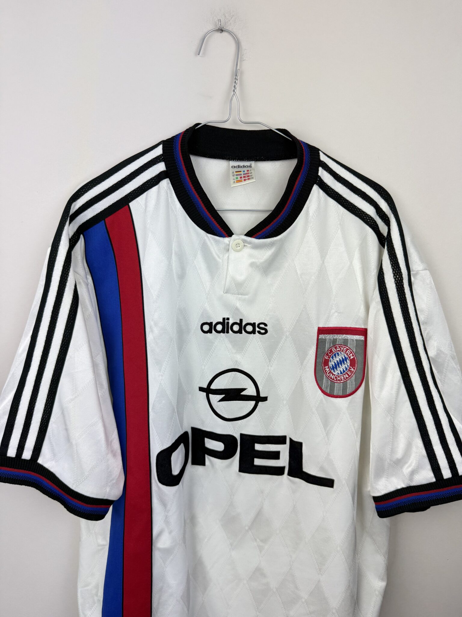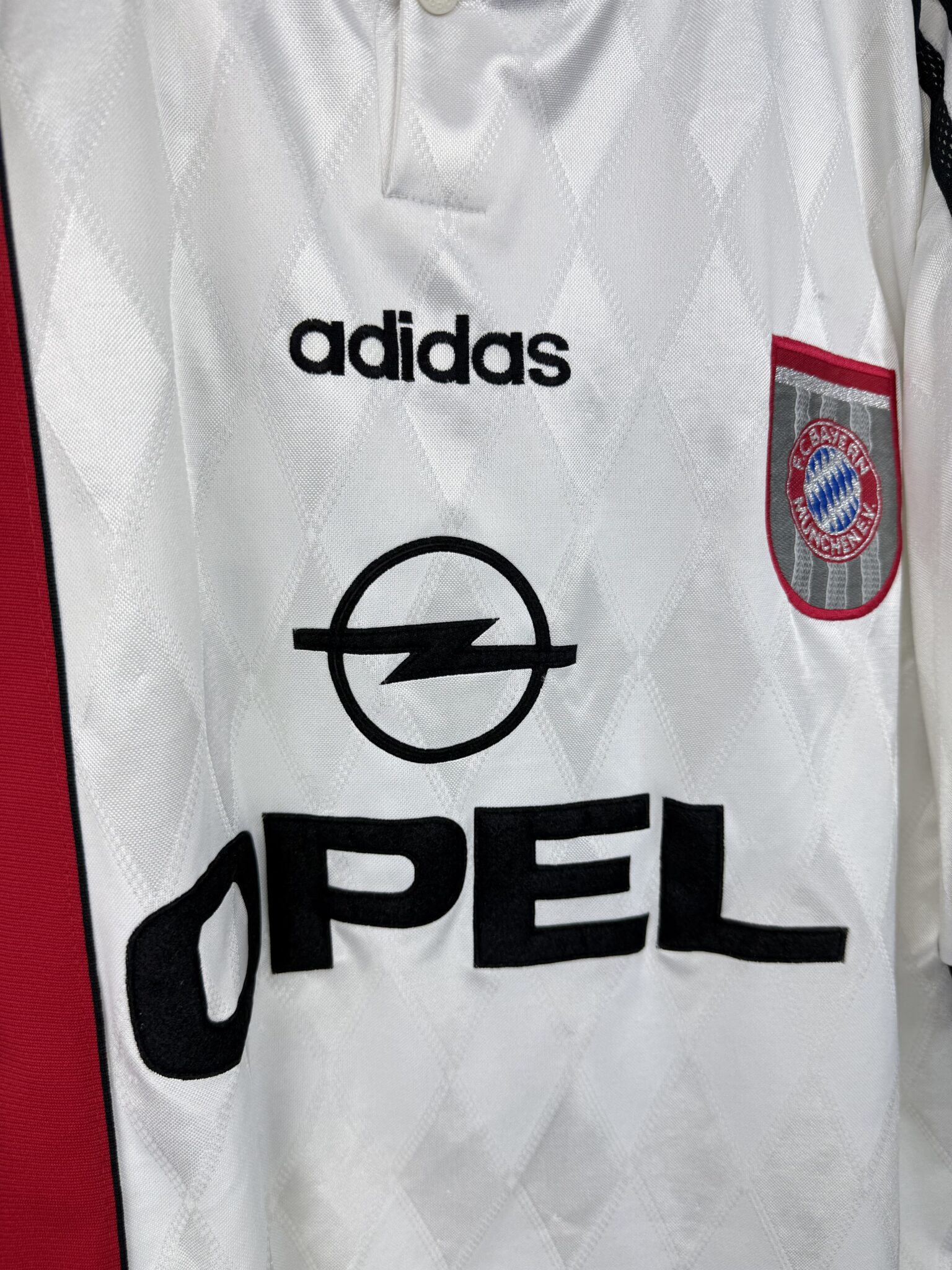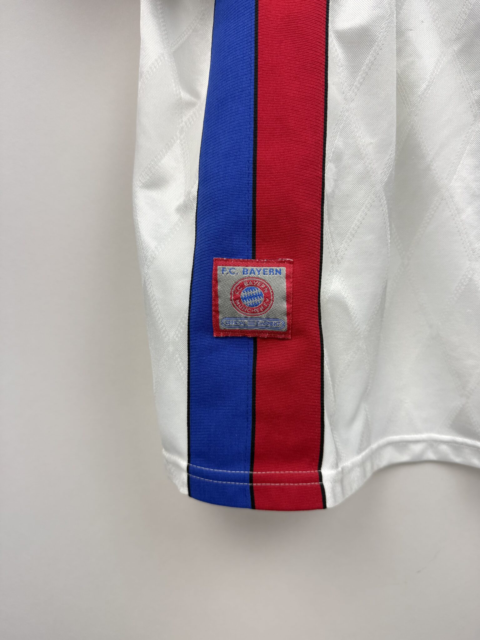 Oryginalna wyjazdowa koszulka piłkarska Bayernu Monachium – Adidas 1995-97 z nadrukiem Jürgena Klinsmanna.