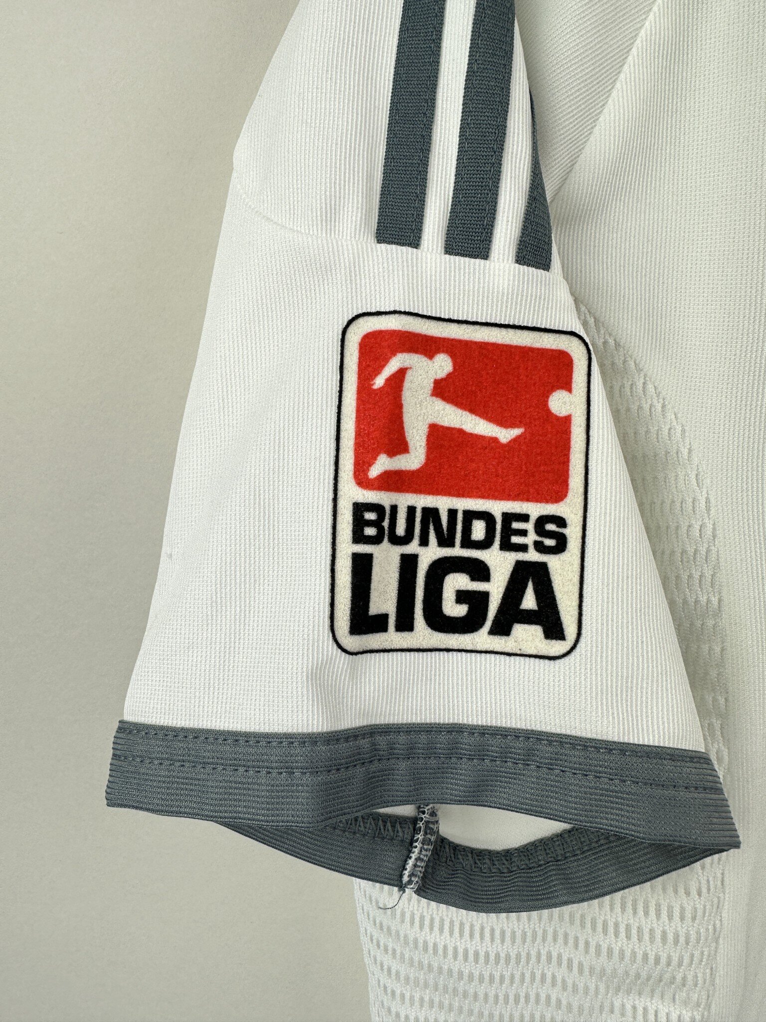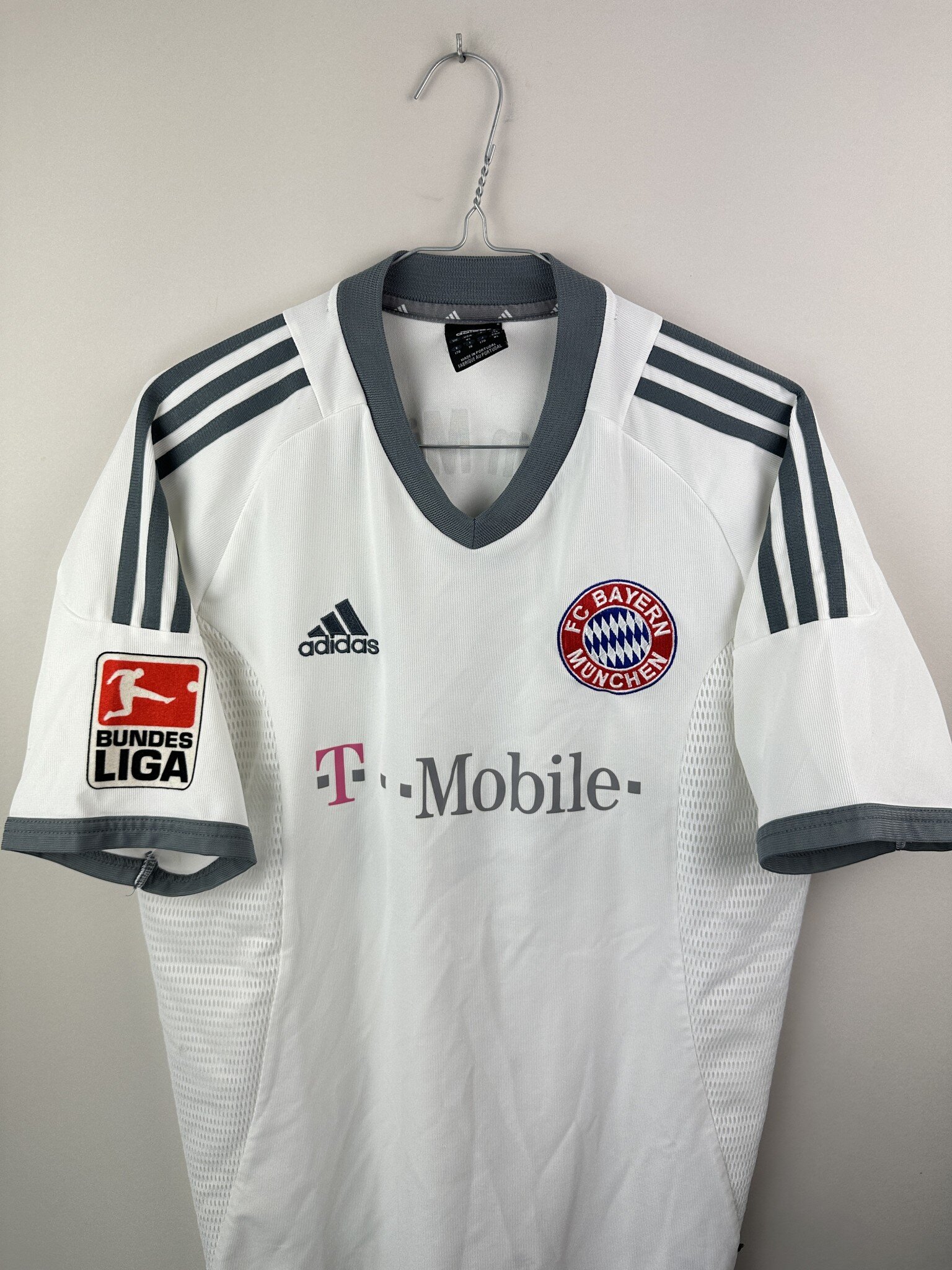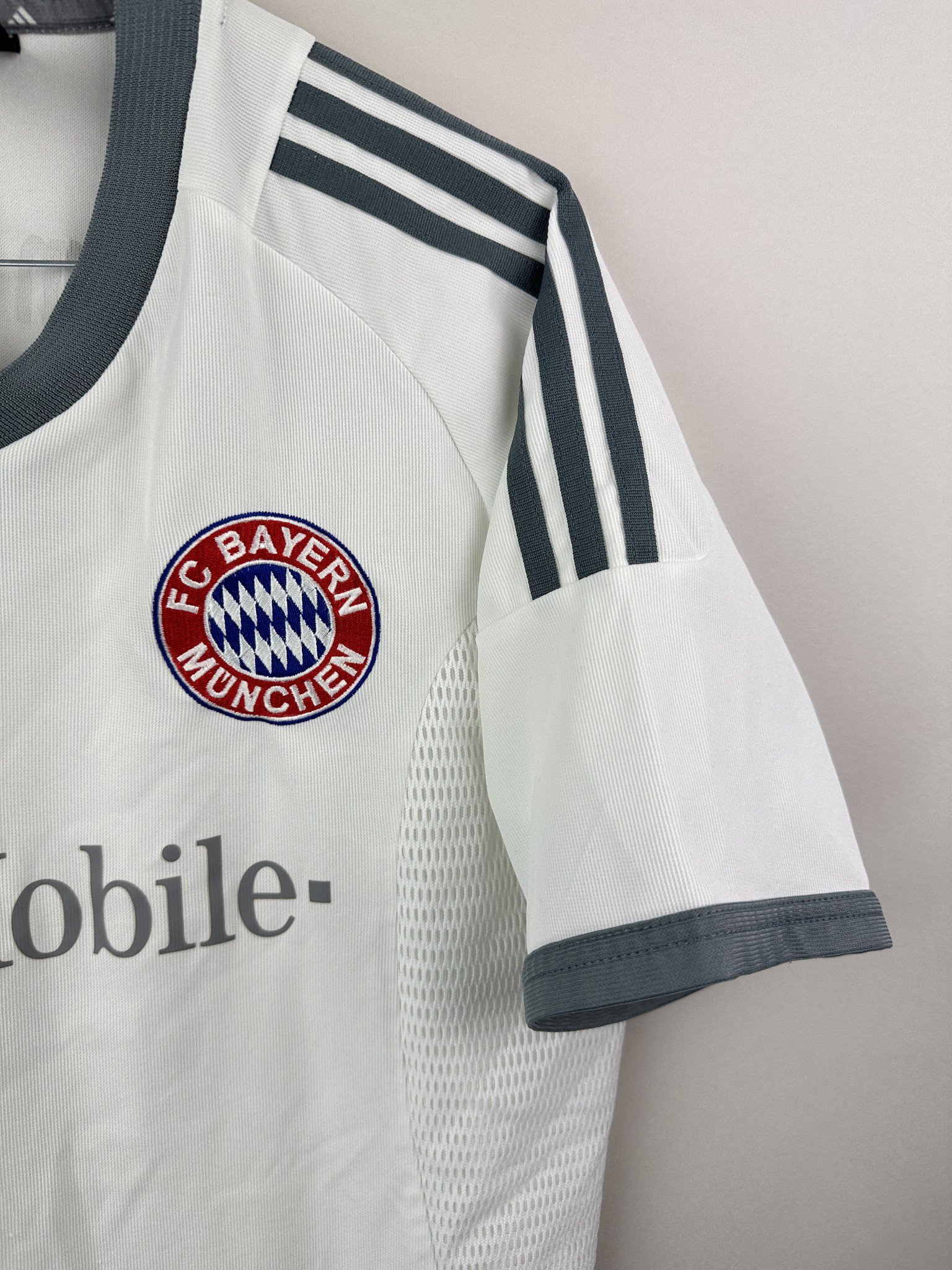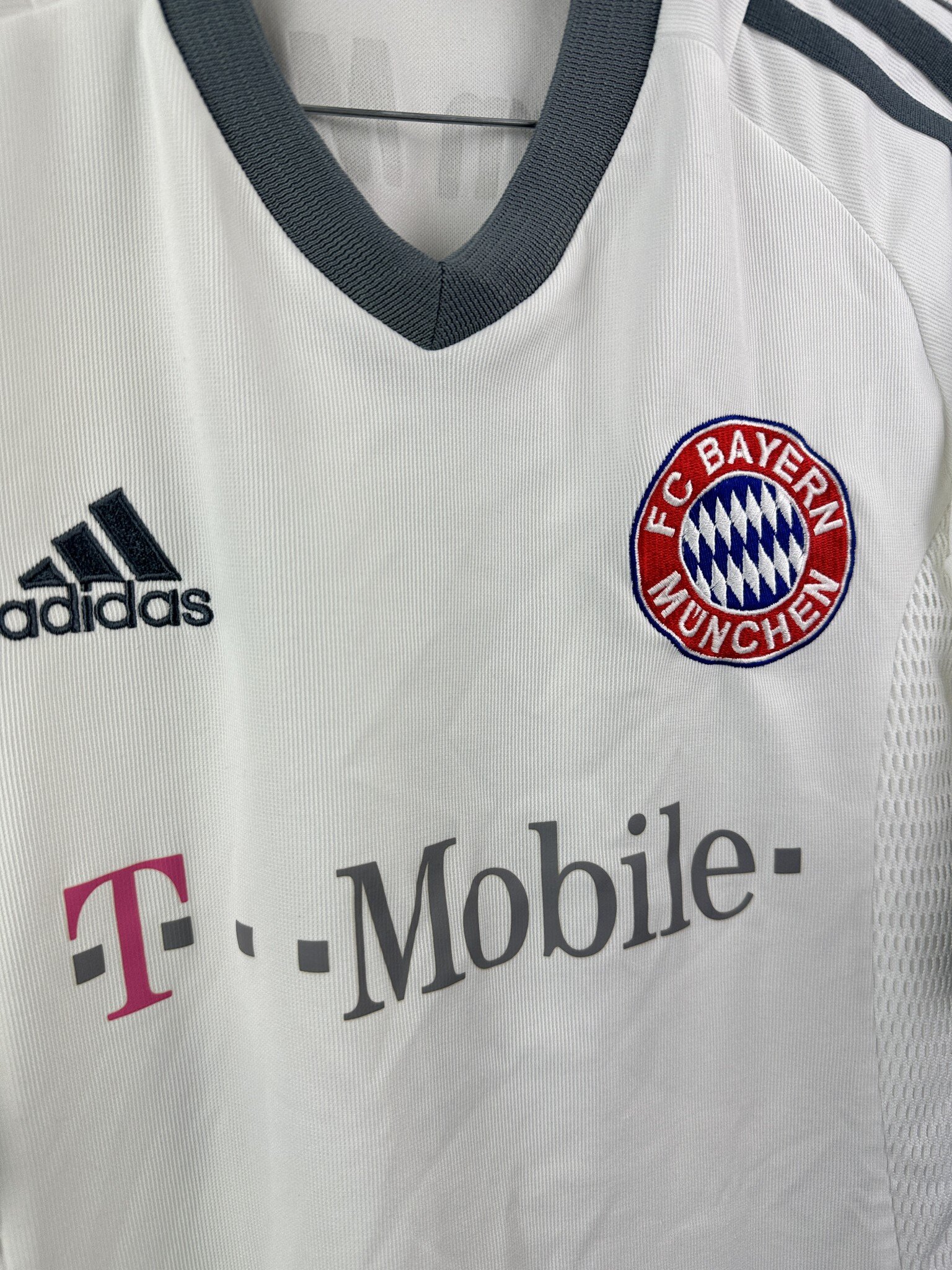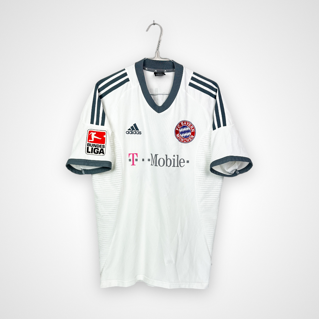 Na piersi znajduje się haftowany herb Bayernu Monachium, logo Adidas oraz sponsor główny – T-Mobile, którego logo pojawiło się na koszulkach Bayernu właśnie od sezonu 2002/03, zastępując długoletniego sponsora Opel. Trzy paski Adidasa w kontrastującym kolorze biegną wzdłuż ramion, podkreślając dynamiczną linię koszulki.