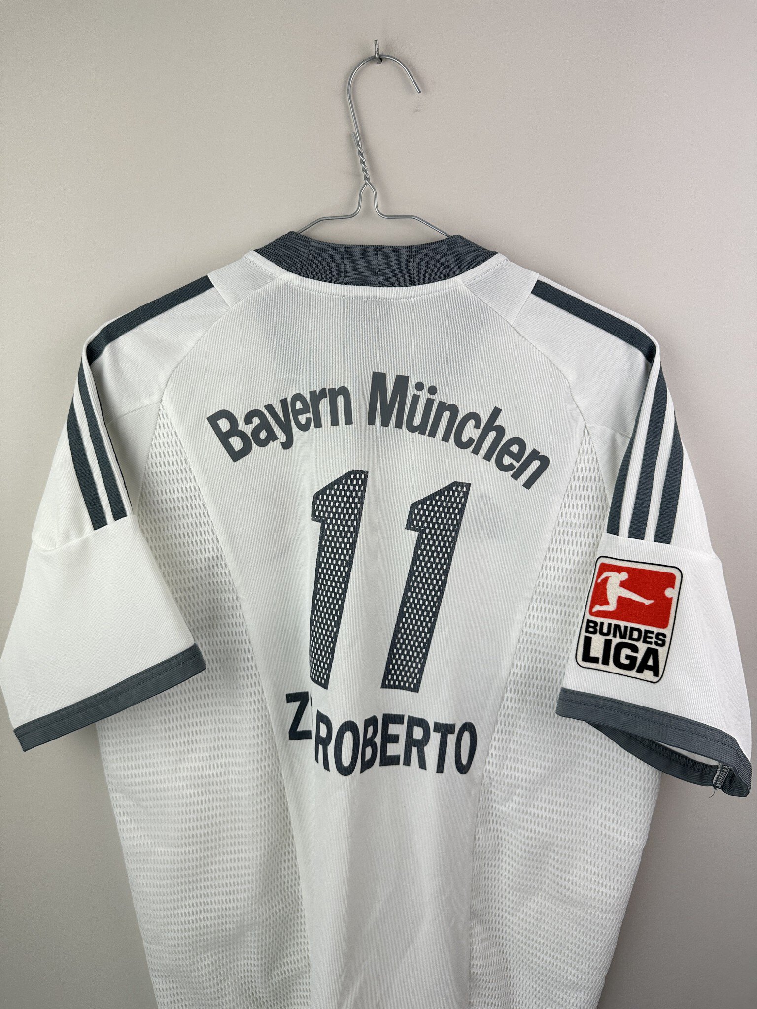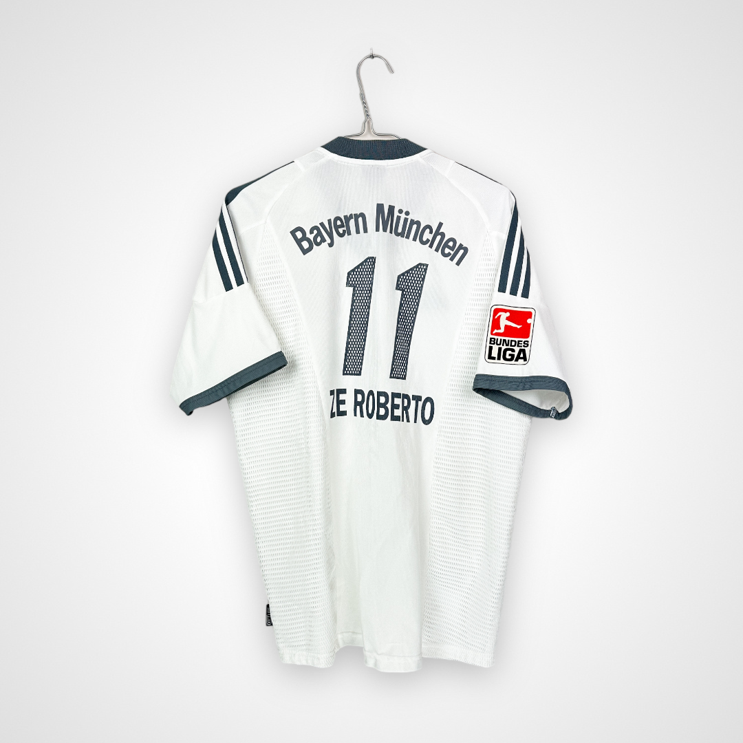 Oryginalna koszulka piłkarska Bayernu Monachium z sezonów 2002–2004 w wersji wyjazdowej z nazwiskiem Zé Roberto – produkcji Adidas.