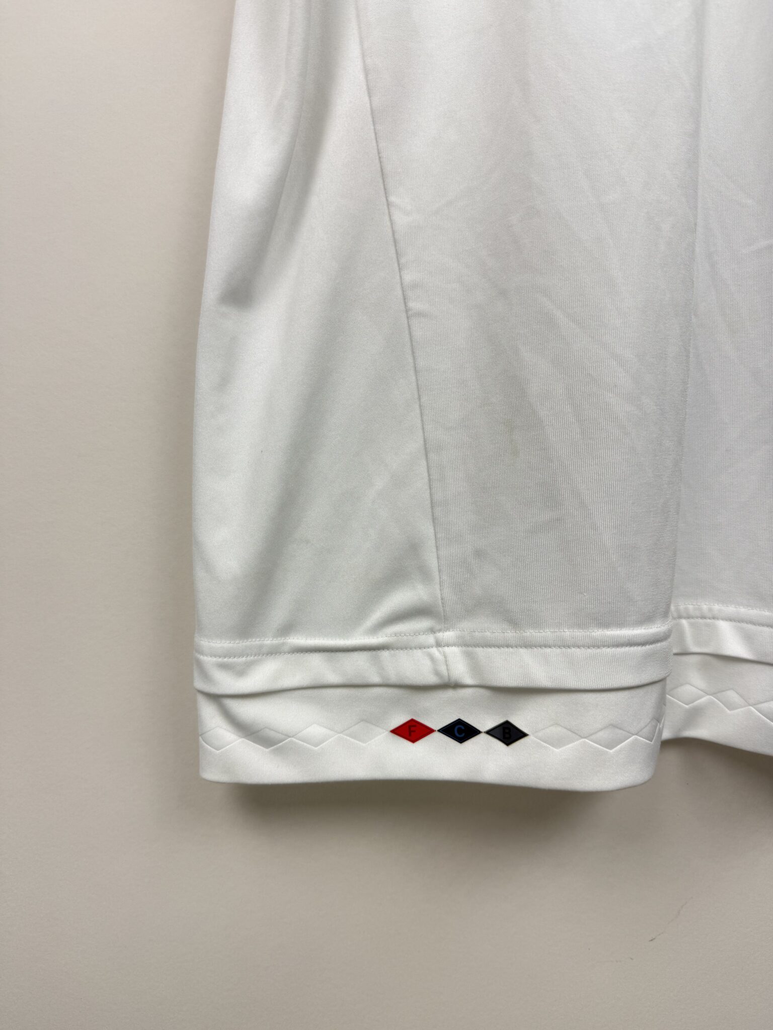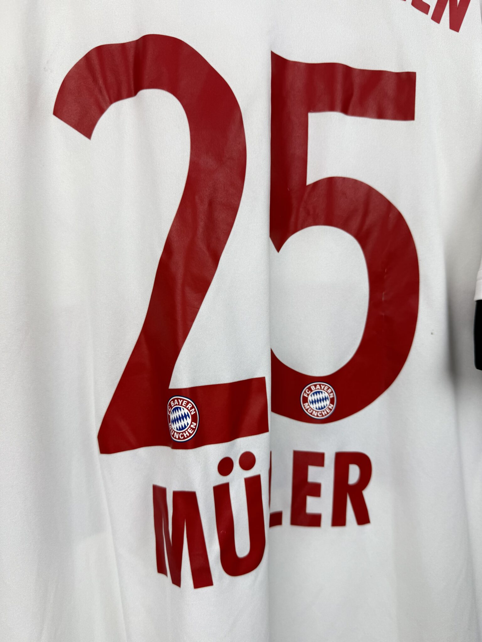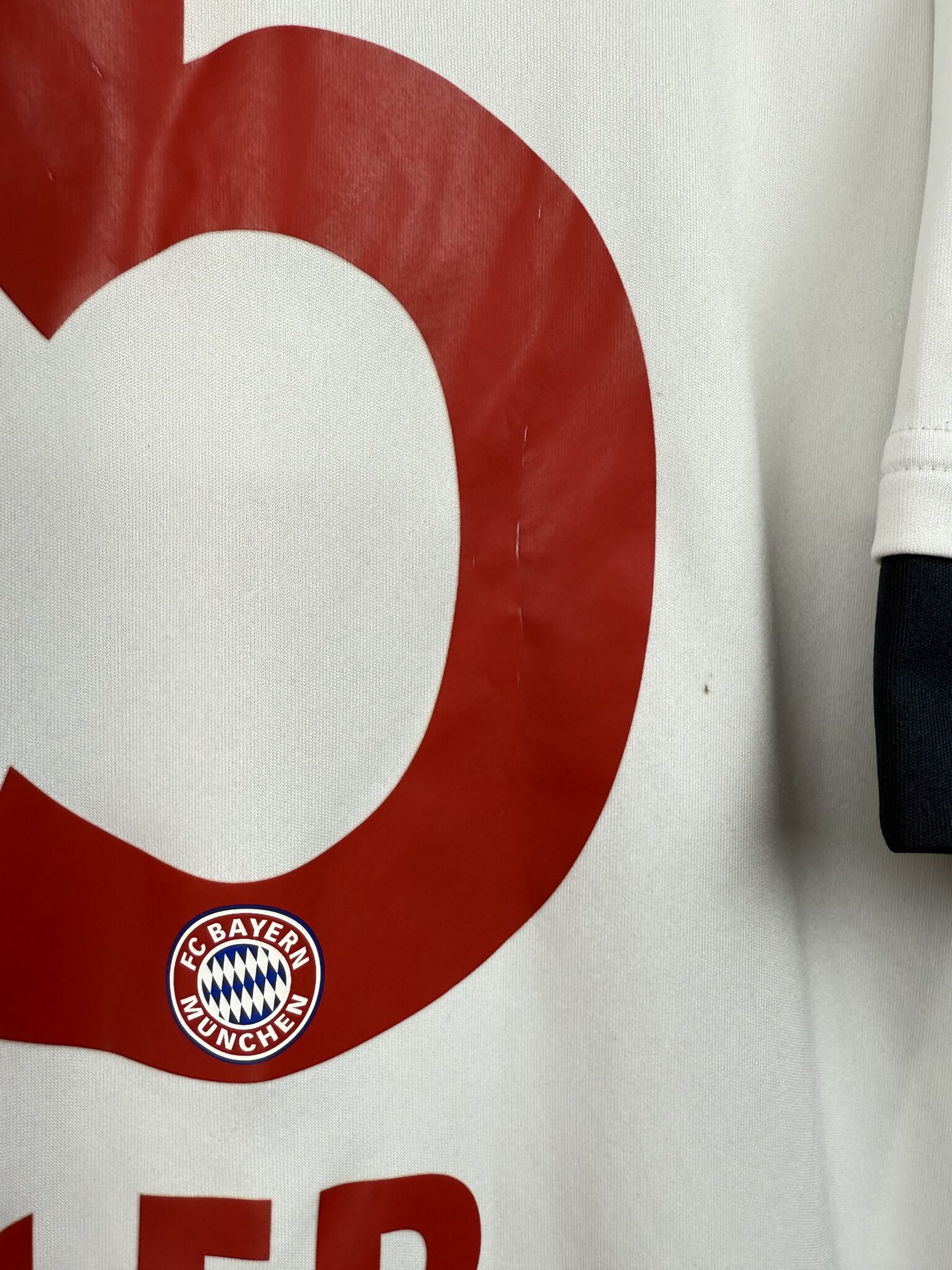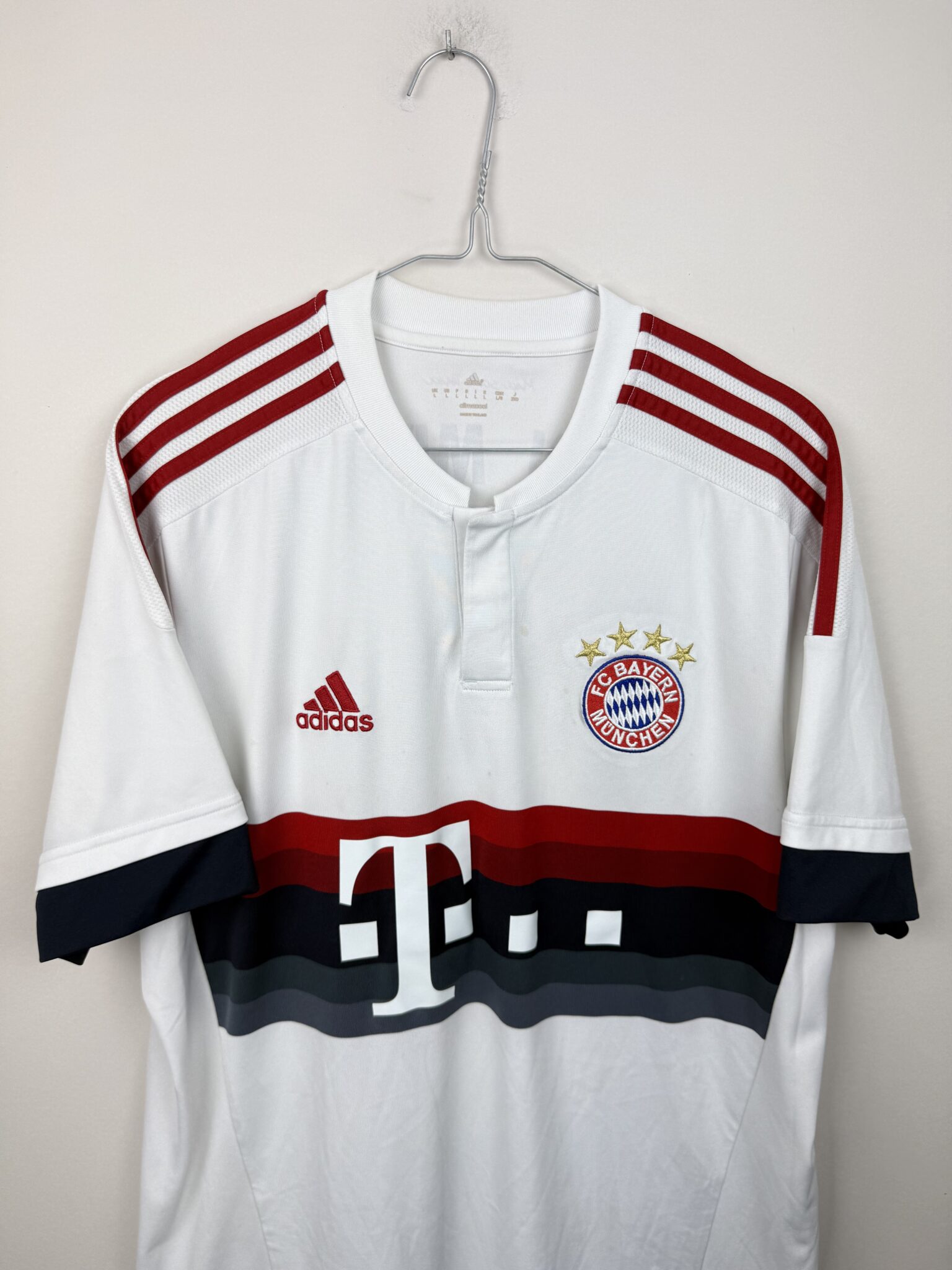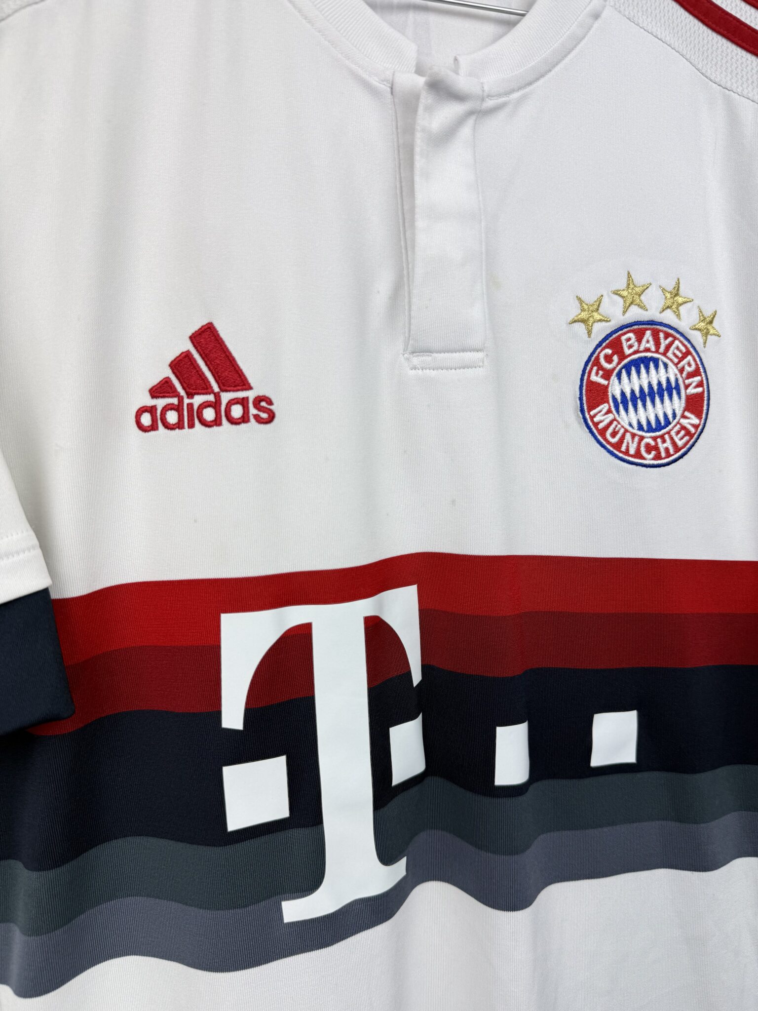 Przedstawiamy oryginalną wyjazdową koszulkę piłkarską Bayernu Monachium z sezonu 2015/16, wyprodukowaną przez Adidas, z oficjalnym nadrukiem jednego z największych symboli bawarskiego klubu – Thomasa Müllera. Model ten wyróżnia się elegancką, białą bazą z charakterystycznymi szarymi panelami na piersi i klasycznymi trzema paskami w kolorze czerwonym na ramionach. Subtelne bordowe akcenty na mankietach dodają koszulce prestiżu i nawiązują do tradycyjnych barw Bayernu. Na froncie widnieje haftowany herb klubu oraz logo sponsora T-Mobile, a z tyłu – oficjalny nadruk Müller 25, wykonany w oryginalnej klubowej czcionce.