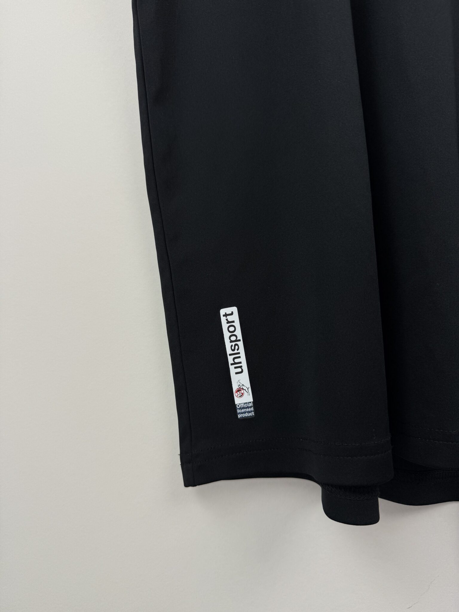 Ta oryginalna trzecia koszulka 1. FC Köln z sezonu 2021/22, wyprodukowana przez firmę Erima, to unikatowy model, który wyróżnia się eleganckim i nowoczesnym designem. Utrzymana w całkowicie czarnej kolorystyce, posiada subtelnie zaciemnione logotypy – herb klubu, znak sponsora REWE oraz logo producenta – co nadaje jej minimalistycznego i stylowego charakteru. Jedynym przełamaniem są delikatne akcenty w barwach klubowych – biel i czerwień – obecne na kołnierzyku i zakończeniach rękawów.