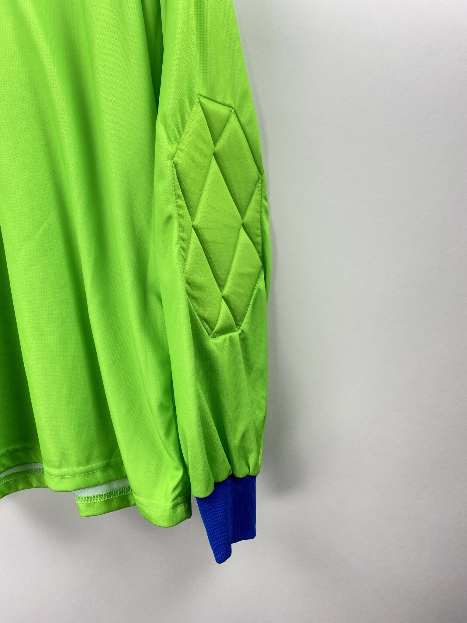 Ta wyjątkowa bramkarska koszulka Brighton & Hove Albion 2011–13 utrzymana jest w efektownym neonowo-zielonym kolorze, z charakterystycznymi niebieskimi akcentami na nadgarstkach i kołnierzyku, które nadają modelowi nowoczesny i dynamiczny wygląd. Na froncie koszulki znajduje się logo sponsora, podkreślające autentyczność stroju oraz profesjonalny charakter modelu.