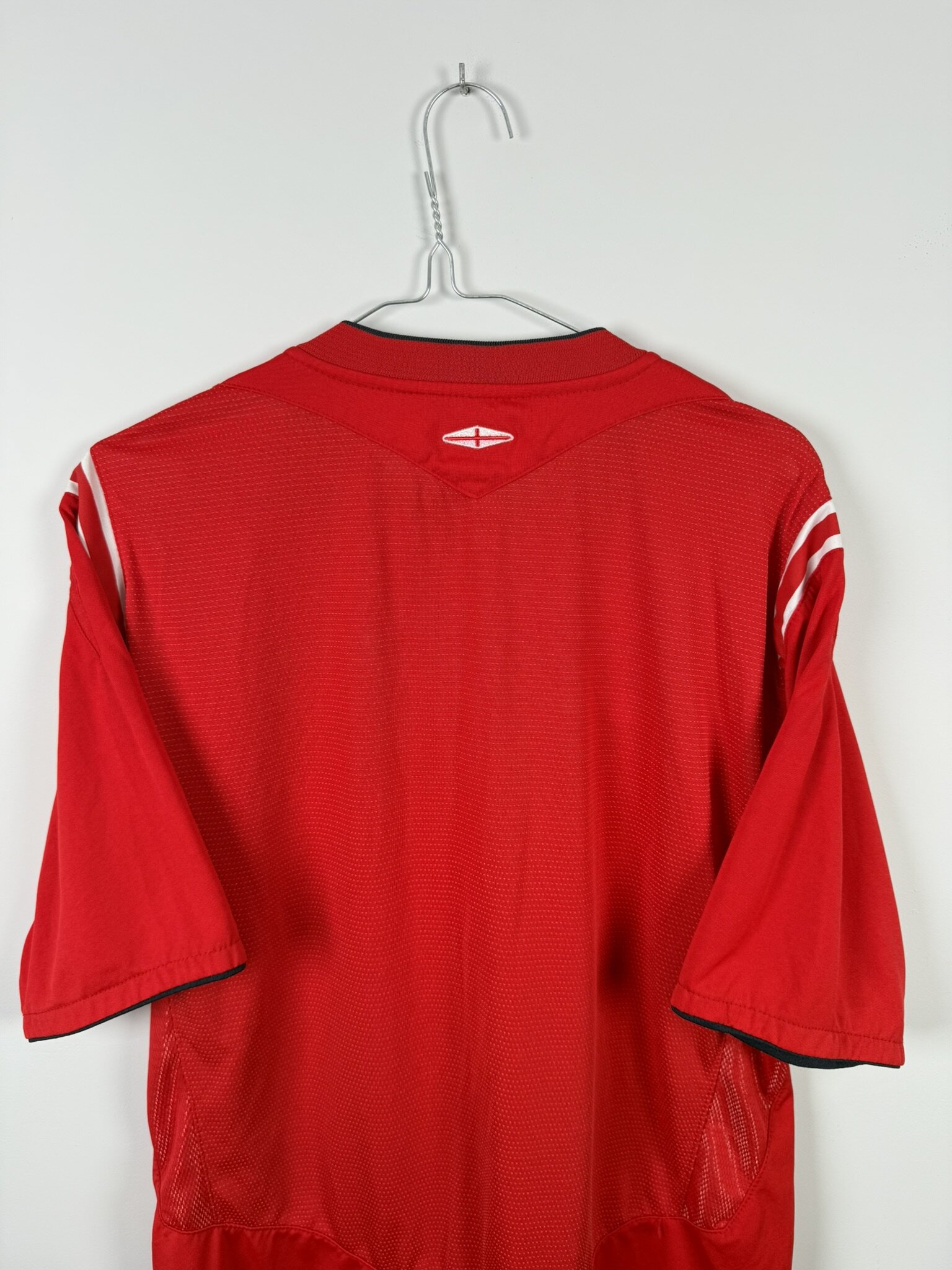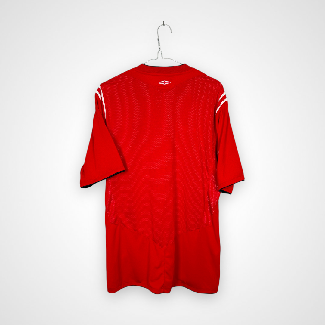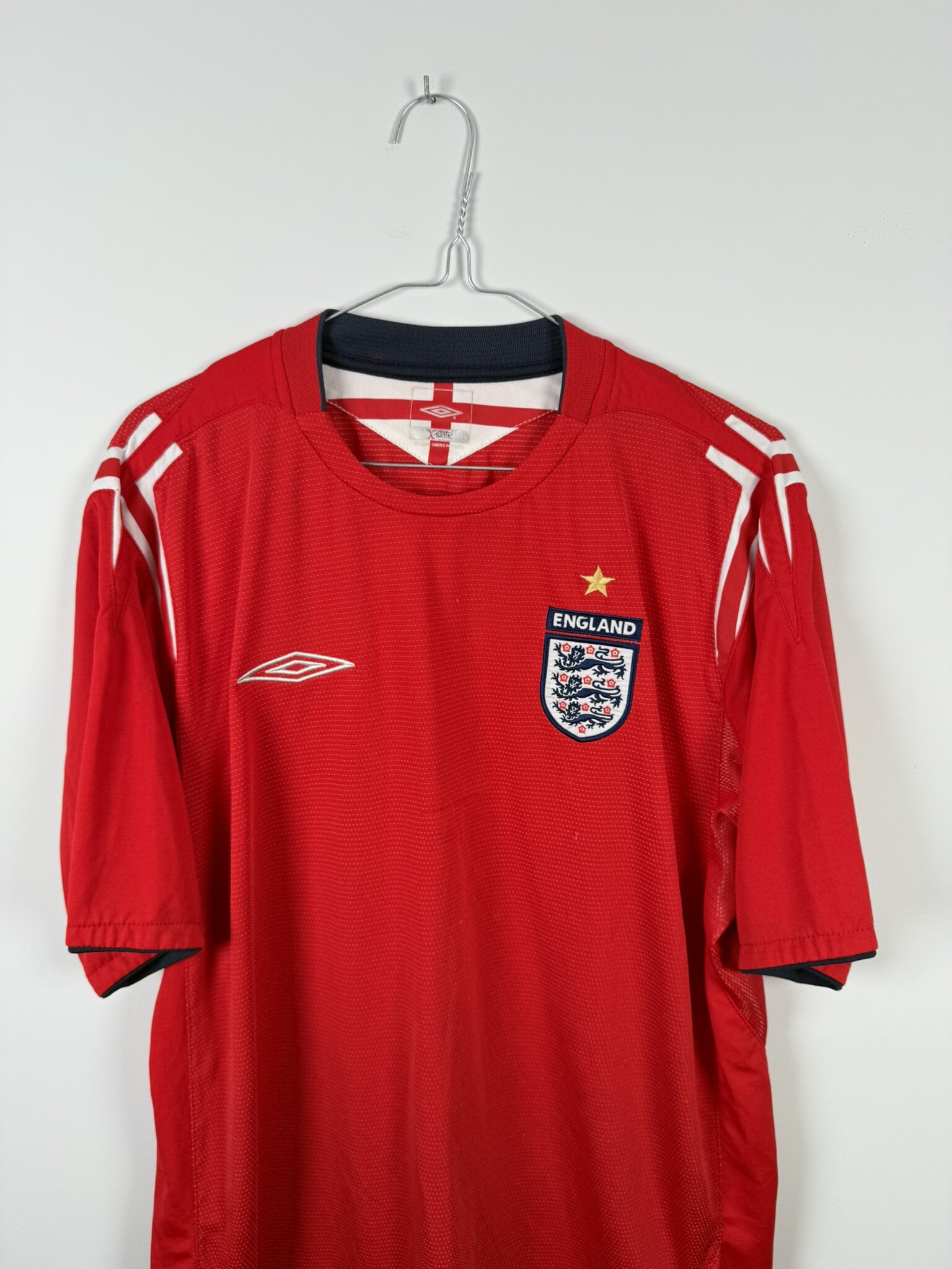 Czerwona koszulka piłkarska reprezentacji Anglii z lat 2004–2006. Model Umbro, w którym grali Beckham, Rooney, Gerrard i Lampard m.in. na Euro 2004.