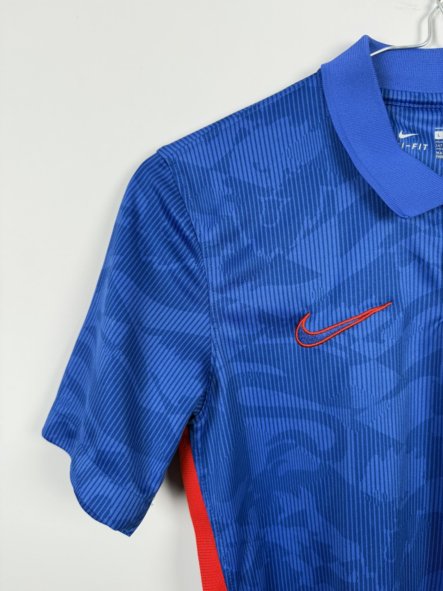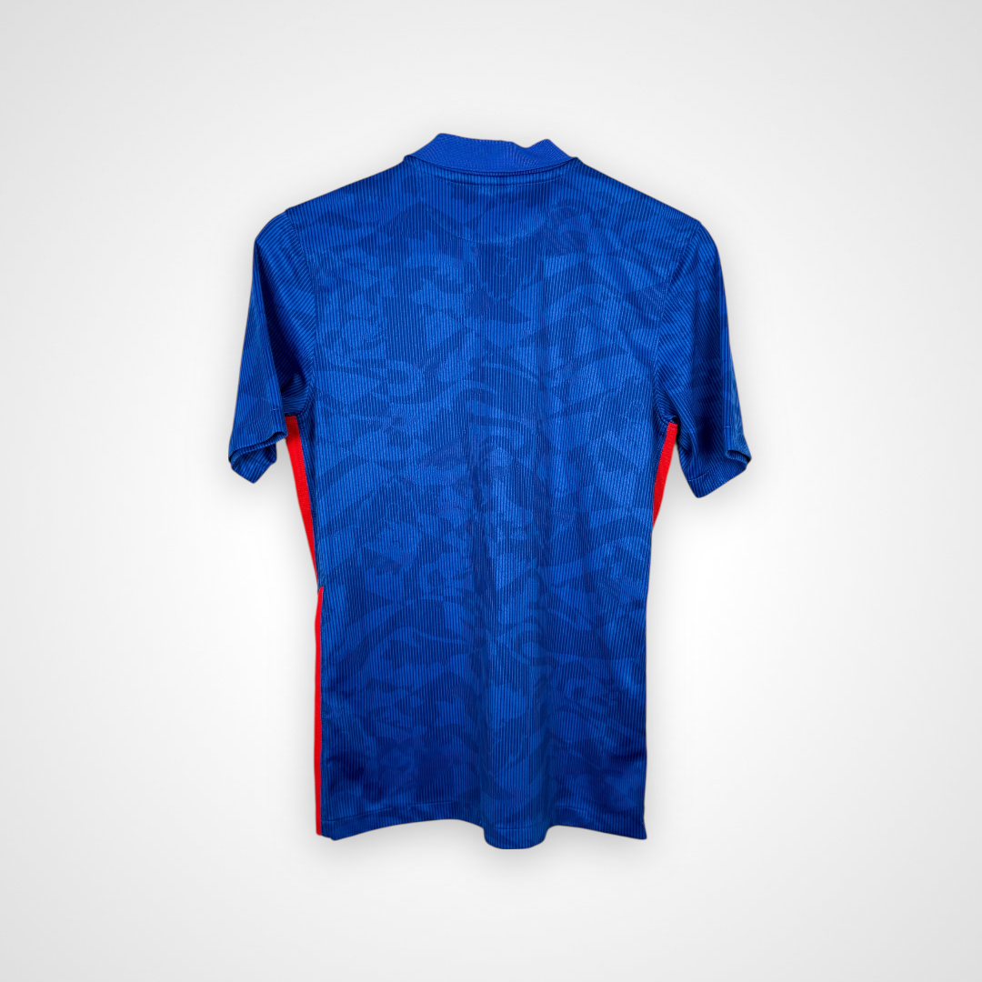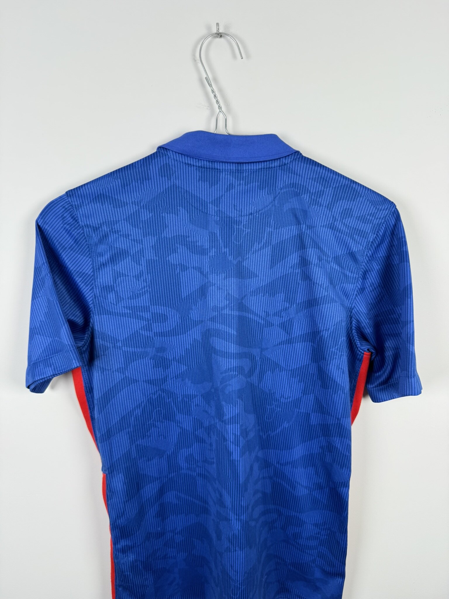 Ta oryginalna wyjazdowa koszulka reprezentacji Anglii z lat 2020–2022 została zaprojektowana przez markę Nike i przygotowana w wersji juniorskiej na wzrost 158 cm. Utrzymana w efektownej niebieskiej kolorystyce, wyróżnia się nowoczesnym designem z delikatnym wzorem na materiale, co nadaje jej dynamicznego charakteru.