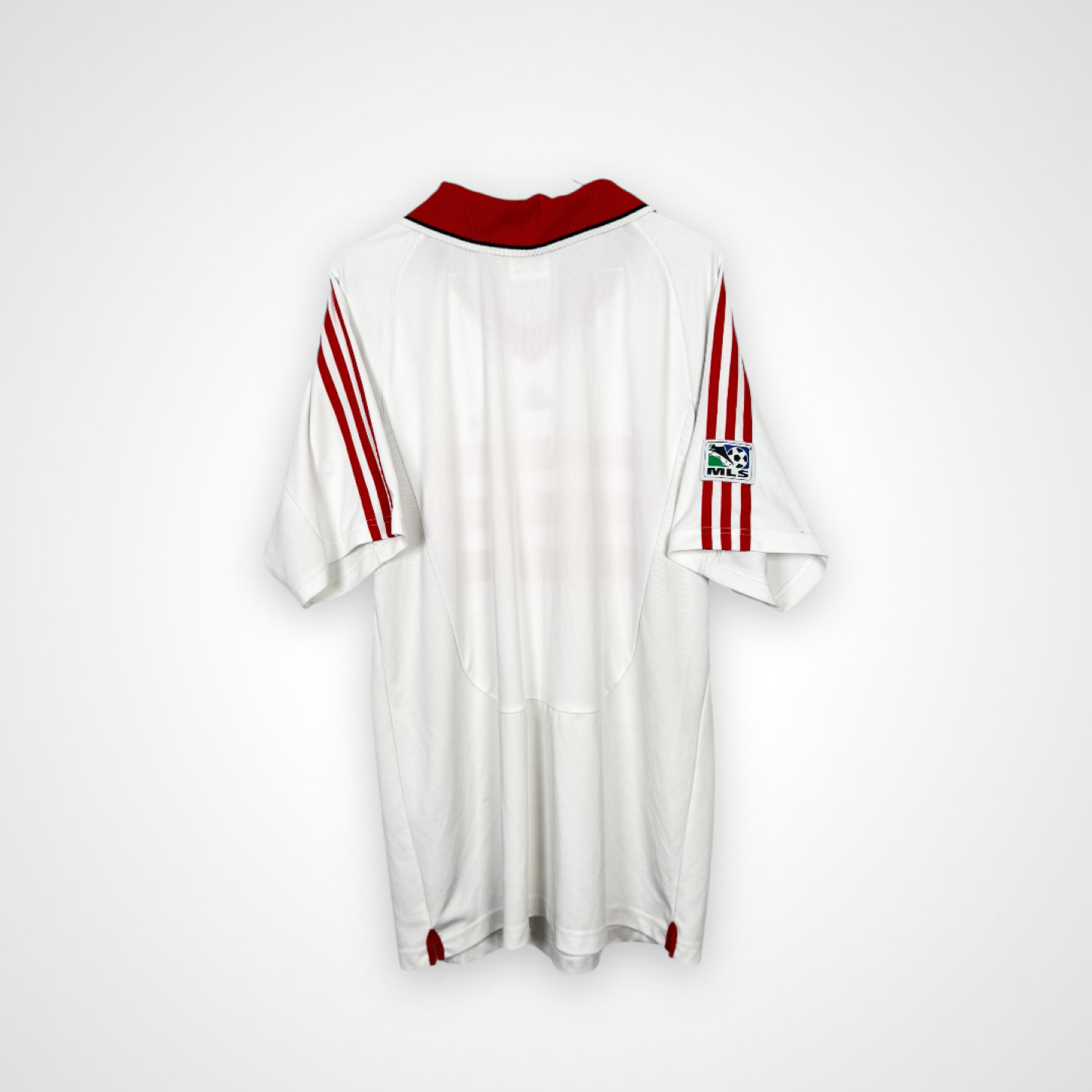 Ta oryginalna wyjazdowa koszulka DC United z lat 2000–2002 została zaprojektowana przez firmę Adidas i utrzymana w klasycznej białej kolorystyce, wzbogaconej o liczne czerwone detale. Wyróżnia ją stylowy kołnierzyk, charakterystyczne paski Adidasa na rękawkach oraz poziome pasy na froncie w okolicach klatki piersiowej, nadające jej dynamicznego charakteru.