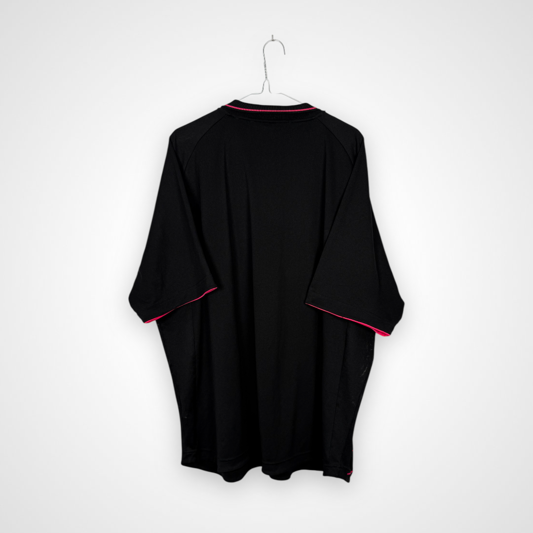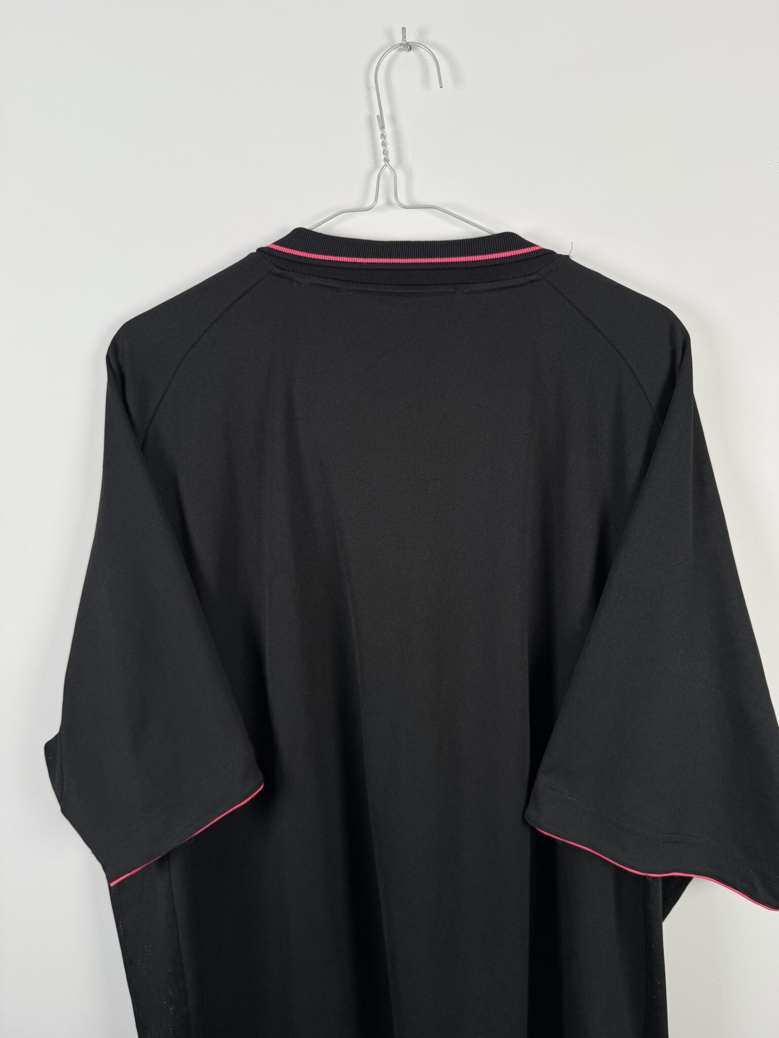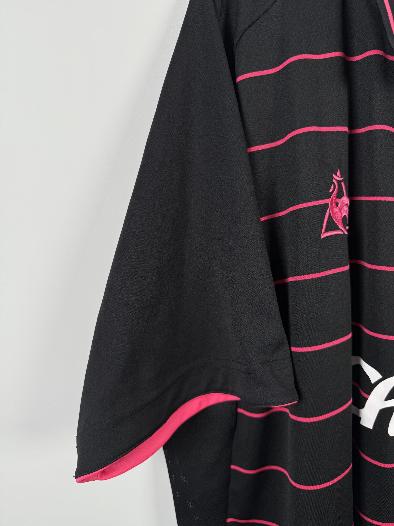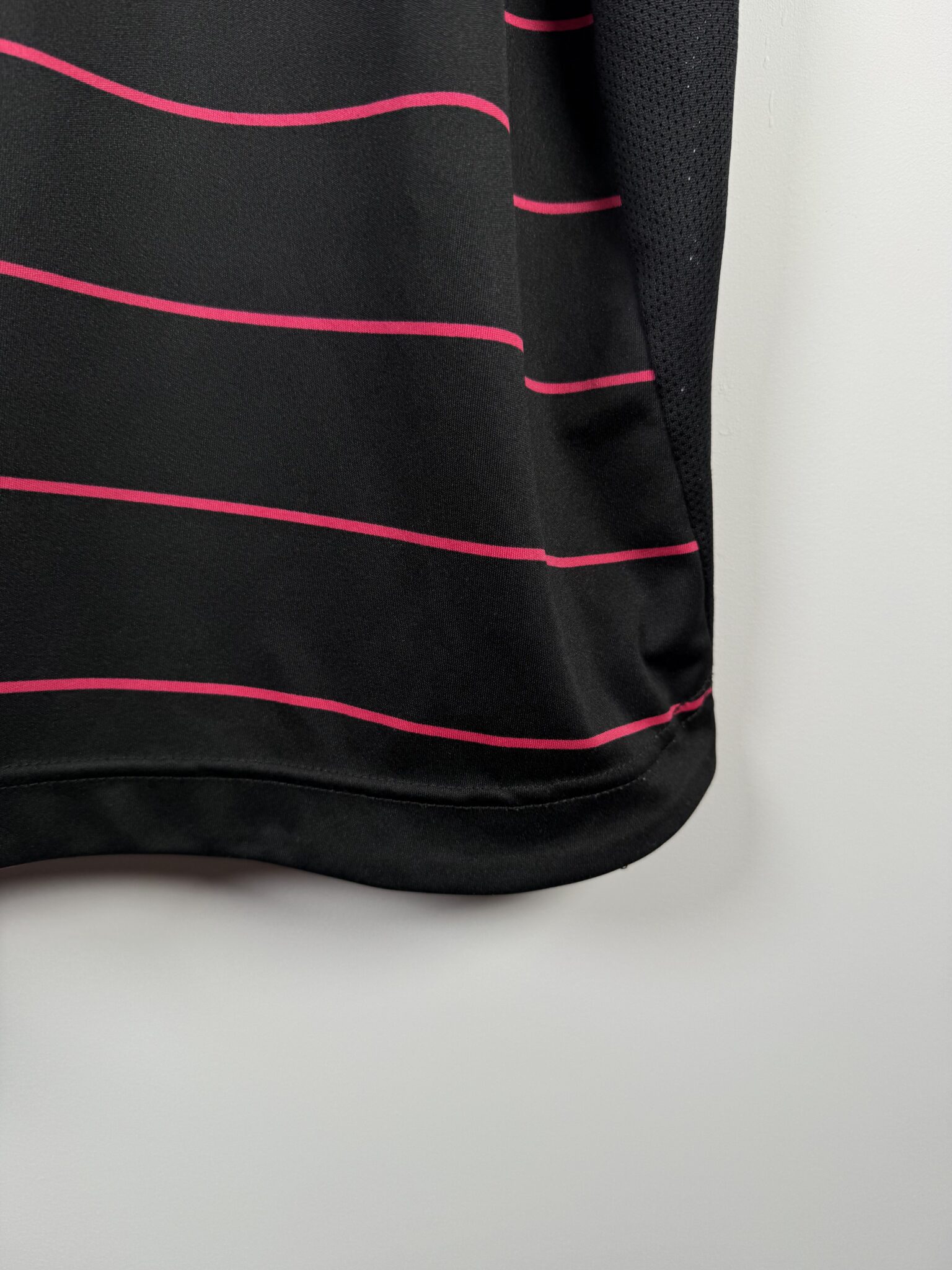 Ta oryginalna wyjazdowa koszulka Everton FC z sezonu 2009/10, wyprodukowana przez Le Coq Sportif, to jeden z najbardziej charakterystycznych modeli w historii klubu. Utrzymana w czarnym kolorze z eleganckim kołnierzykiem i subtelnymi cienkimi poziomymi paskami w odcieniu różowym, wyróżnia się odważnym i unikatowym designem, który do dziś jest dobrze wspominany przez kibiców „The Toffees”.