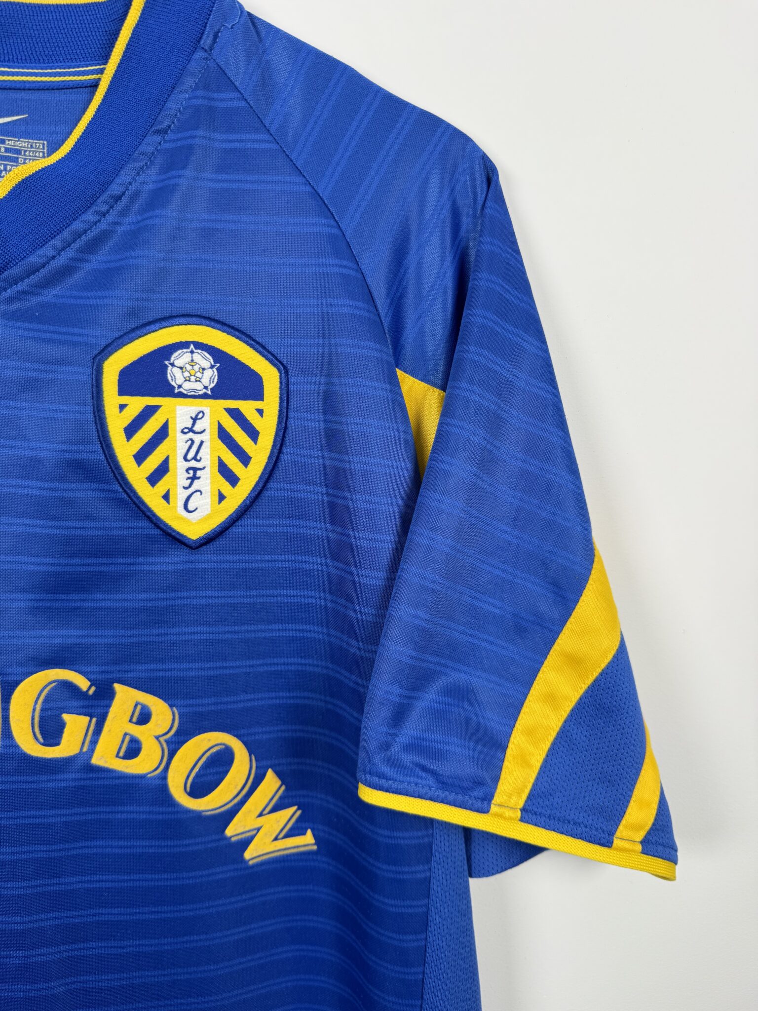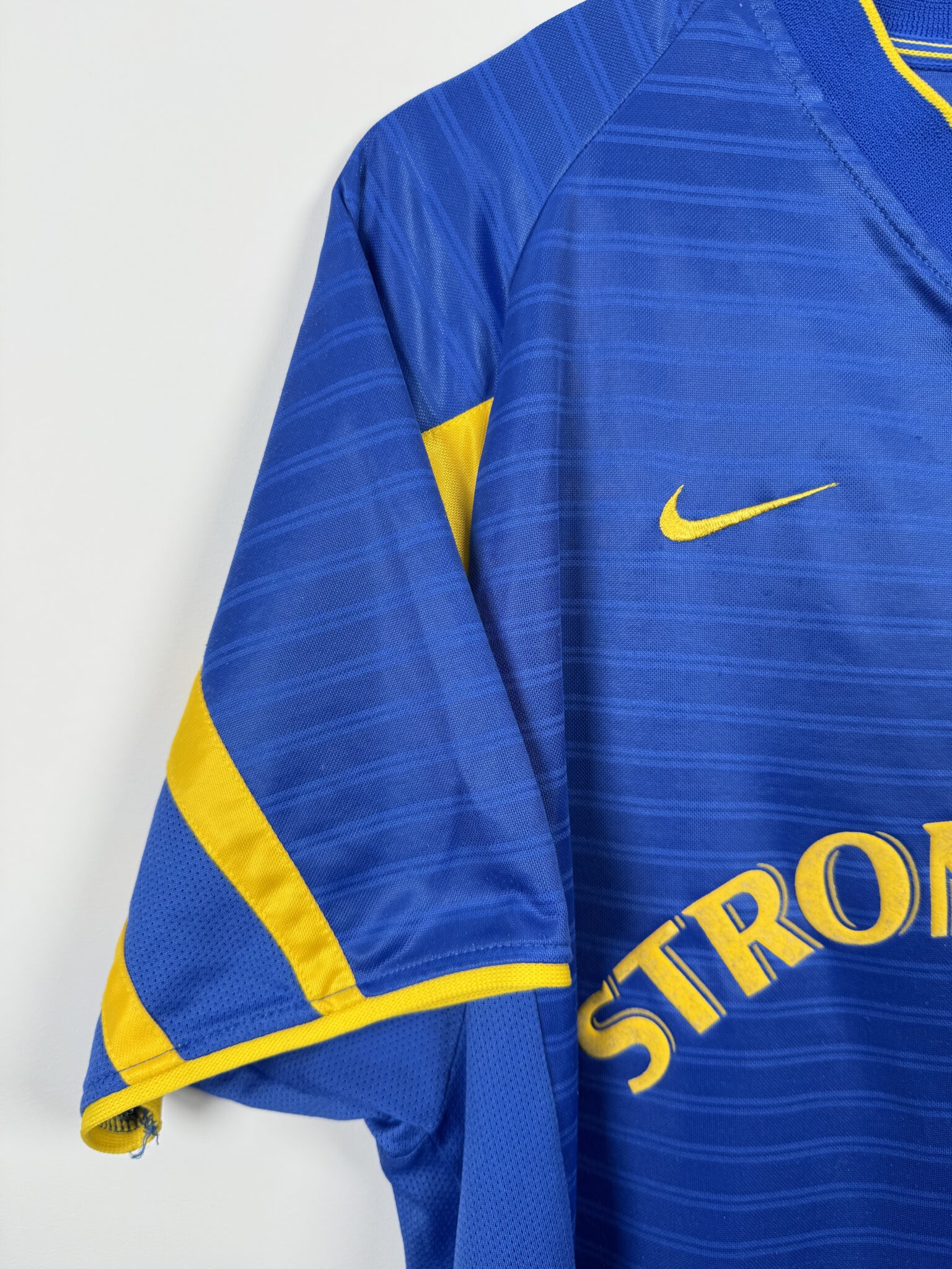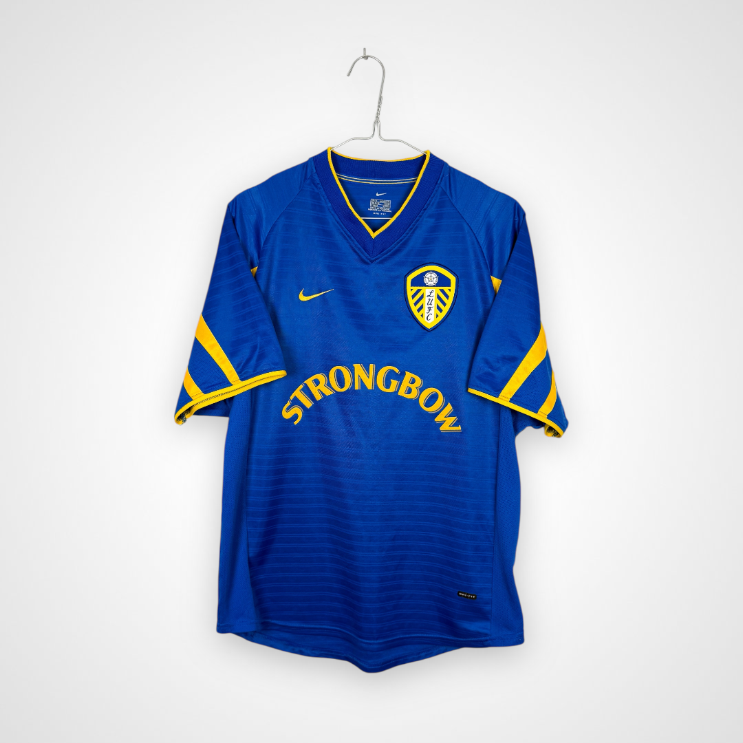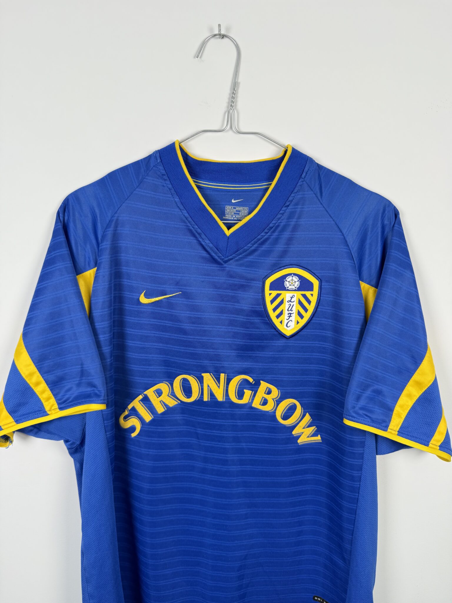 Ta oryginalna trzecia koszulka Leeds United FC z lat 2001-2003, wyprodukowana przez Nike, wyróżnia się niebieską bazą uzupełnioną żółtymi elementami na kołnierzyku, mankietach i bocznych panelach. Na froncie widnieje sponsor główny Strongbow, a na plecach umieszczono nadruk Alana Smitha – jednego z najbardziej rozpoznawalnych zawodników tamtej epoki.
