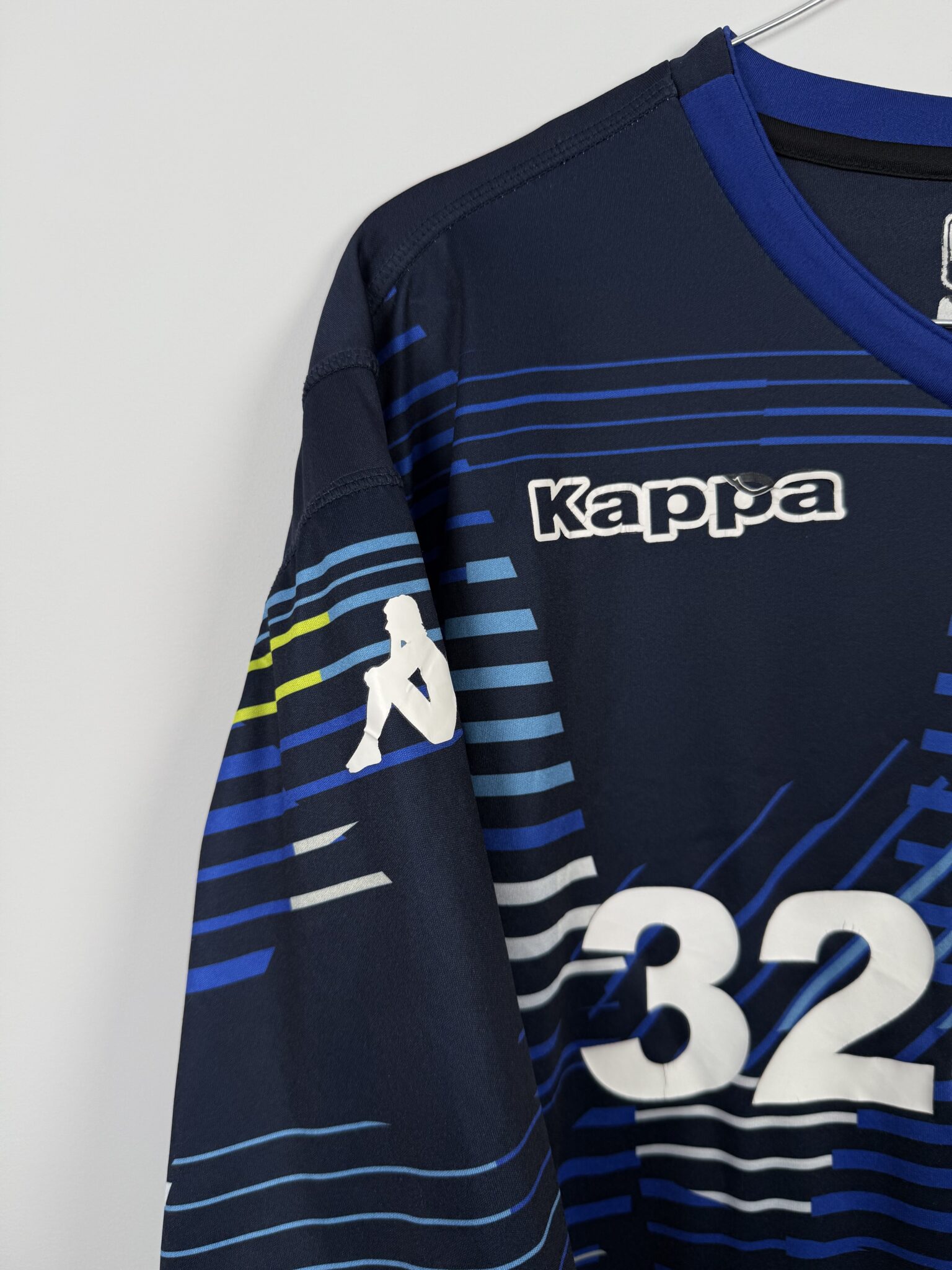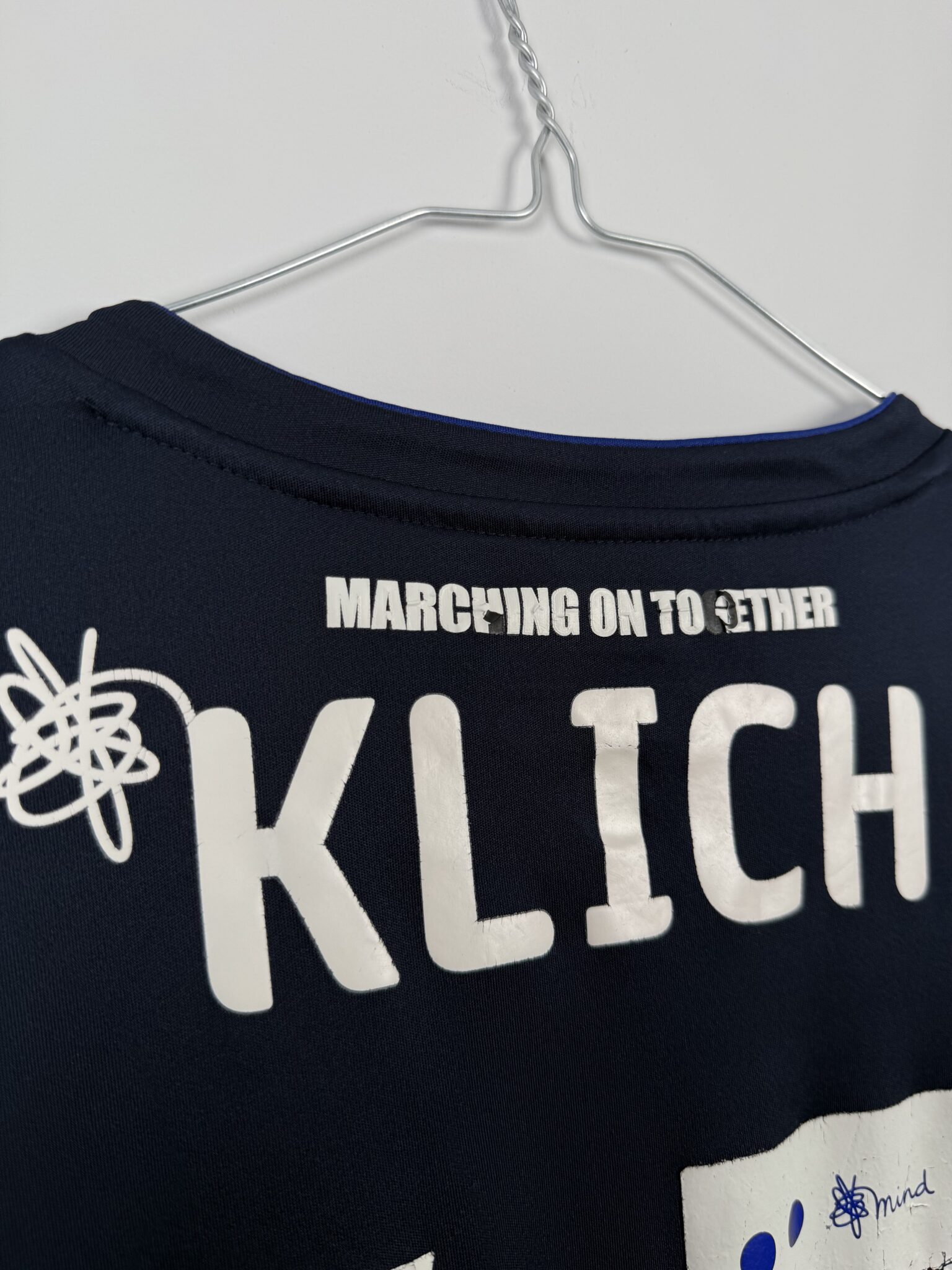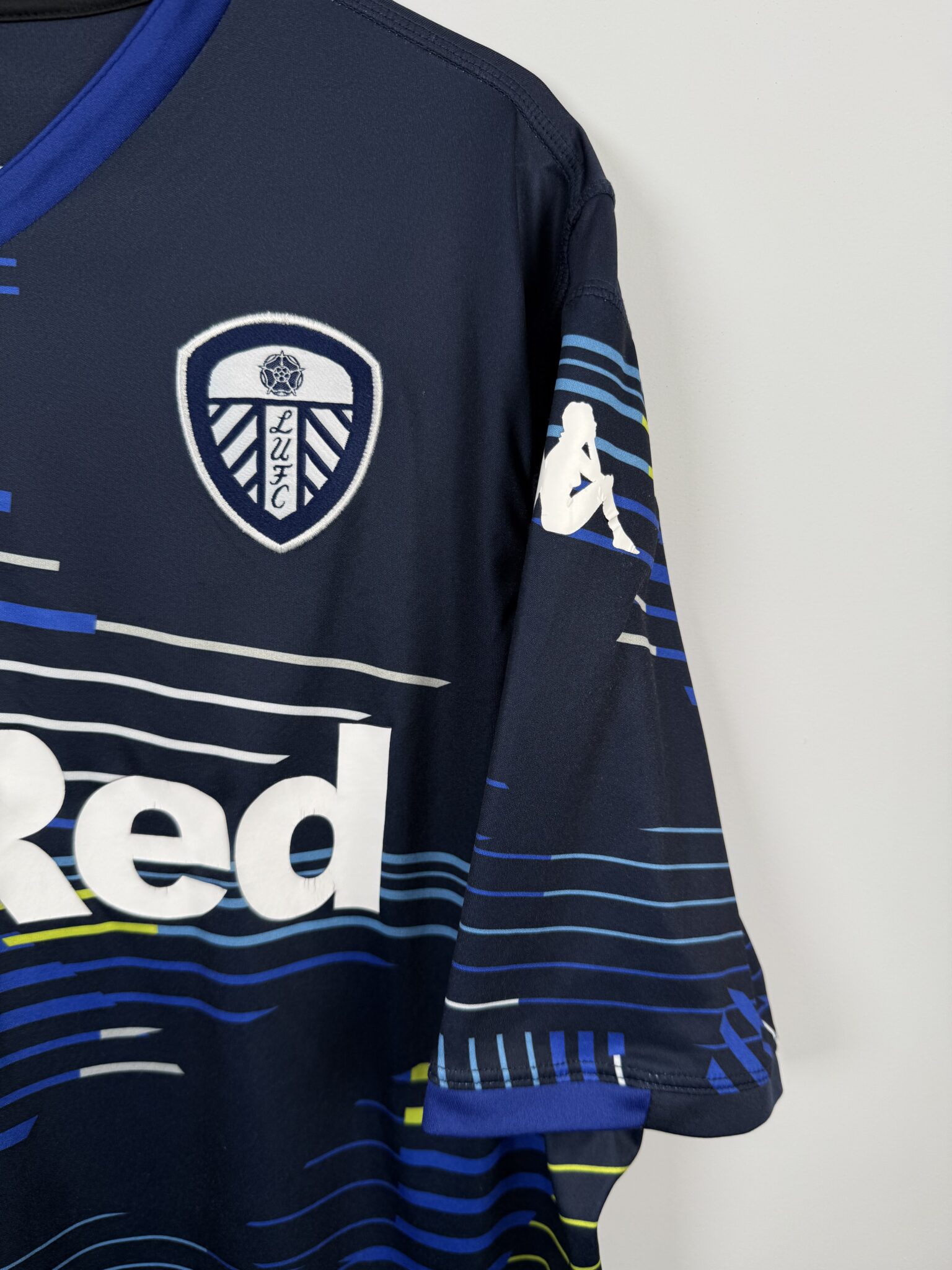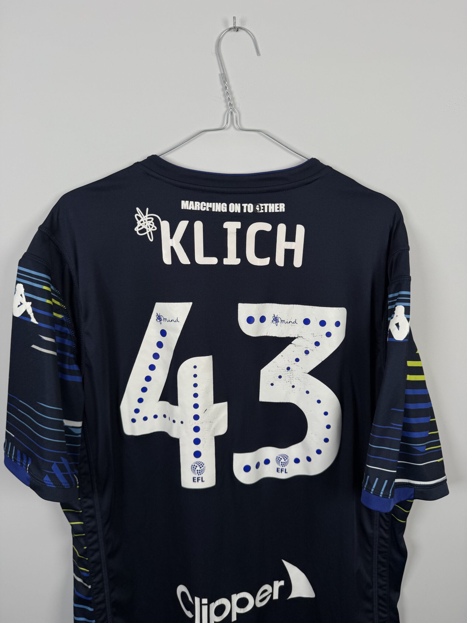 Ta oryginalna wyjazdowa koszulka Leeds United FC z sezonu 2018/19, wyprodukowana przez Kappę, to wyjątkowy model utrzymany w charakterystycznym granatowym kolorze z niebieskimi i żółtymi detalami, który szybko zyskał uznanie kibiców „The Whites”. Egzemplarz posiada oficjalny nadruk Mateusza Klicha – polskiego pomocnika, który odegrał kluczową rolę w tamtym sezonie i stał się jednym z liderów drużyny Marcelo Bielsy.