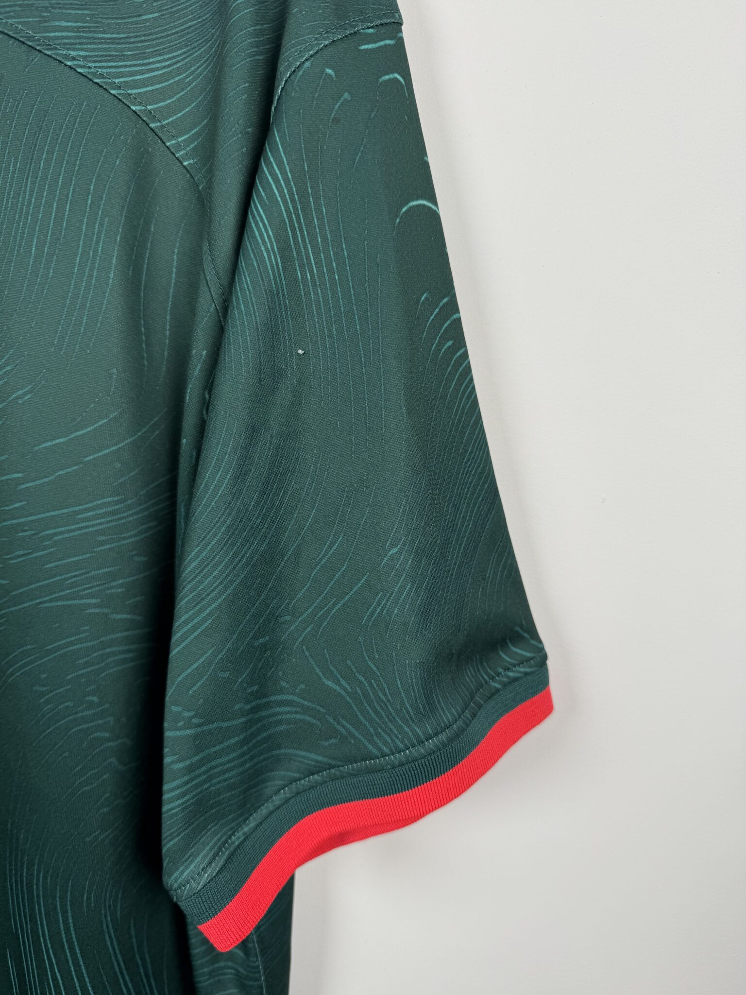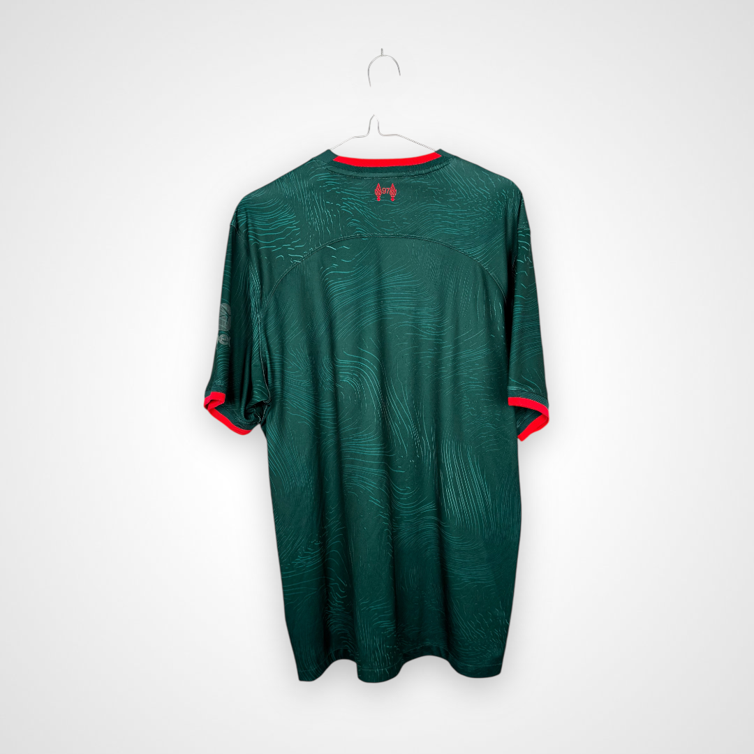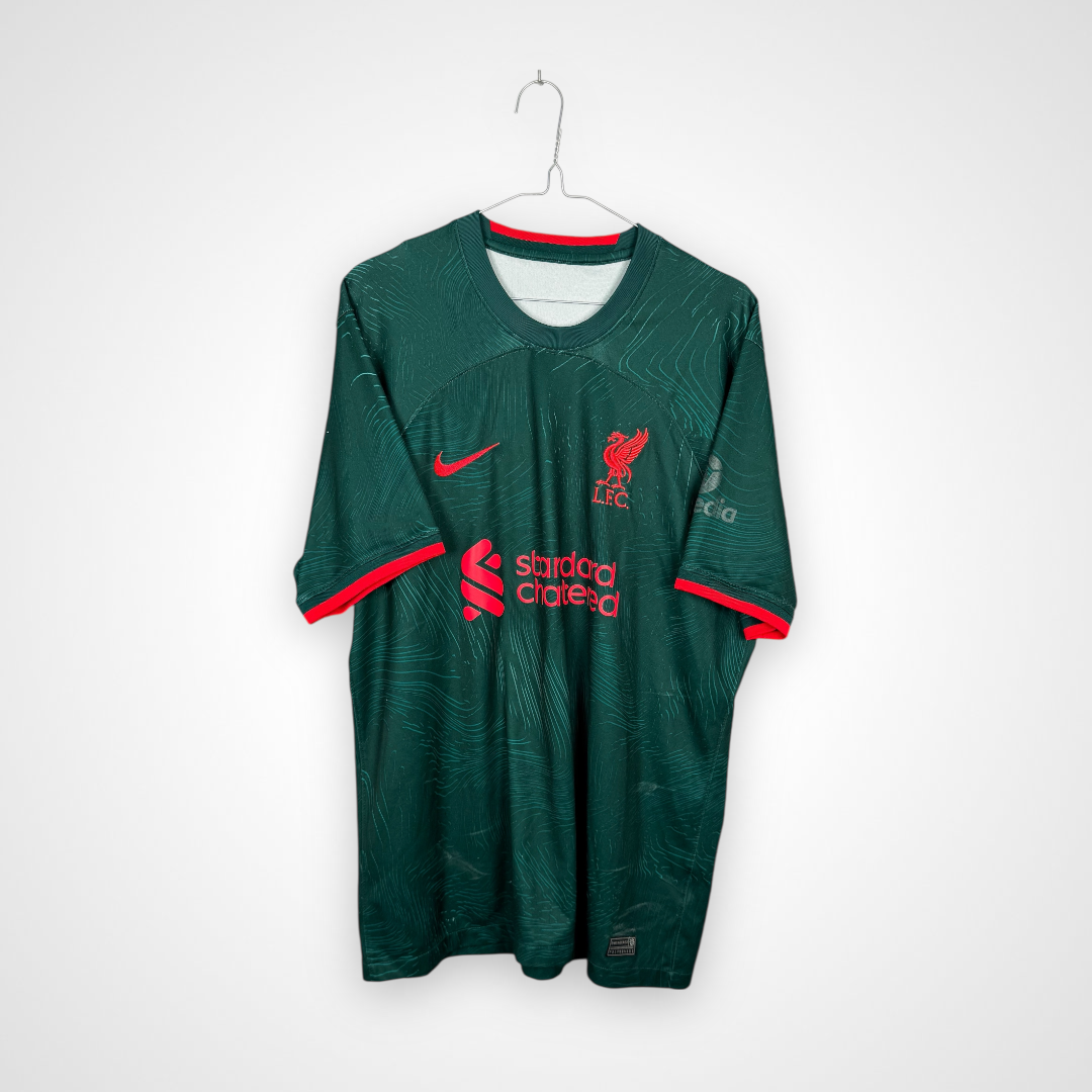 Ta oryginalna trzecia koszulka piłkarska Liverpoolu z sezonu 2022/23, wyprodukowana przez Nike, została zaprojektowana w ciemnym zielonym kolorze, uzupełnionym pomarańczowymi wstawkami na kołnierzyku oraz detalach. To odważna i nowoczesna propozycja, która wyróżniała się na boiskach Ligi Mistrzów i Premier League, a jednocześnie doskonale nawiązywała do alternatywnych barw klubowych „The Reds”.