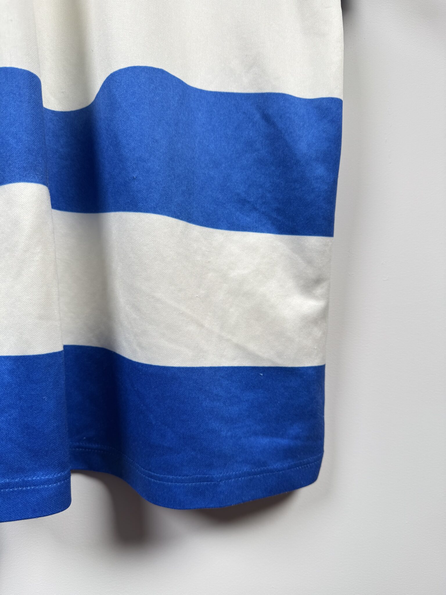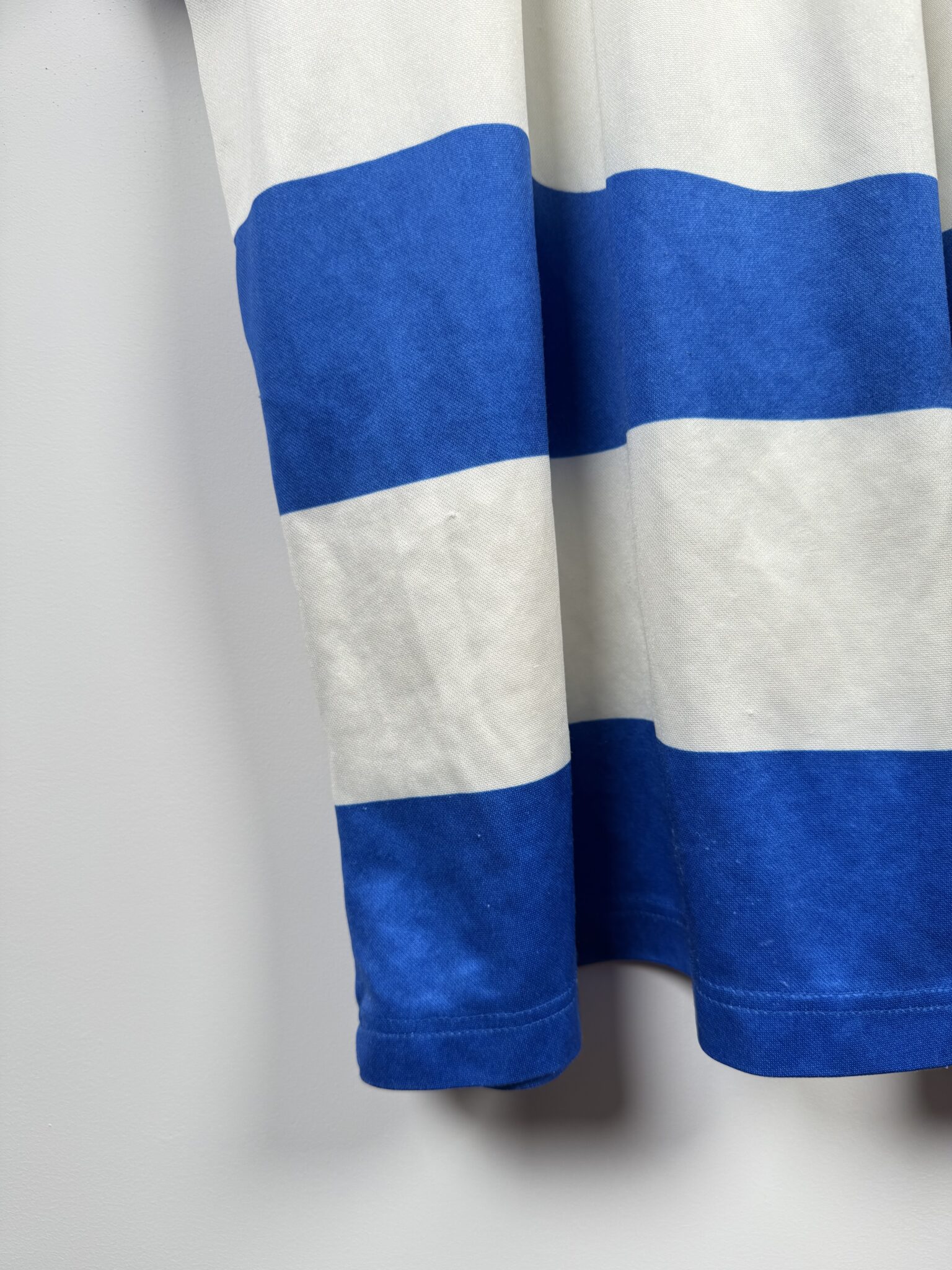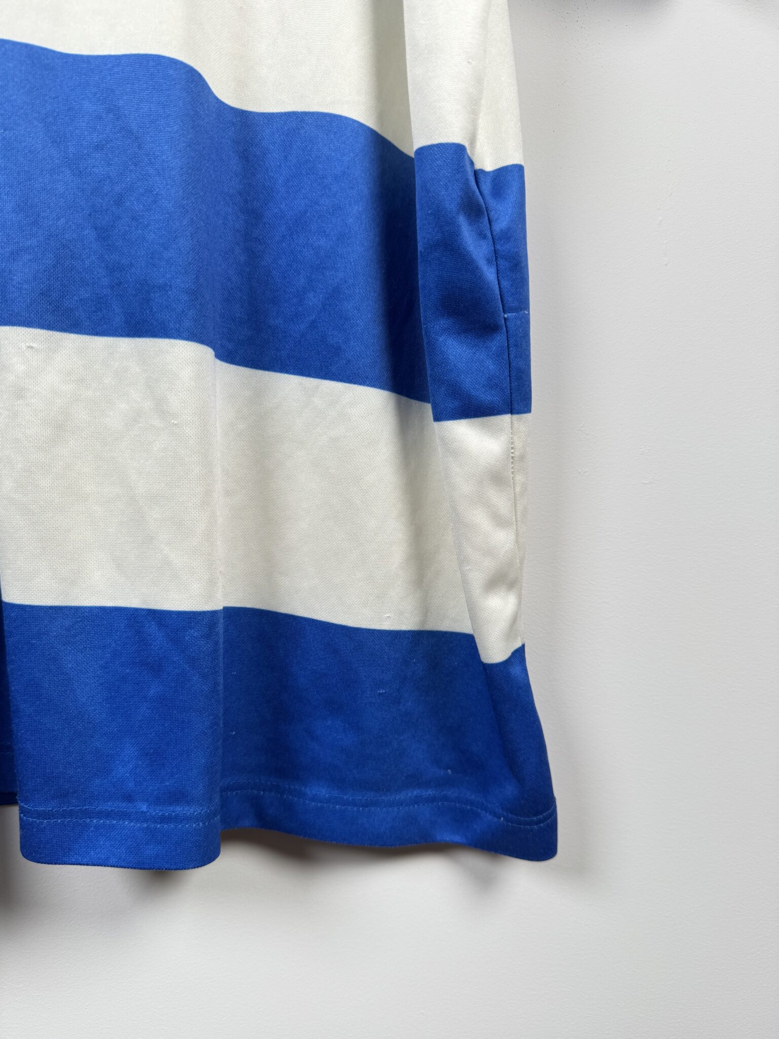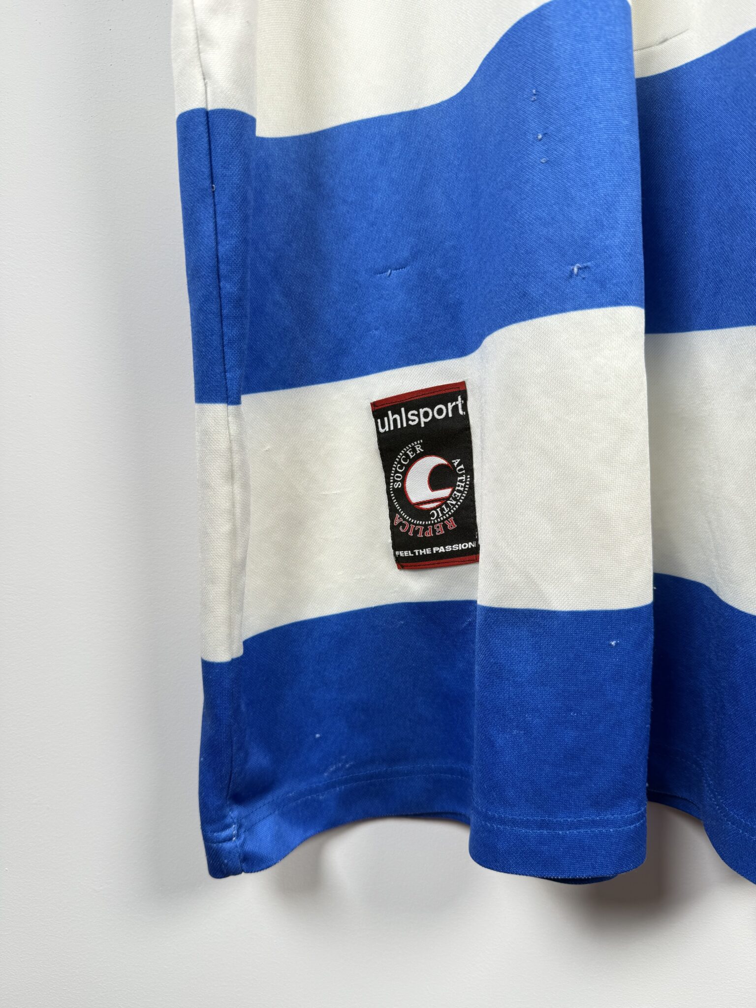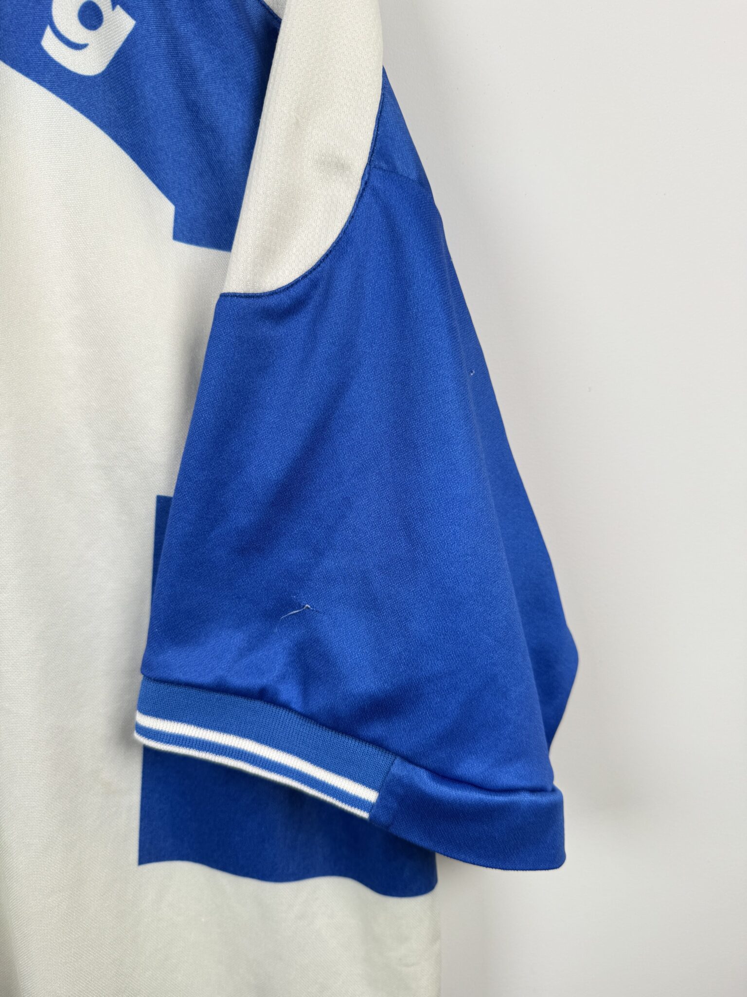 Przedstawiamy oryginalną koszulkę piłkarską MSV Duisburg z sezonu 1999/00, wyprodukowaną przez renomowaną firmę Uhlsport. Ten model to prawdziwy klasyk z końcówki lat 90., wyróżniający się tradycyjnym biało-niebieskim układem barw, charakterystycznym dla „Zebr” – przydomku, który od lat towarzyszy drużynie. Na froncie widnieje historyczne logo klubu oraz oznaczenia producenta, które podkreślają jakość i autentyczność tego modelu.