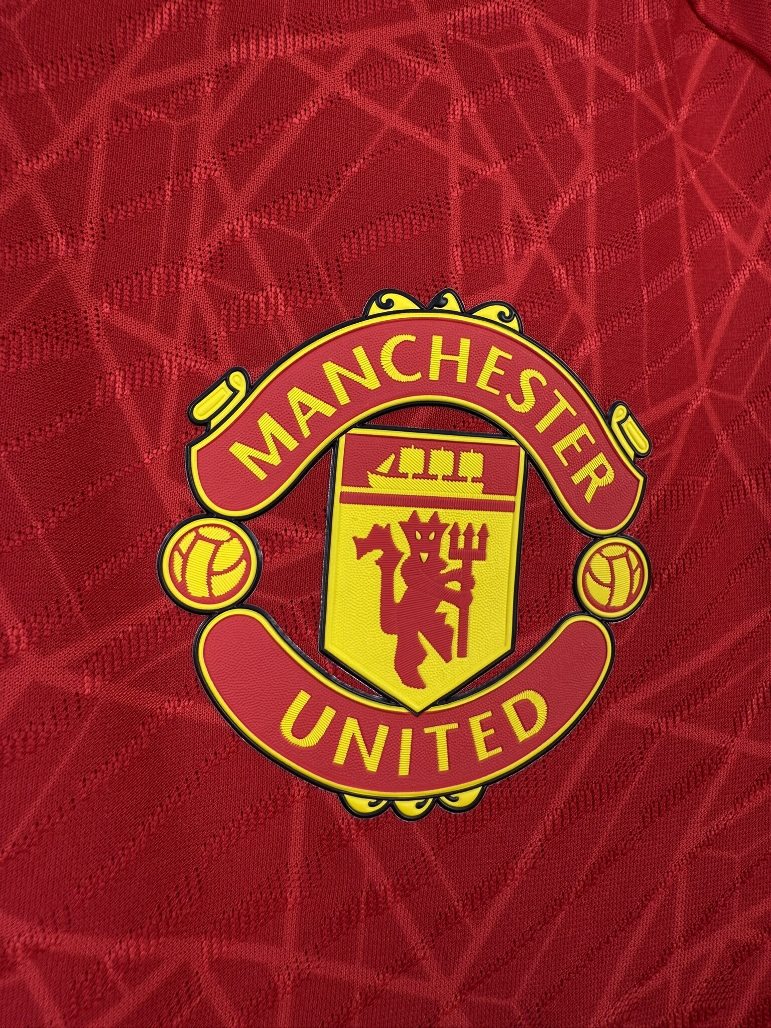 Utrzymana w klasycznej czerwonej kolorystyce, koszulka wyróżnia się czarnym kołnierzykiem w stylu retro i subtelnymi białymi detalami, a jej projekt nawiązuje do industrialnych korzeni Manchesteru – zwłaszcza architektury dzielnicy Castlefield. Na piersi znajduje się haftowany herb klubu, logo Adidasa oraz sponsor główny TeamViewer, natomiast na rękawie umieszczono logo DXC Technology.