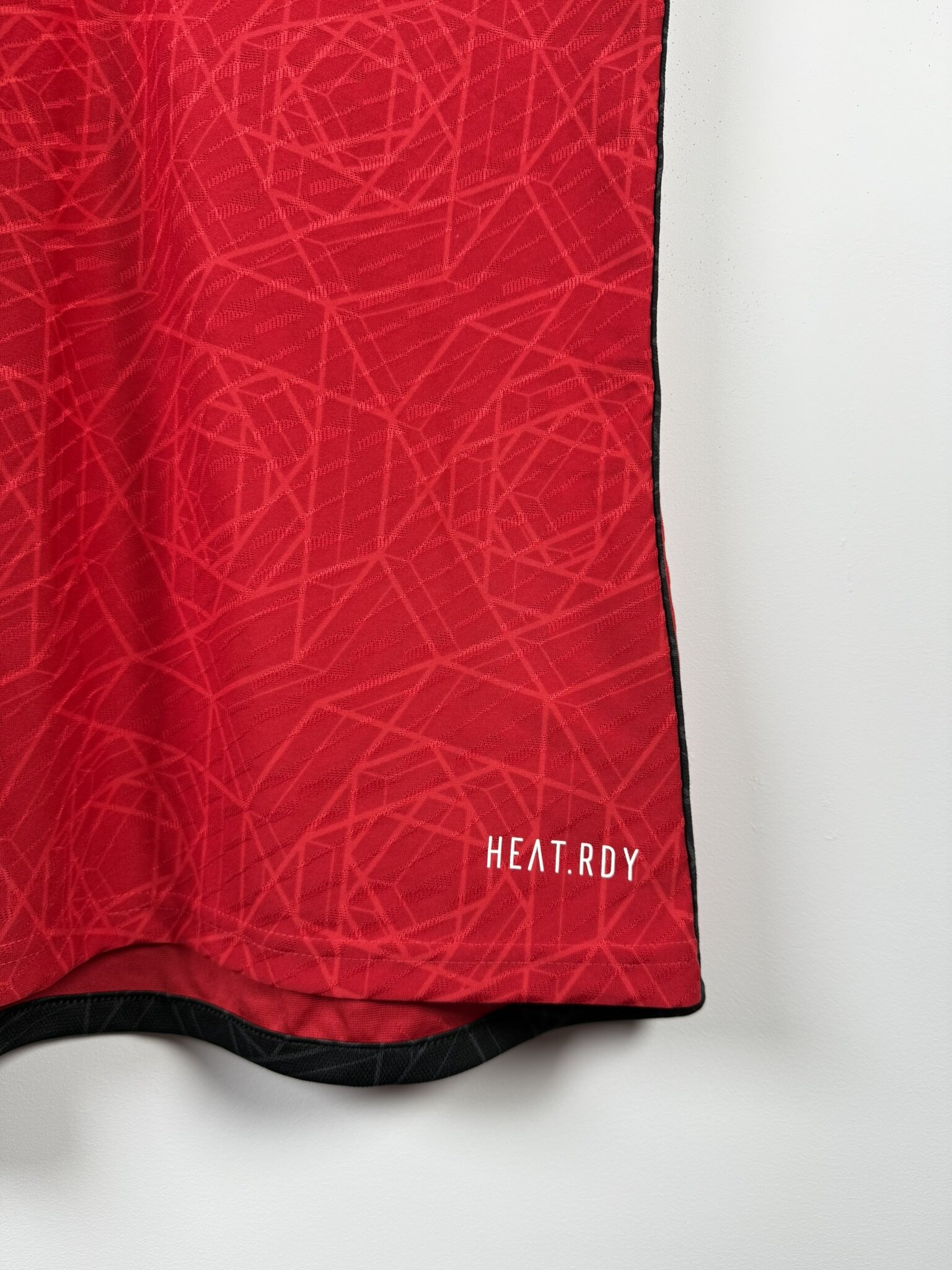 Jako wersja AUTHENTIC, koszulka została wykonana z najlżejszych i najbardziej zaawansowanych technologicznie materiałów z linii HEAT.RDY, które zapewniają maksymalną wentylację, szybkość odprowadzania wilgoci i profesjonalne dopasowanie – tak, jak noszą ją zawodnicy podczas meczów. Charakterystyczne są również termotransferowe aplikacje, które są cieńsze i bardziej aerodynamiczne niż w standardowej wersji repliki.