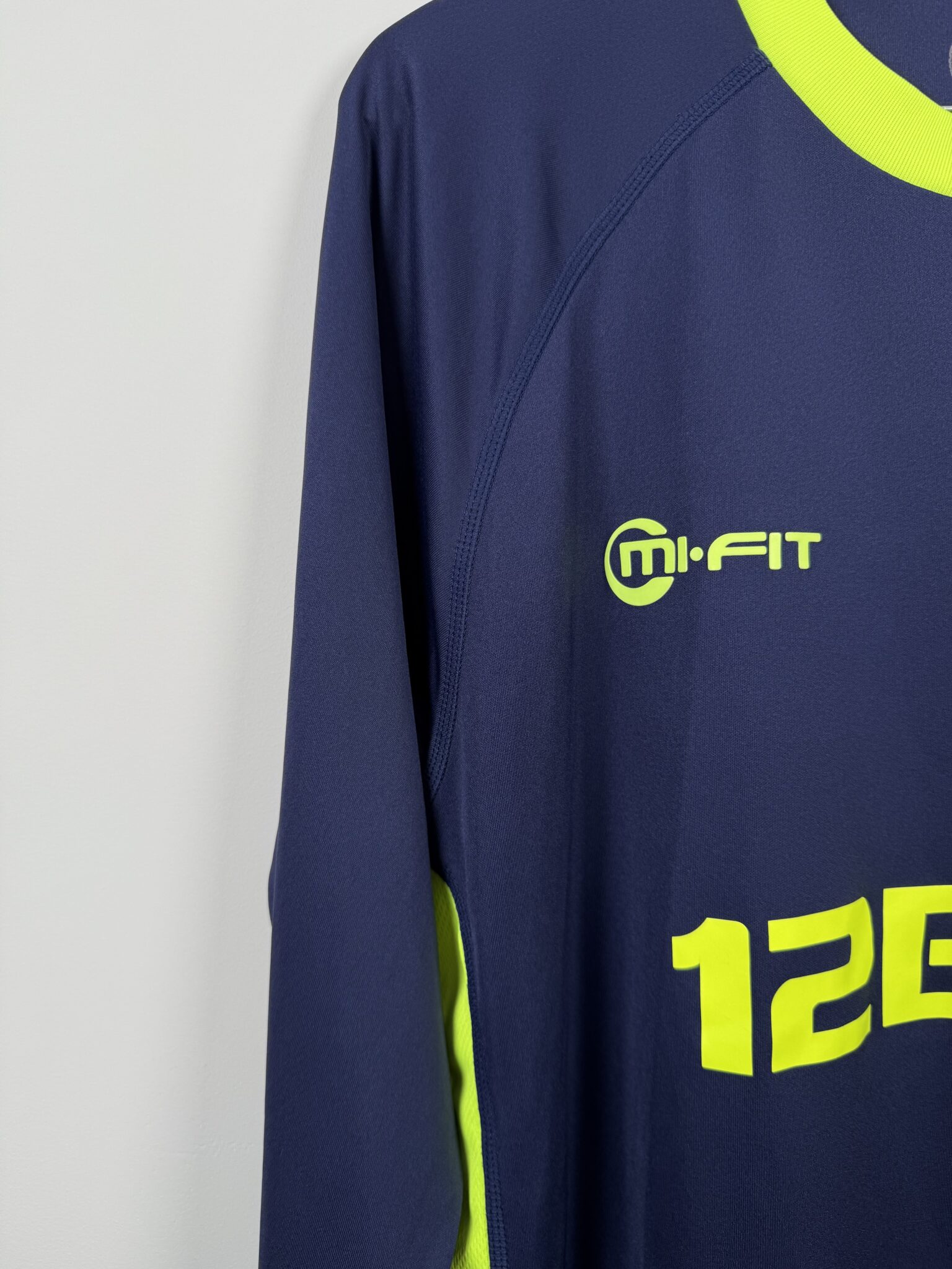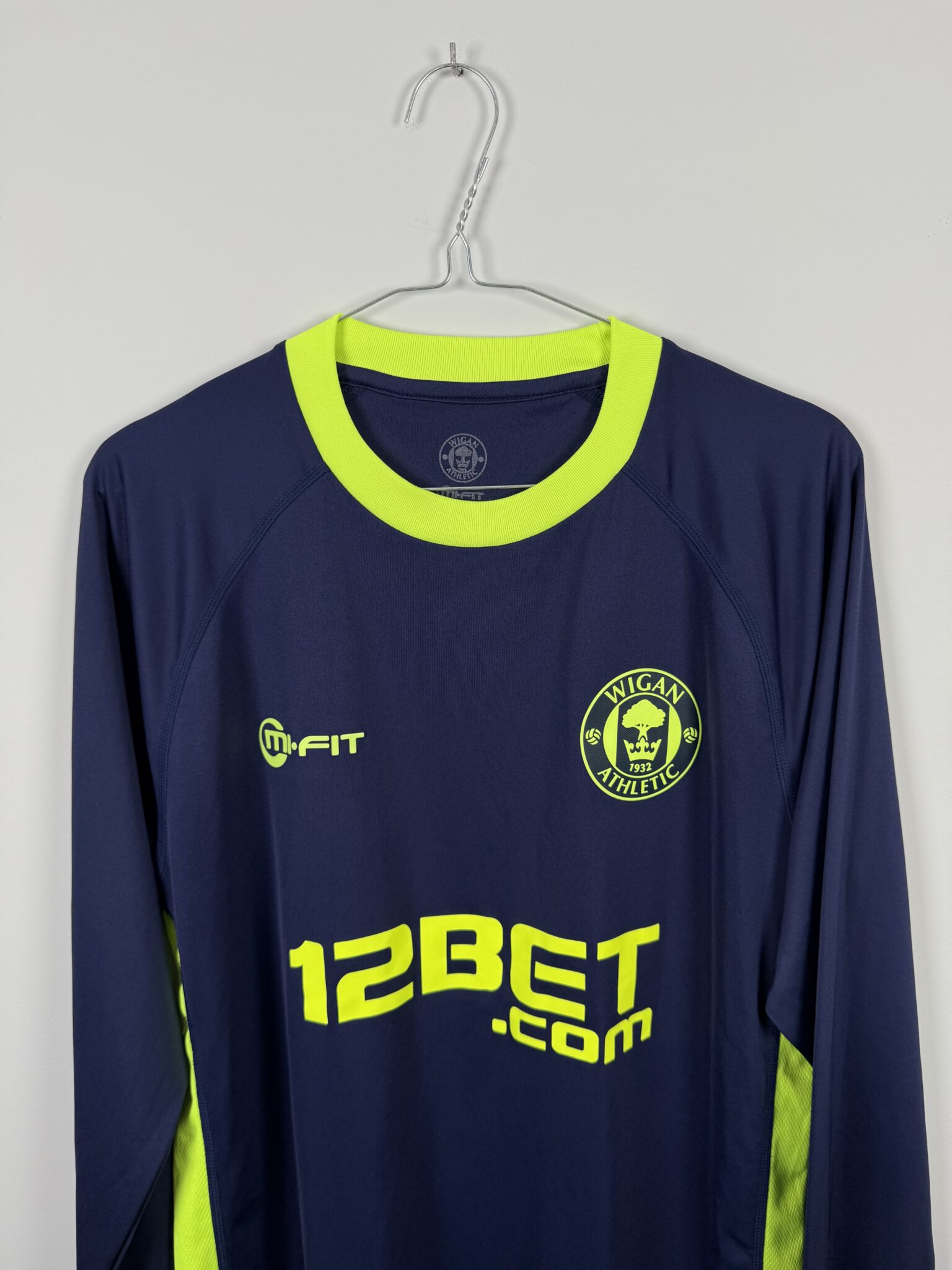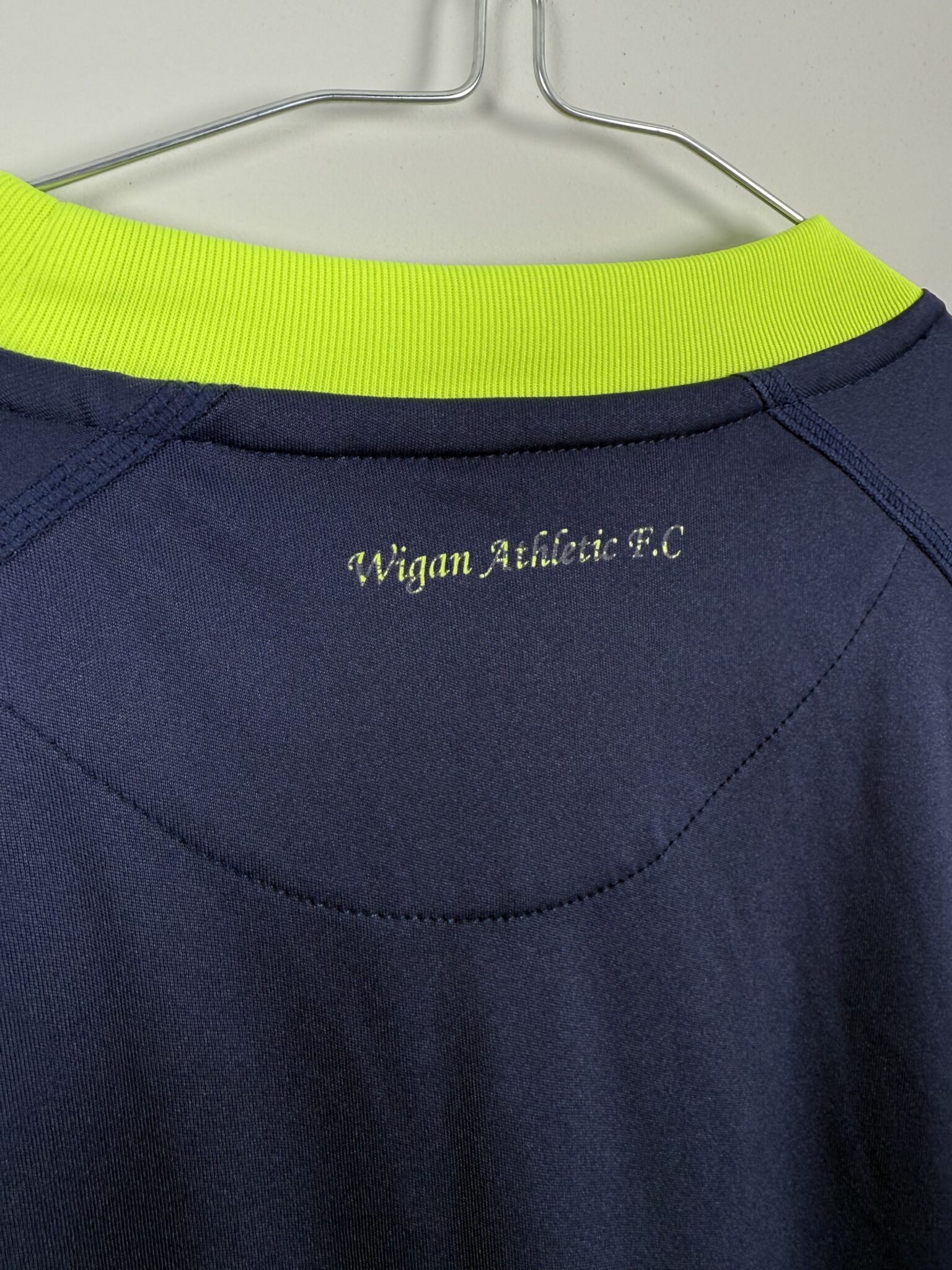 Ta oryginalna wyjazdowa koszulka Wigan Athletic z sezonu 2011/12, wyprodukowana przez mi.fit, wyróżnia się ciemnogranatową bazą przełamaną neonowymi wstawkami na ramionach, kołnierzyku i bocznych panelach, co nadaje jej nowoczesny i dynamiczny wygląd. Na piersi umieszczono herb Wigan Athletic, logo mi.fit oraz sponsora głównego 188BET w kontrastowej bieli i pomarańczy.