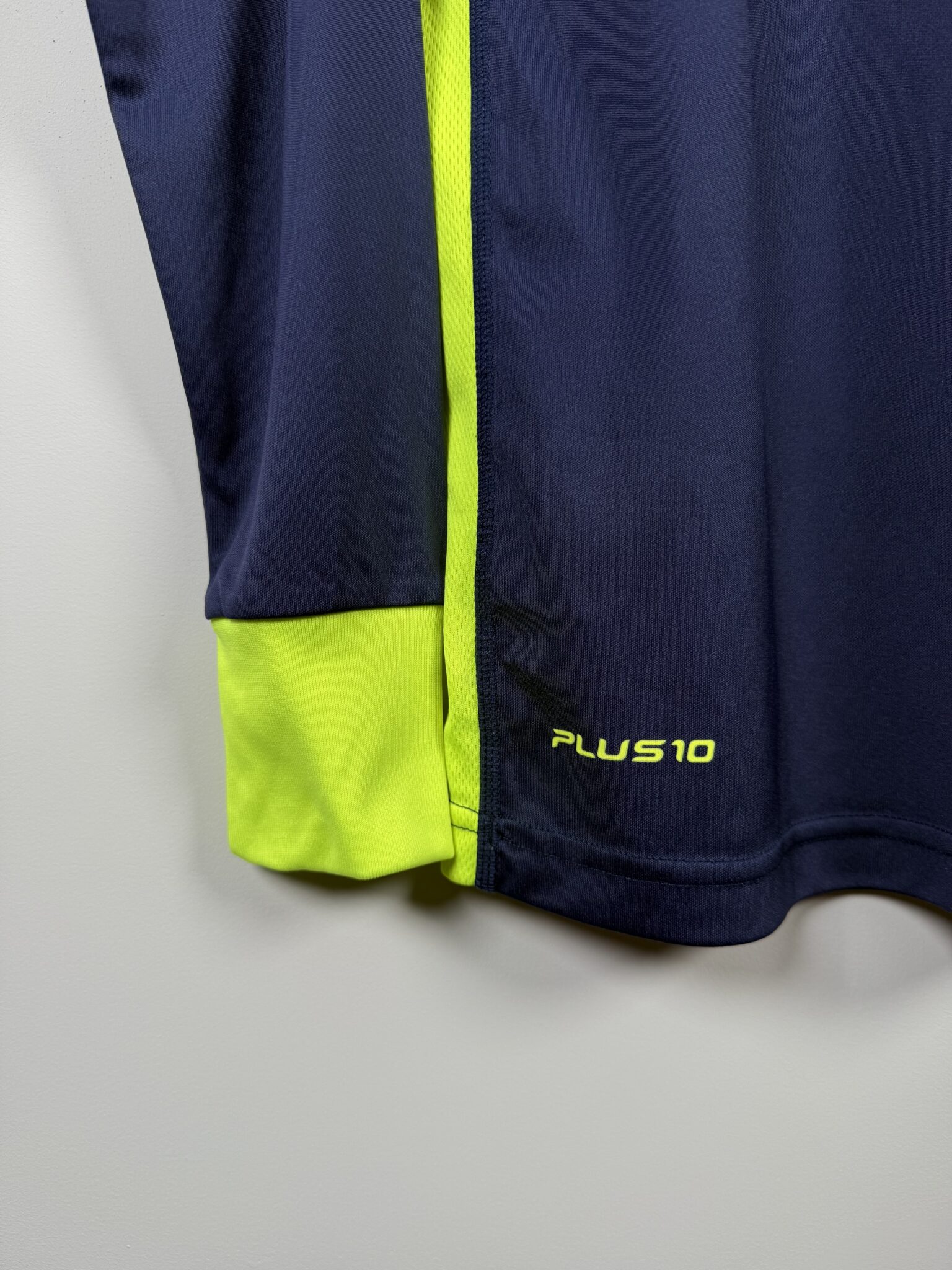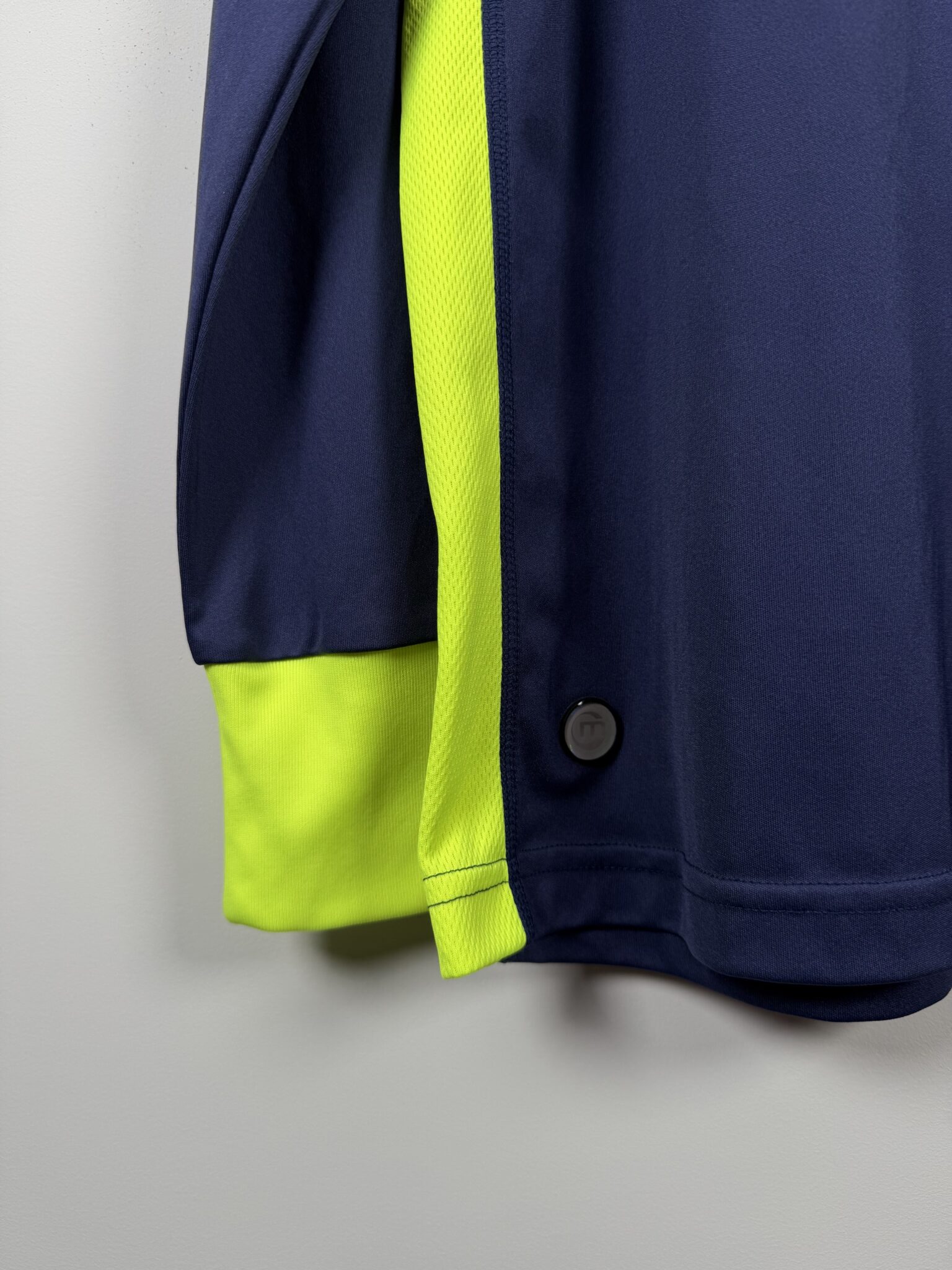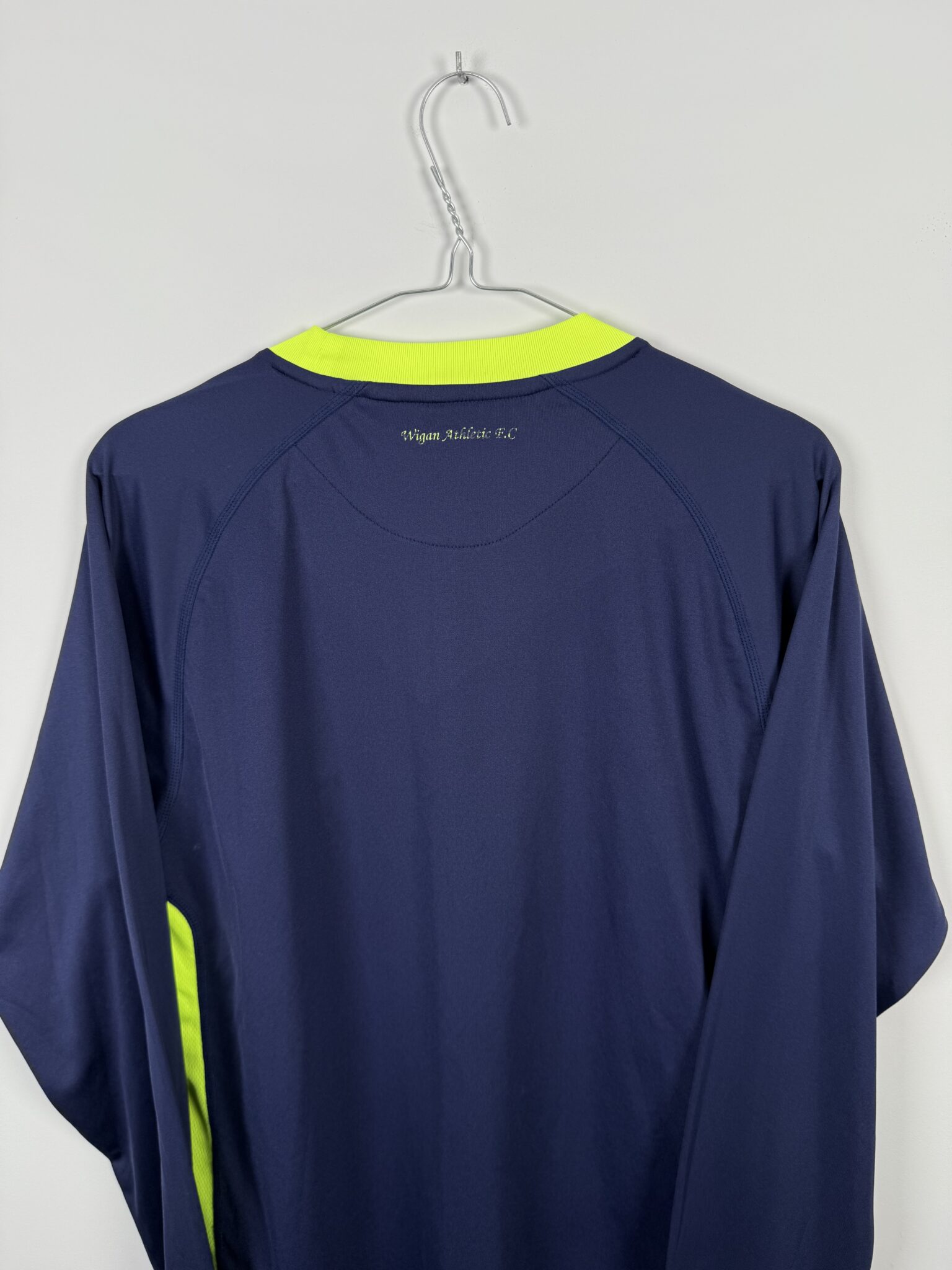 Ta oryginalna wyjazdowa koszulka Wigan Athletic z sezonu 2011/12, wyprodukowana przez mi.fit, wyróżnia się ciemnogranatową bazą przełamaną neonowymi wstawkami na ramionach, kołnierzyku i bocznych panelach, co nadaje jej nowoczesny i dynamiczny wygląd. Na piersi umieszczono herb Wigan Athletic, logo mi.fit oraz sponsora głównego 188BET w kontrastowej bieli i pomarańczy.