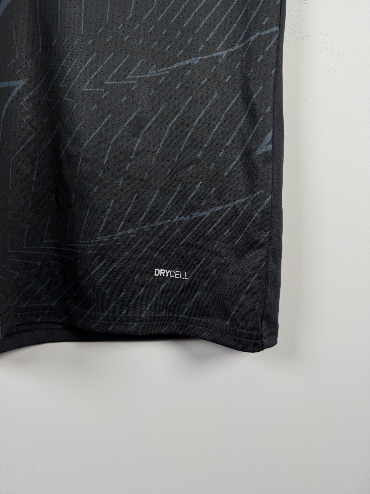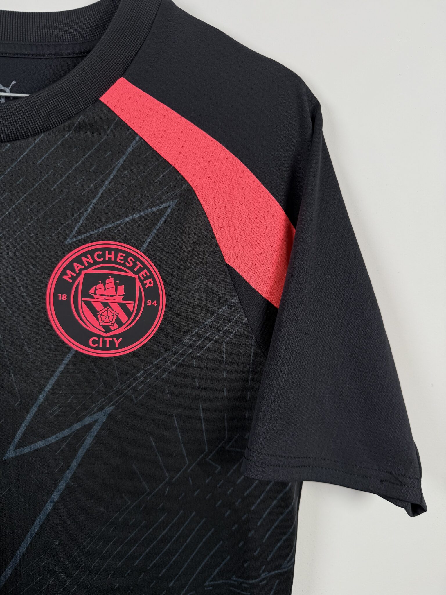 Na piersi umieszczono herb Manchesteru City oraz logo Pumy, co nadaje koszulce autentyczny charakter. Wykonana została z materiału w technologii Puma DryCell, dzięki czemu gwarantowała zawodnikom lekkość, przewiewność i skuteczne odprowadzanie wilgoci podczas rozgrzewek i przygotowań do meczów w Premier League oraz Lidze Mistrzów.