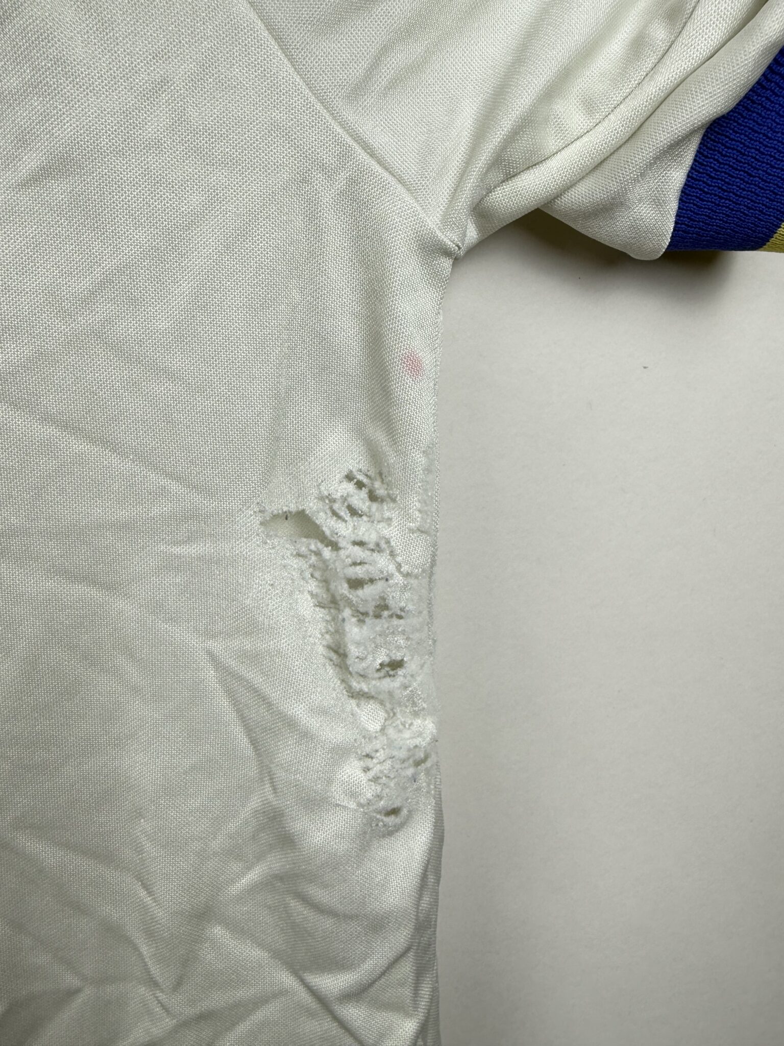 Przenieś się w czasie do drugiej połowy lat 80. i poznaj oryginalną domową koszulkę piłkarską Leeds United z sezonów 1986/88, wyprodukowaną przez kultową markę Umbro. Ten model to prawdziwa perełka retro – klasyczny biały kolor, charakterystyczne niebiesko-żółte akcenty na kołnierzyku i rękawkach oraz haftowany herb klubu przywołują wspomnienia złotej ery angielskiej piłki. Koszulka została wykonana z lekkiego, oddychającego materiału, który doskonale oddaje klimat lat 80., gdy futbol był znacznie mniej komercyjny, a stroje miały niepowtarzalny charakter.