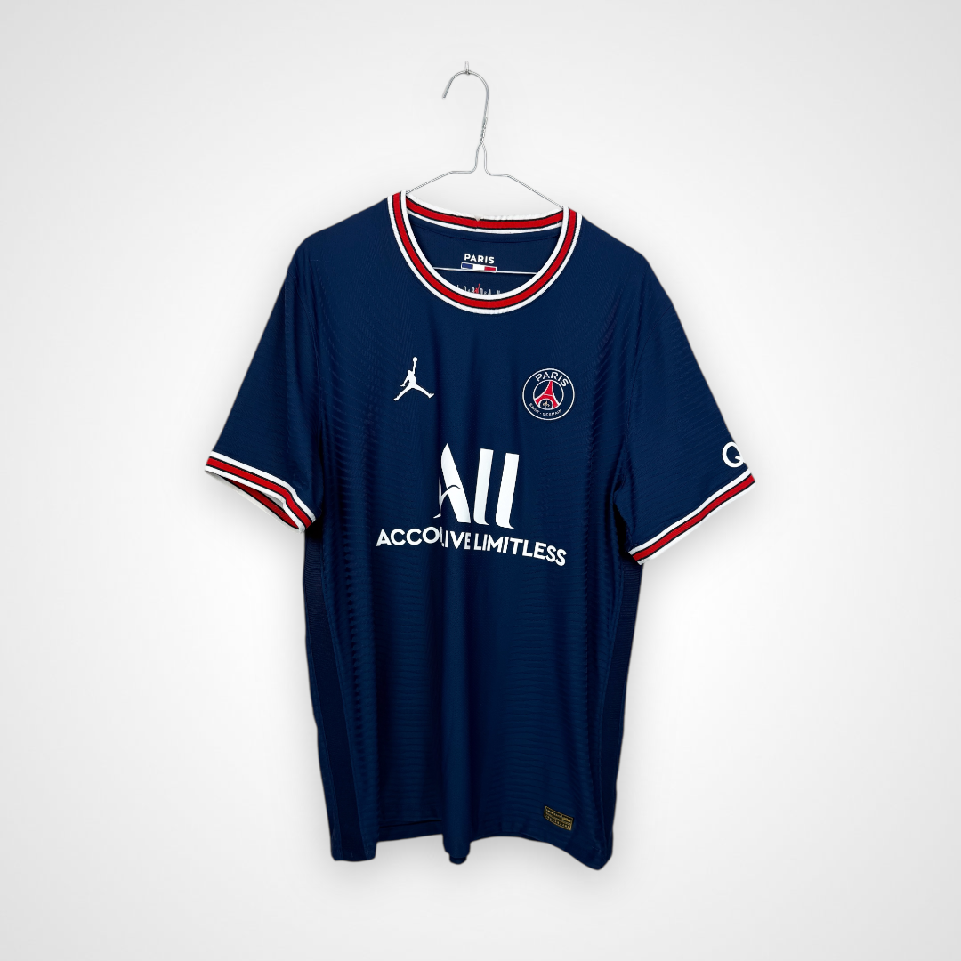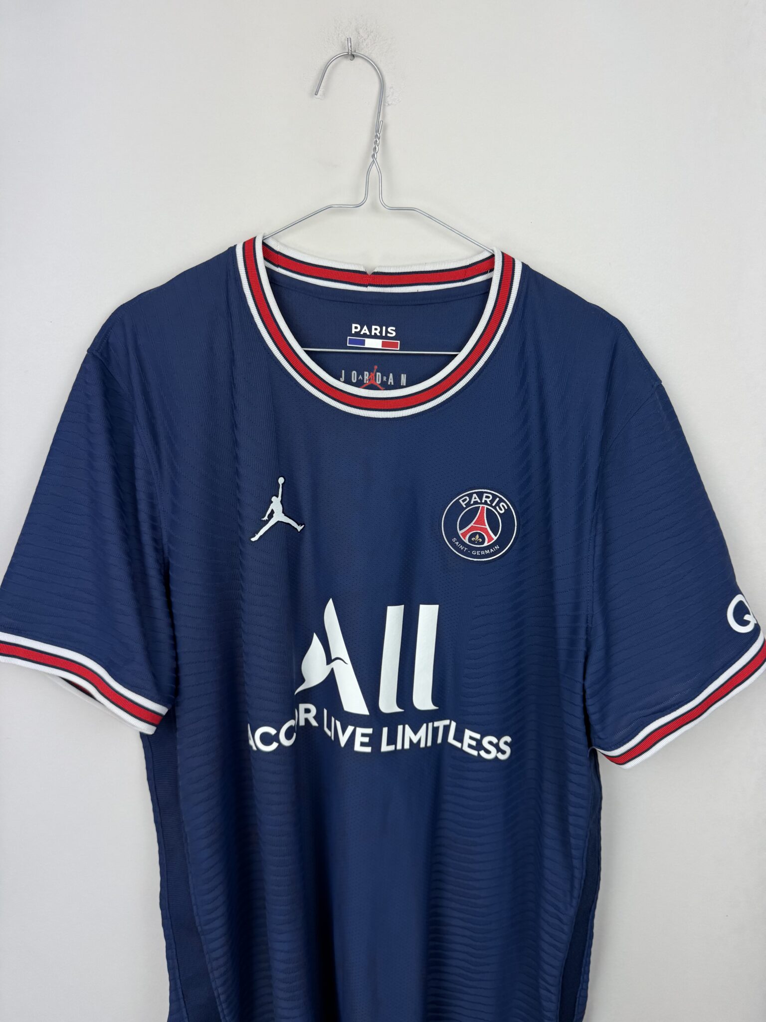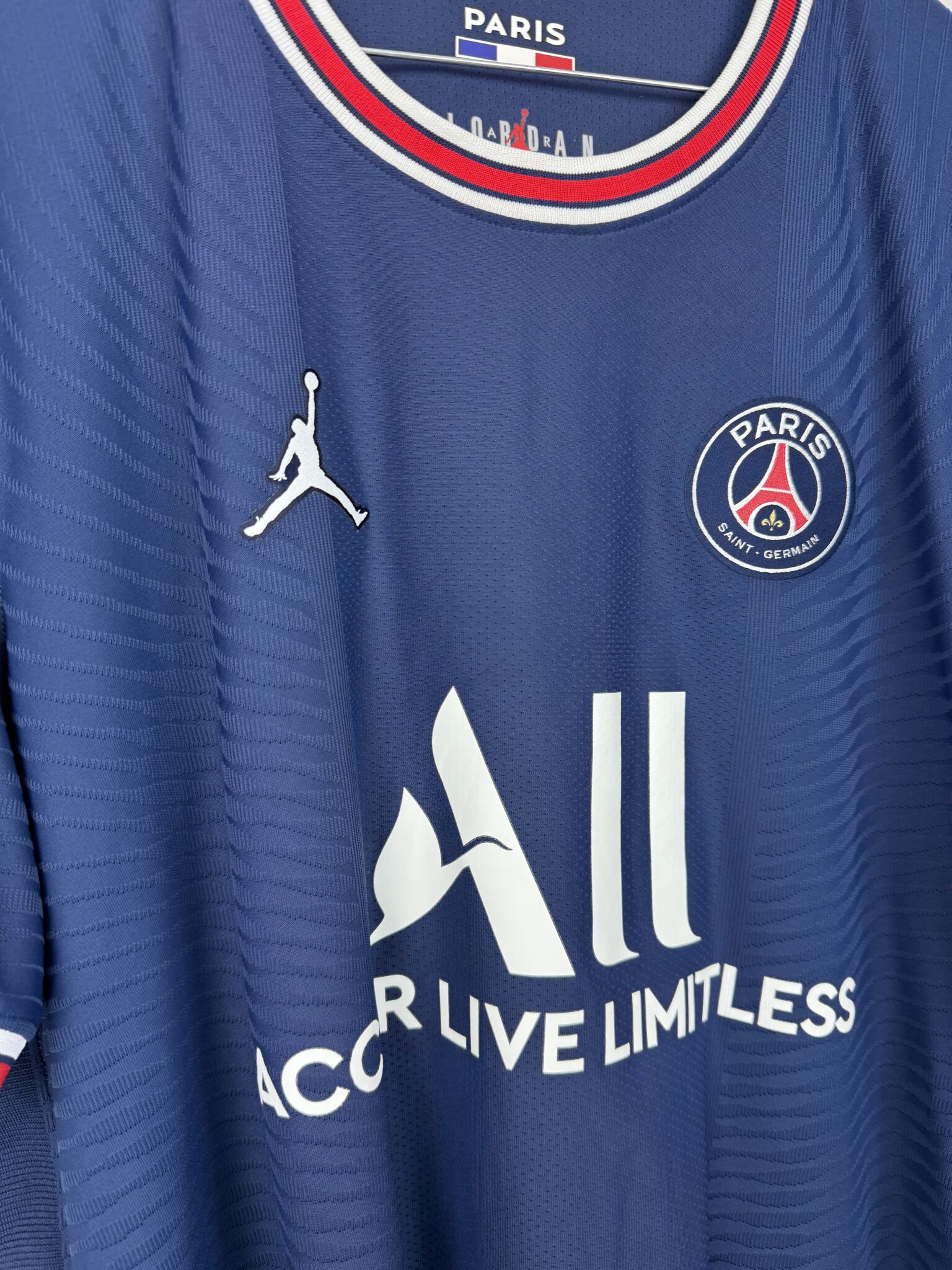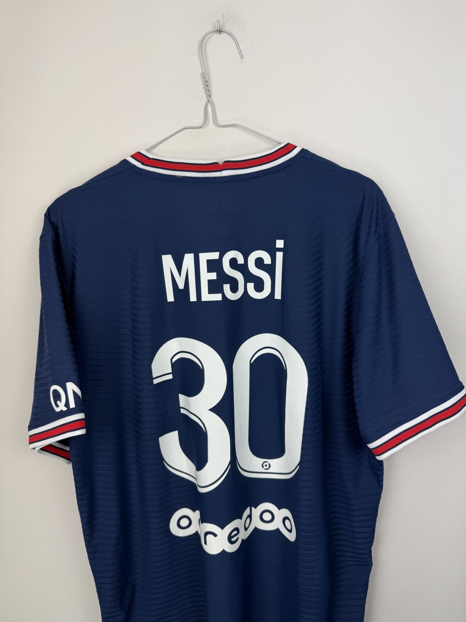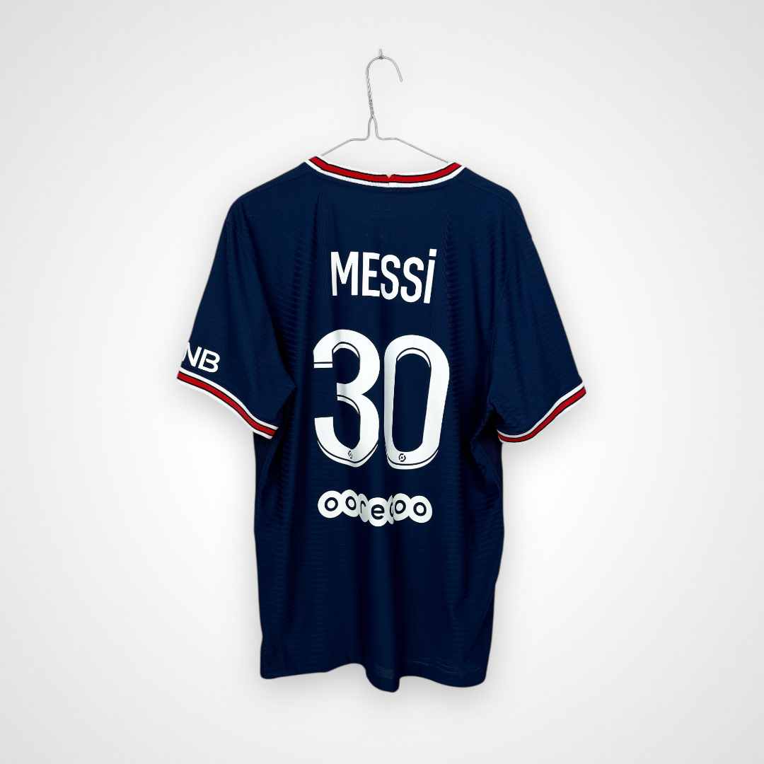 Oryginalna domowa koszulka piłkarska Paris Saint-Germain z sezonu 2021/22 – produkcji Nike, z nadrukiem Leo Messiego, w wersji meczowej.