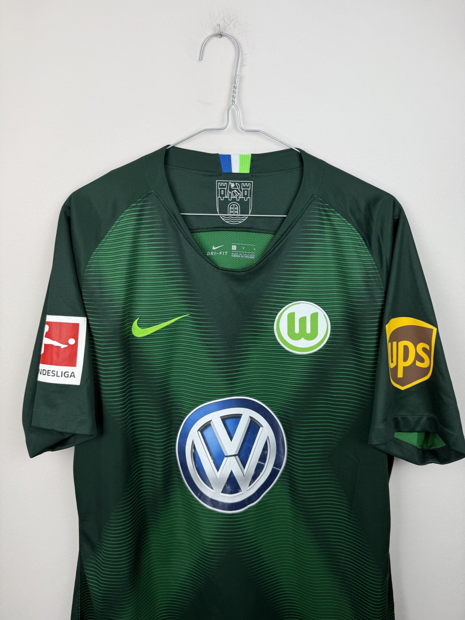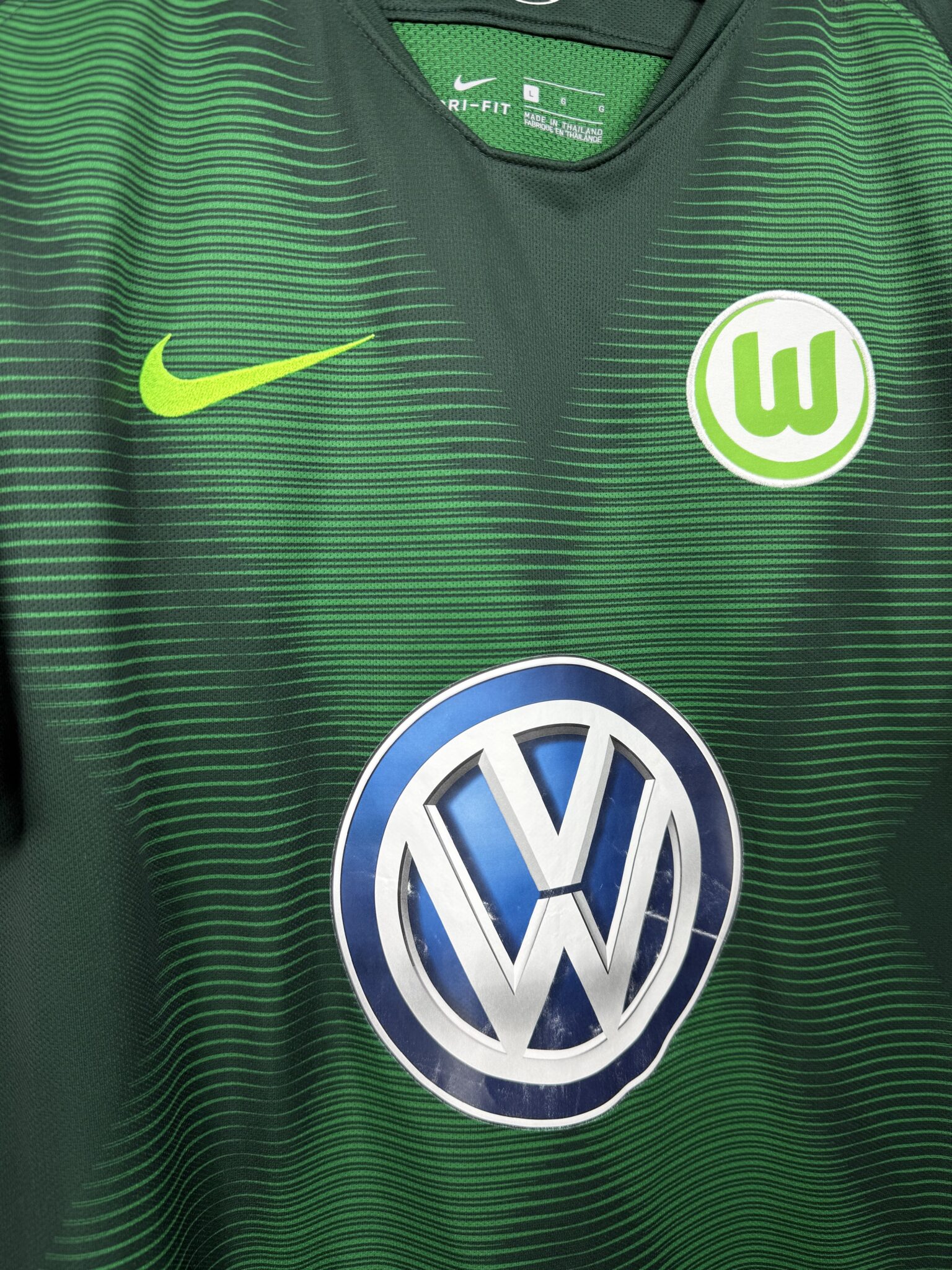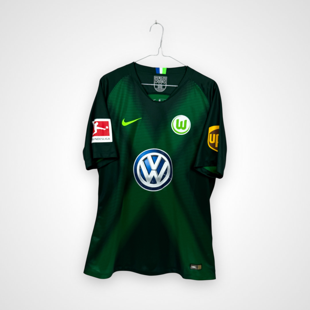 Domowa koszulka piłkarska VfL Wolfsburg 2018/19 – wersja meczowa z nadrukiem i patchem Bundesligi.