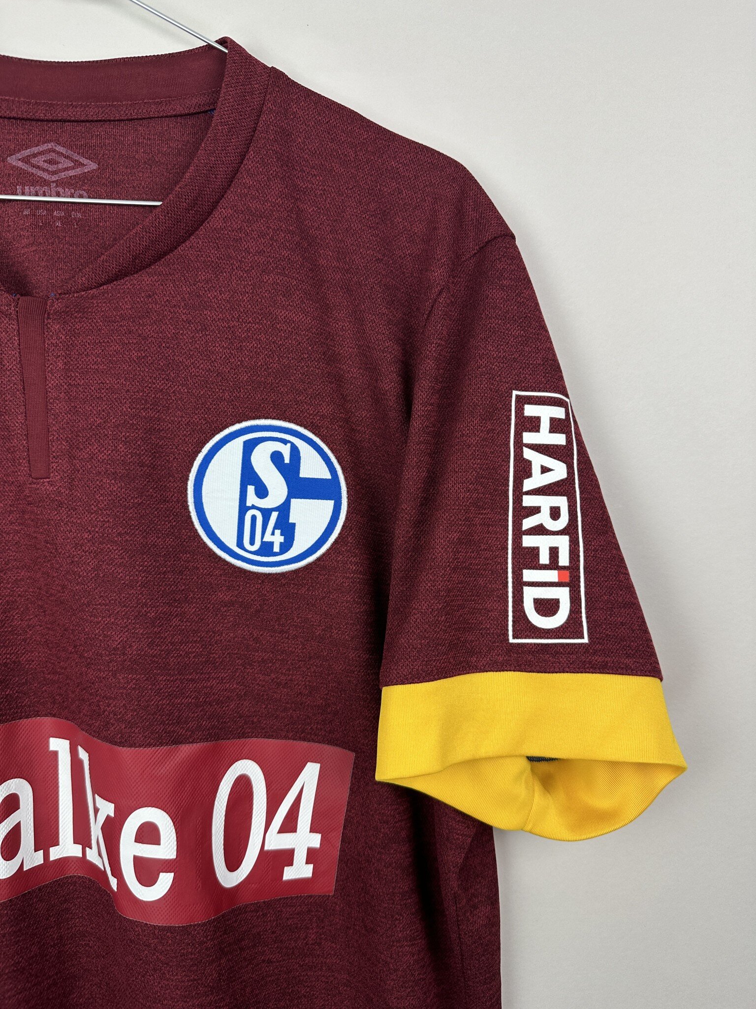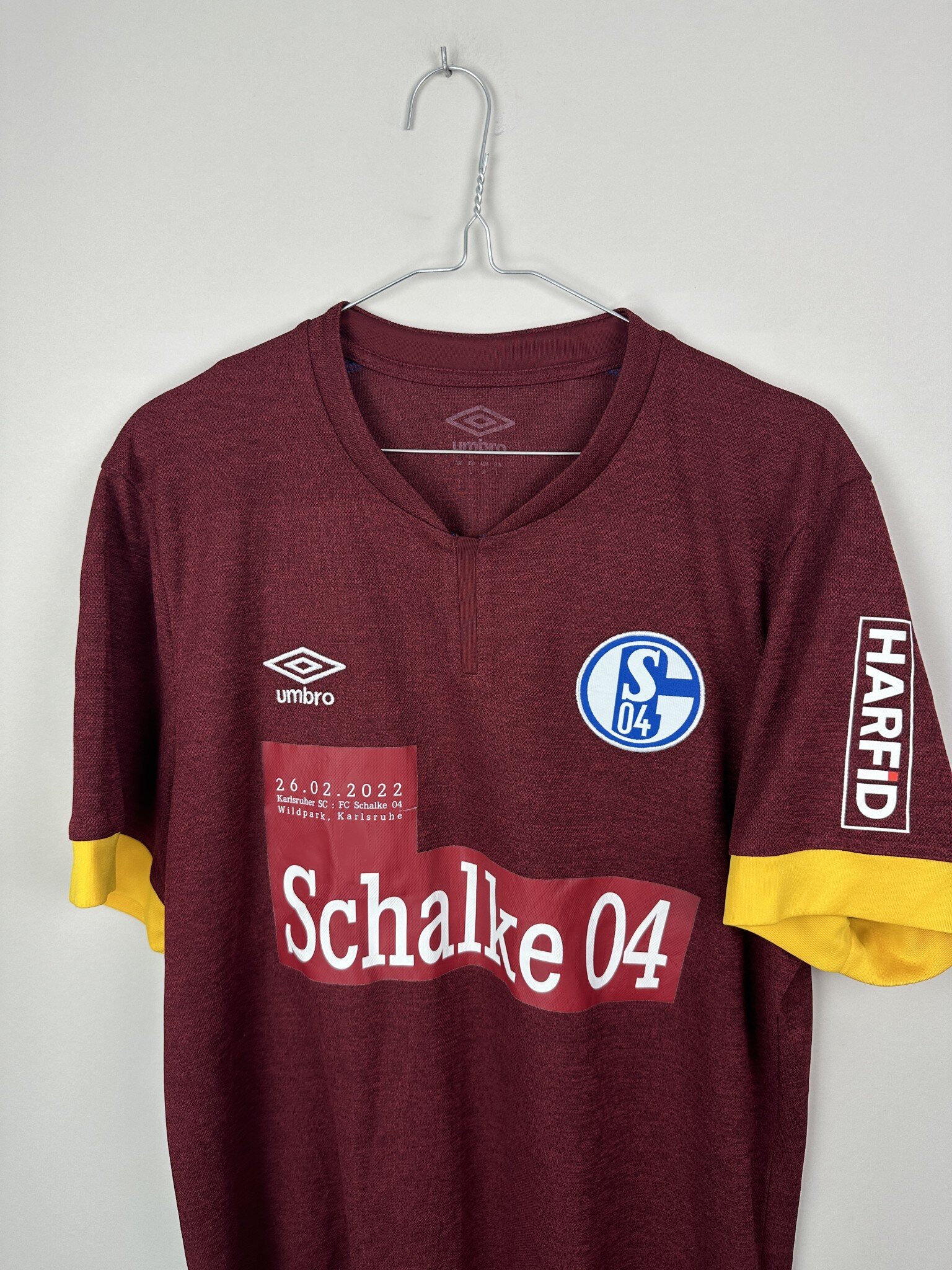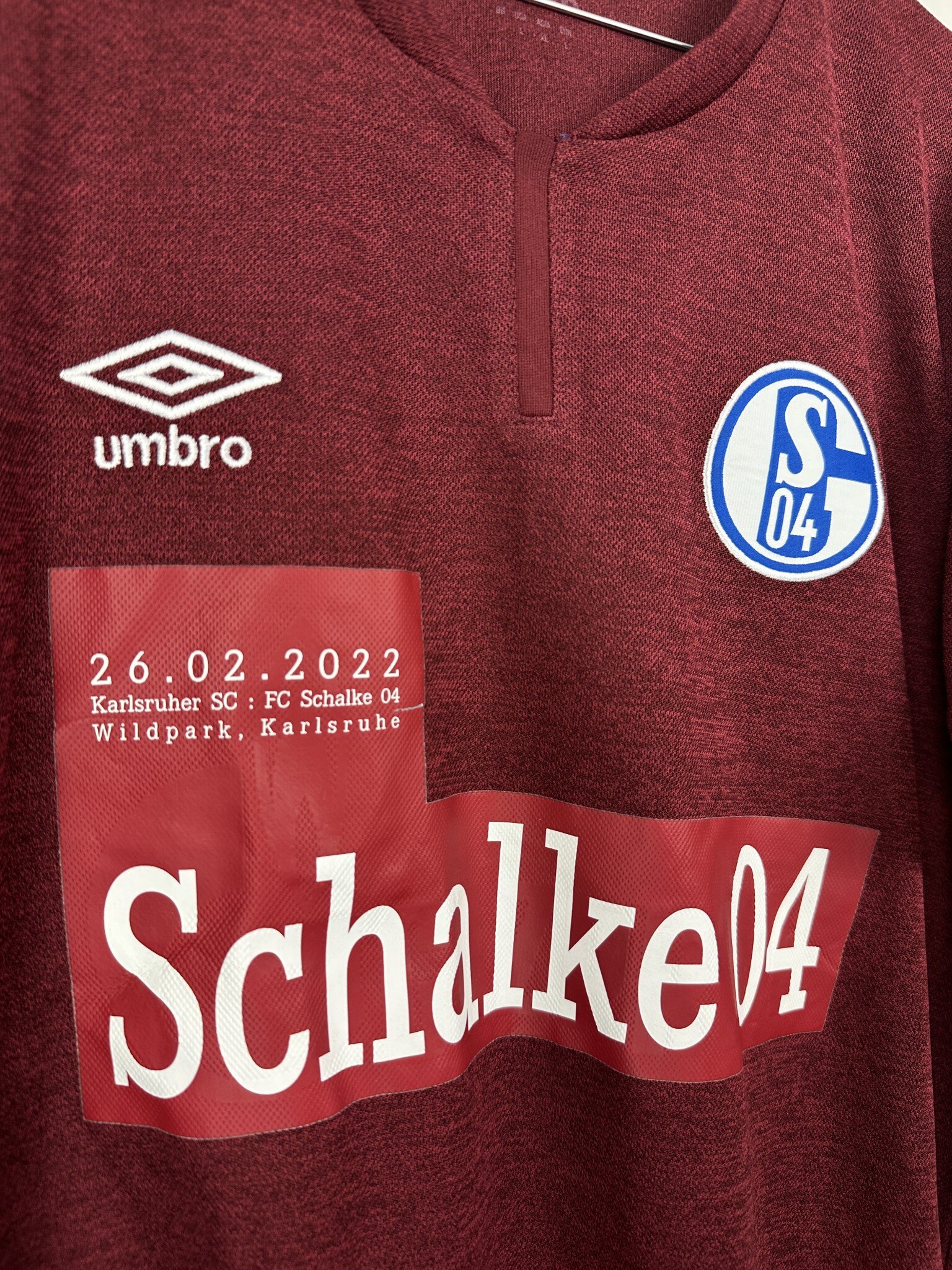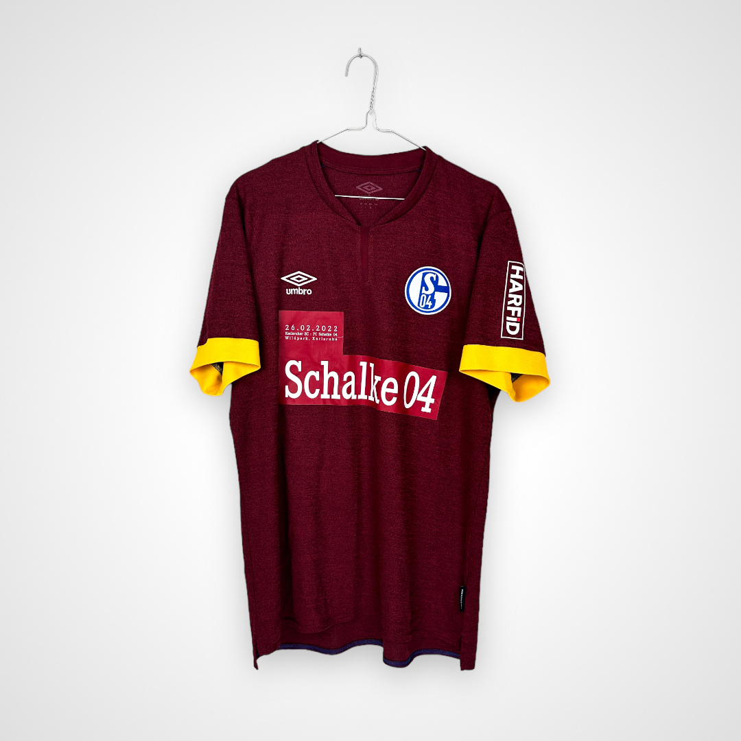 Dodatkowe informacje: Koszulka z rzadkim, okolicznościowym nadrukiem sponsora, który został naklejony na koszulki po tym gdy Schalke zdecydowało się na zerwanie współpracy z Gazpromem po napadnięciu Ukrainy przez Rosję.