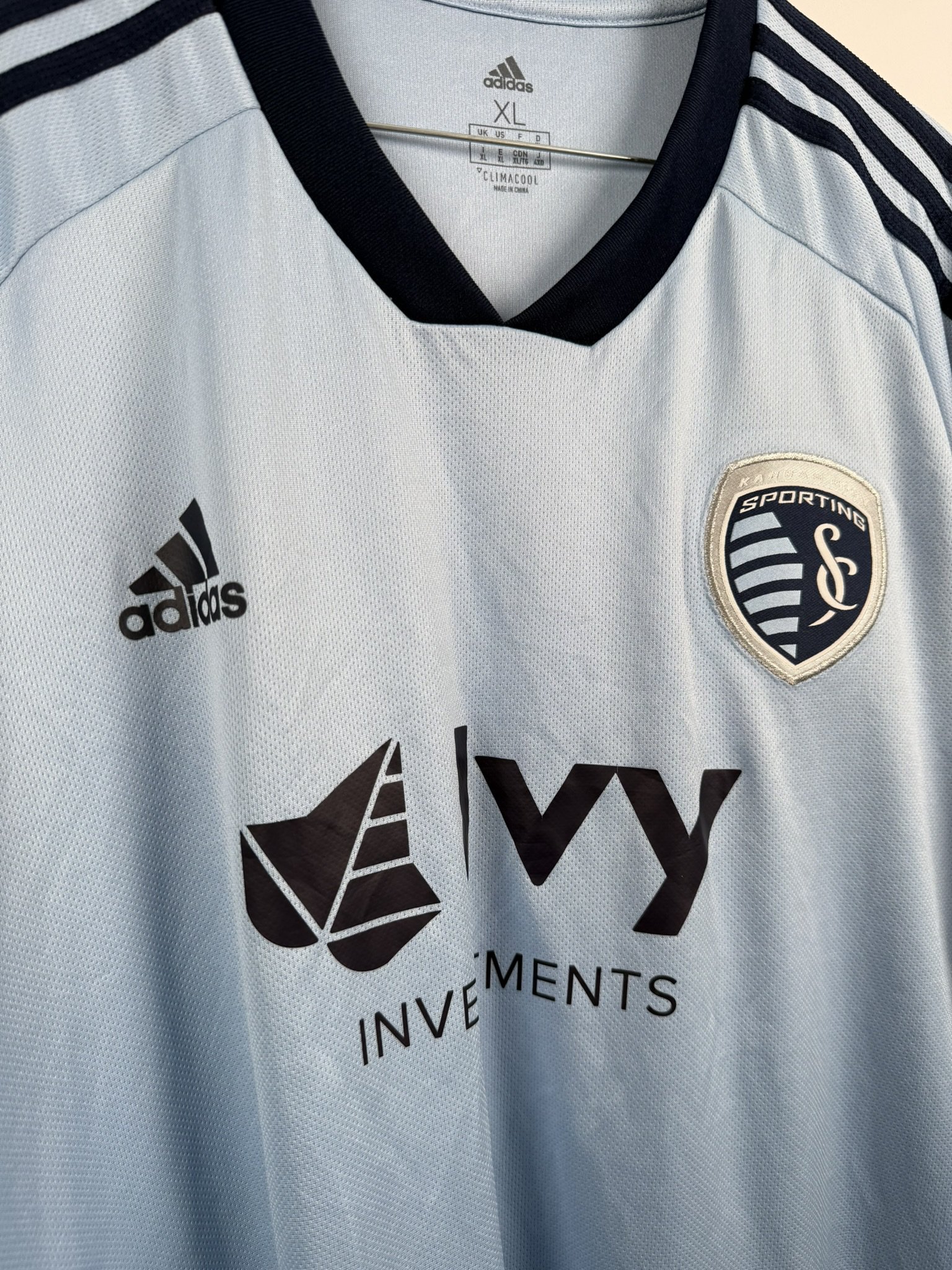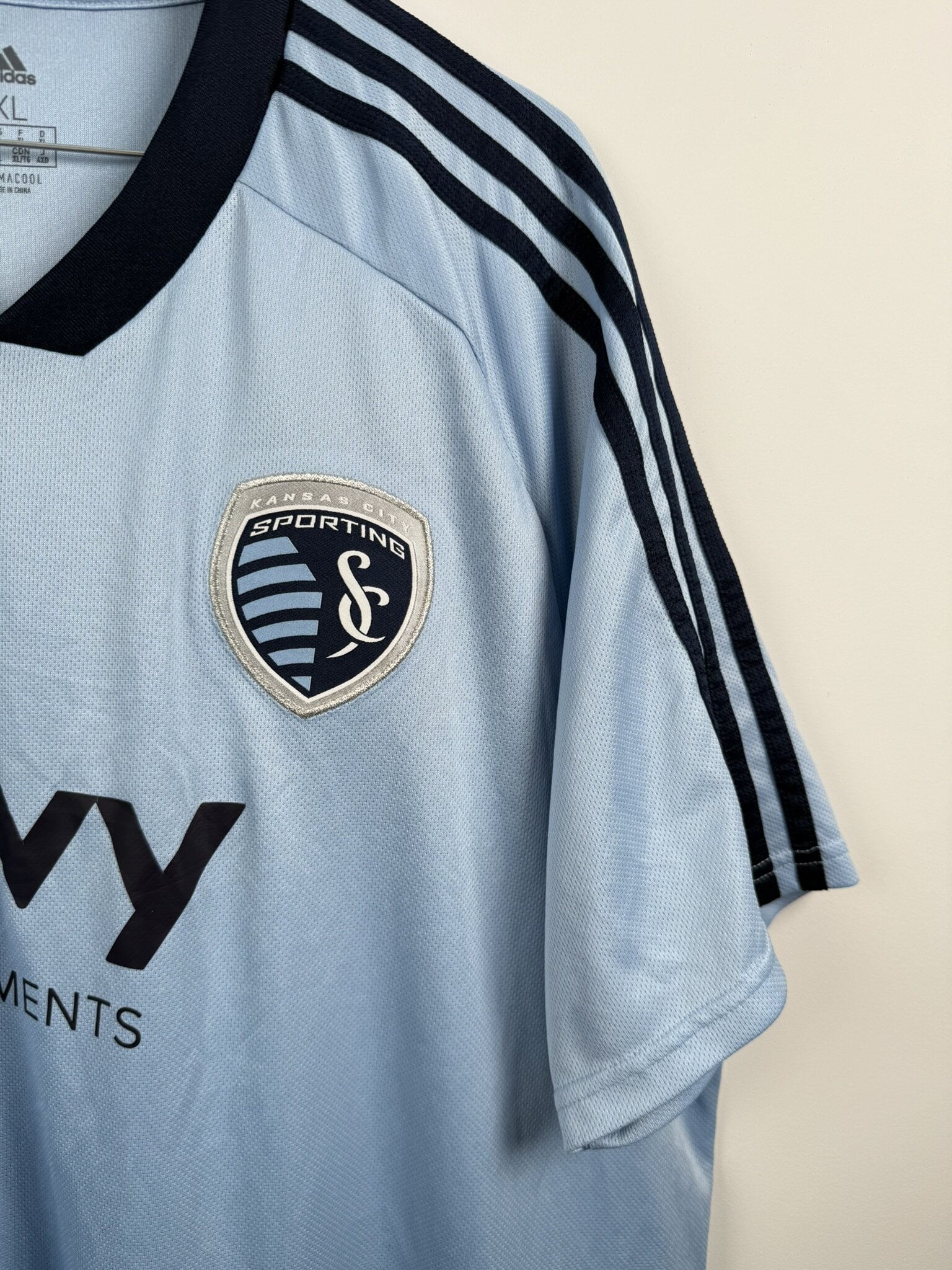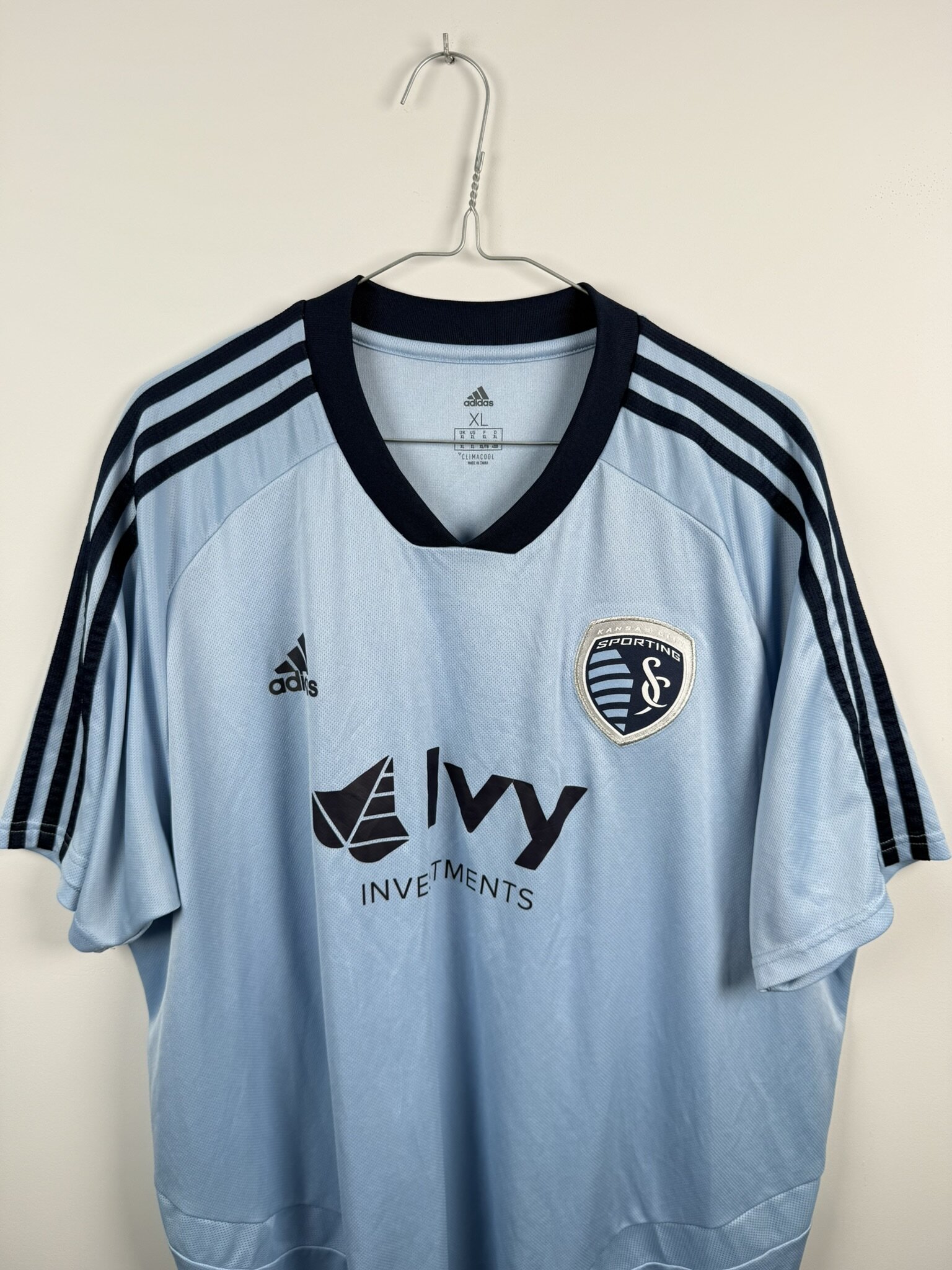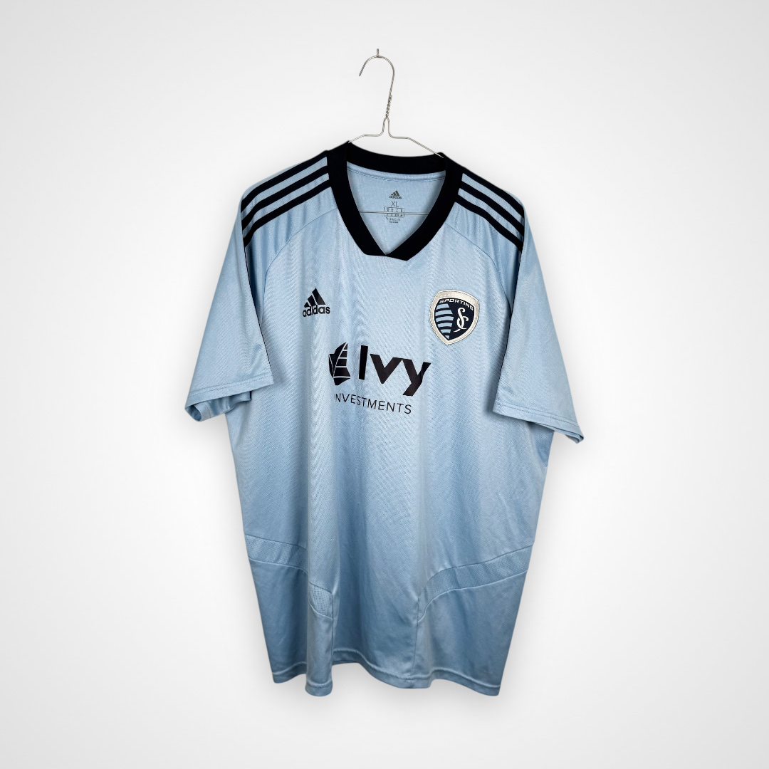 Oryginalna domowa koszulka piłkarska amerykańskiego klubu Sporting Kansas City produkcji Adidasa z 2018 roku. Klub występował niegdyś pod nazwą Kansas City Wizards.