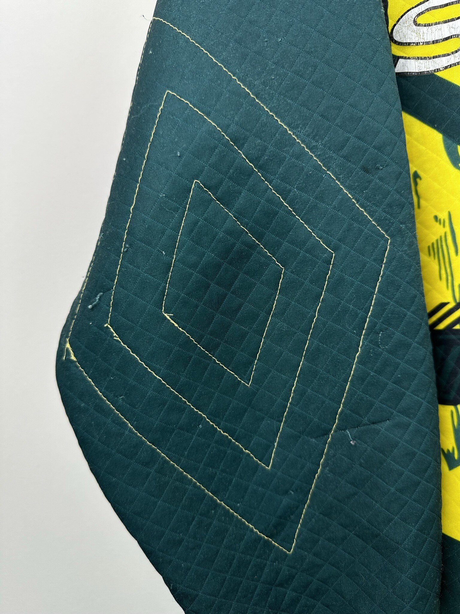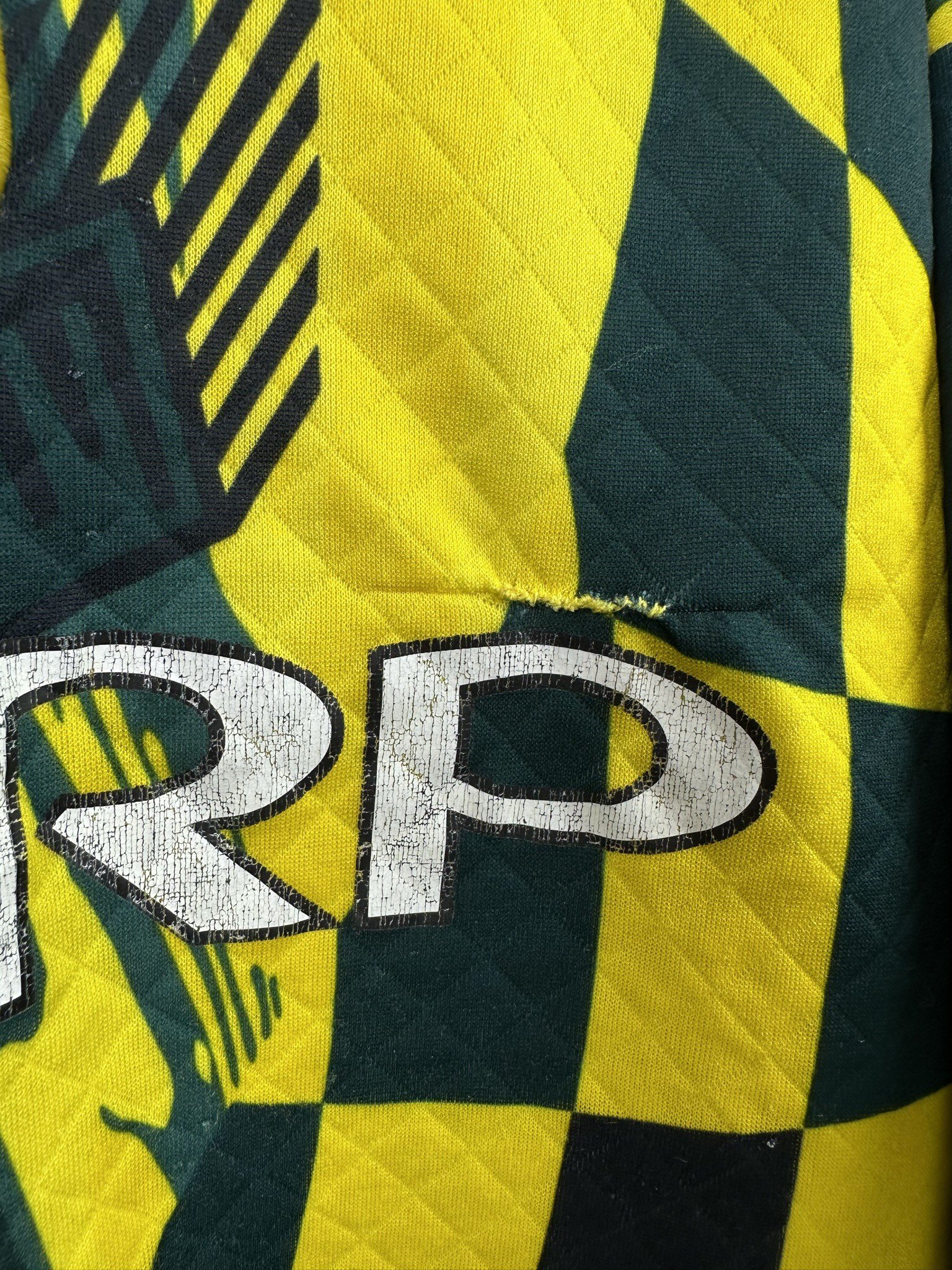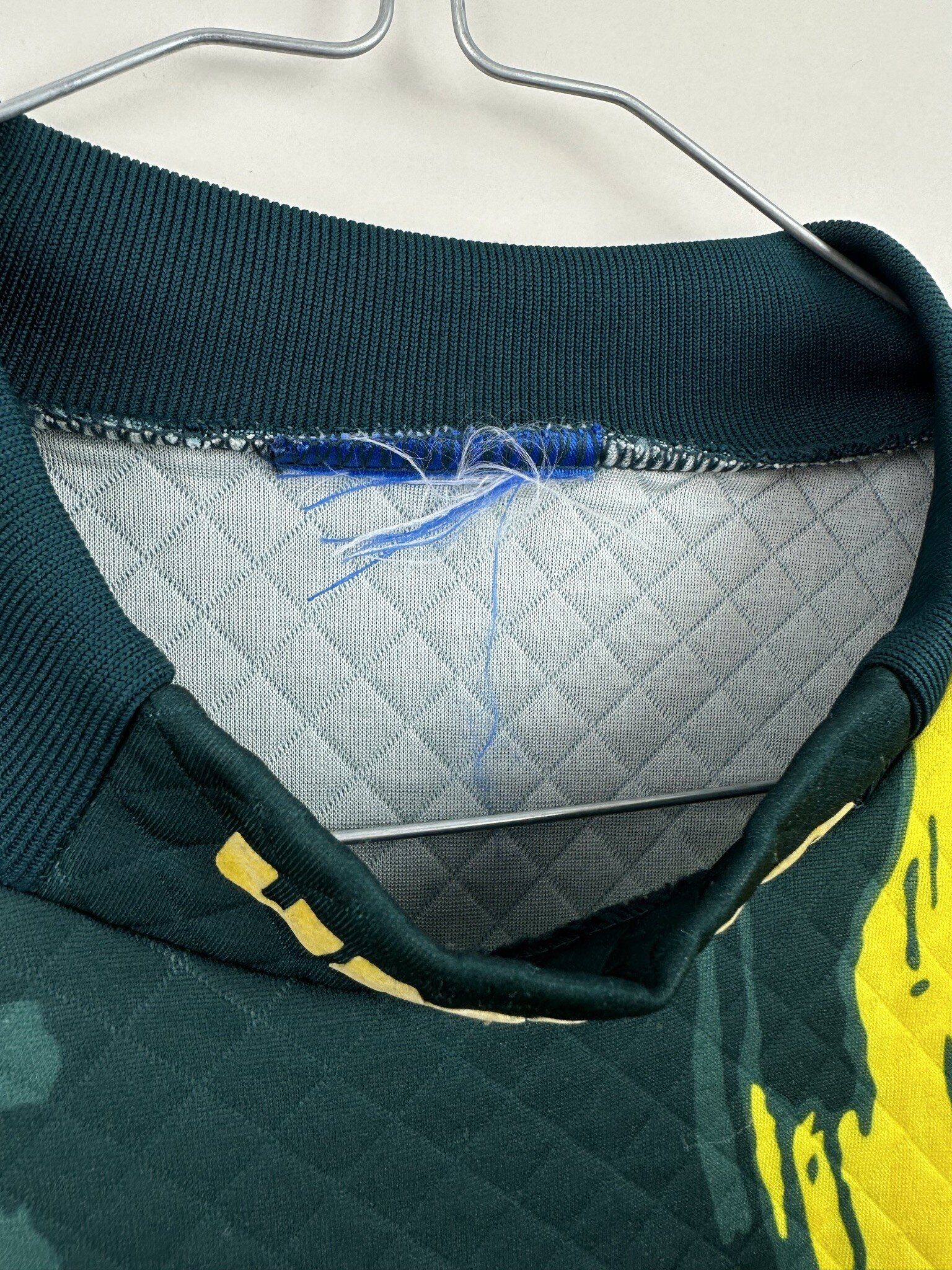 Stan: Słaby – ucięta metka z rozmiarem na karku, popękany nadruk sponsora, zszycie materiału na froncie, bardzo dużo mikro zaciągnięć na całej powierzchni koszulki.