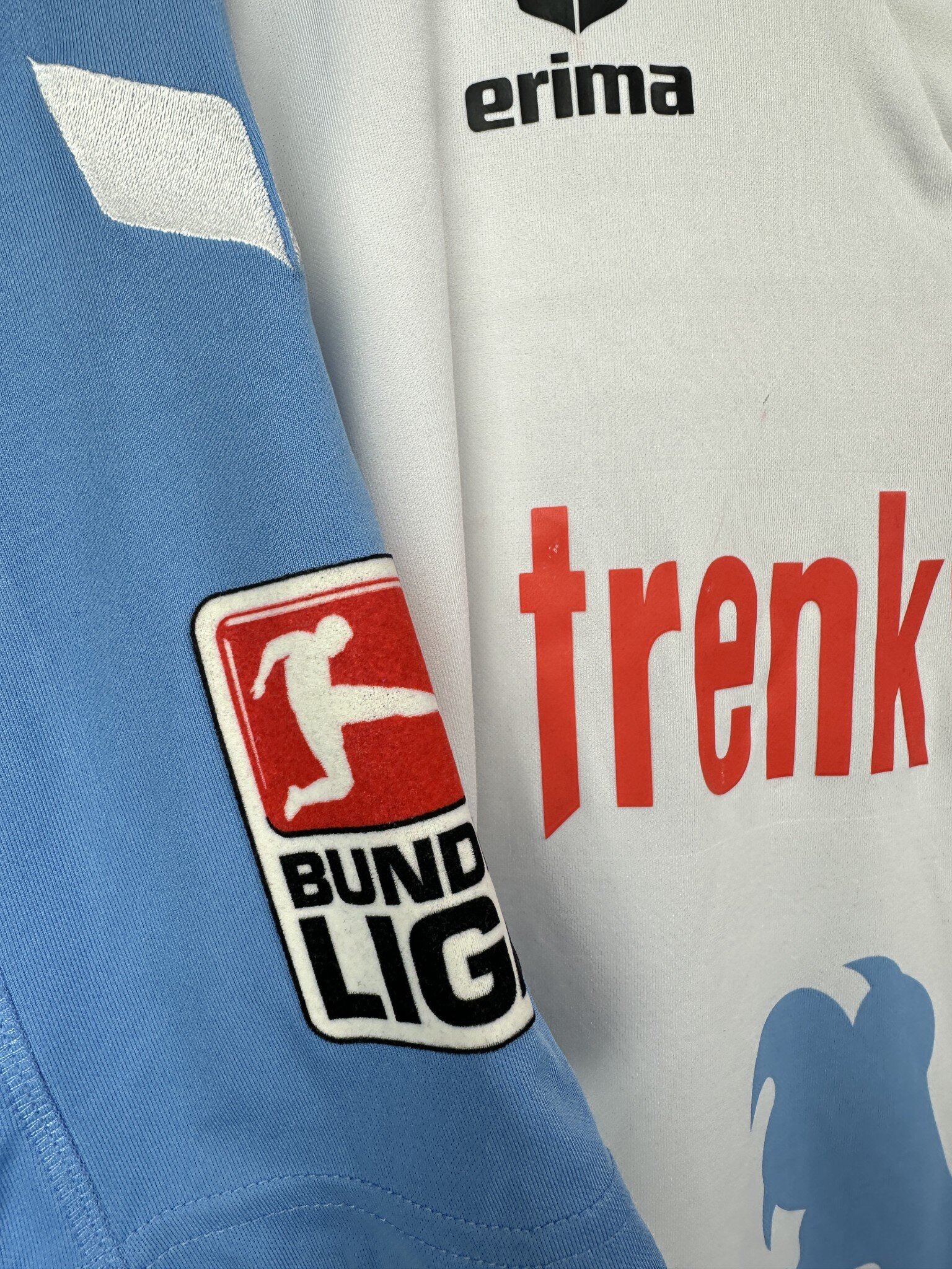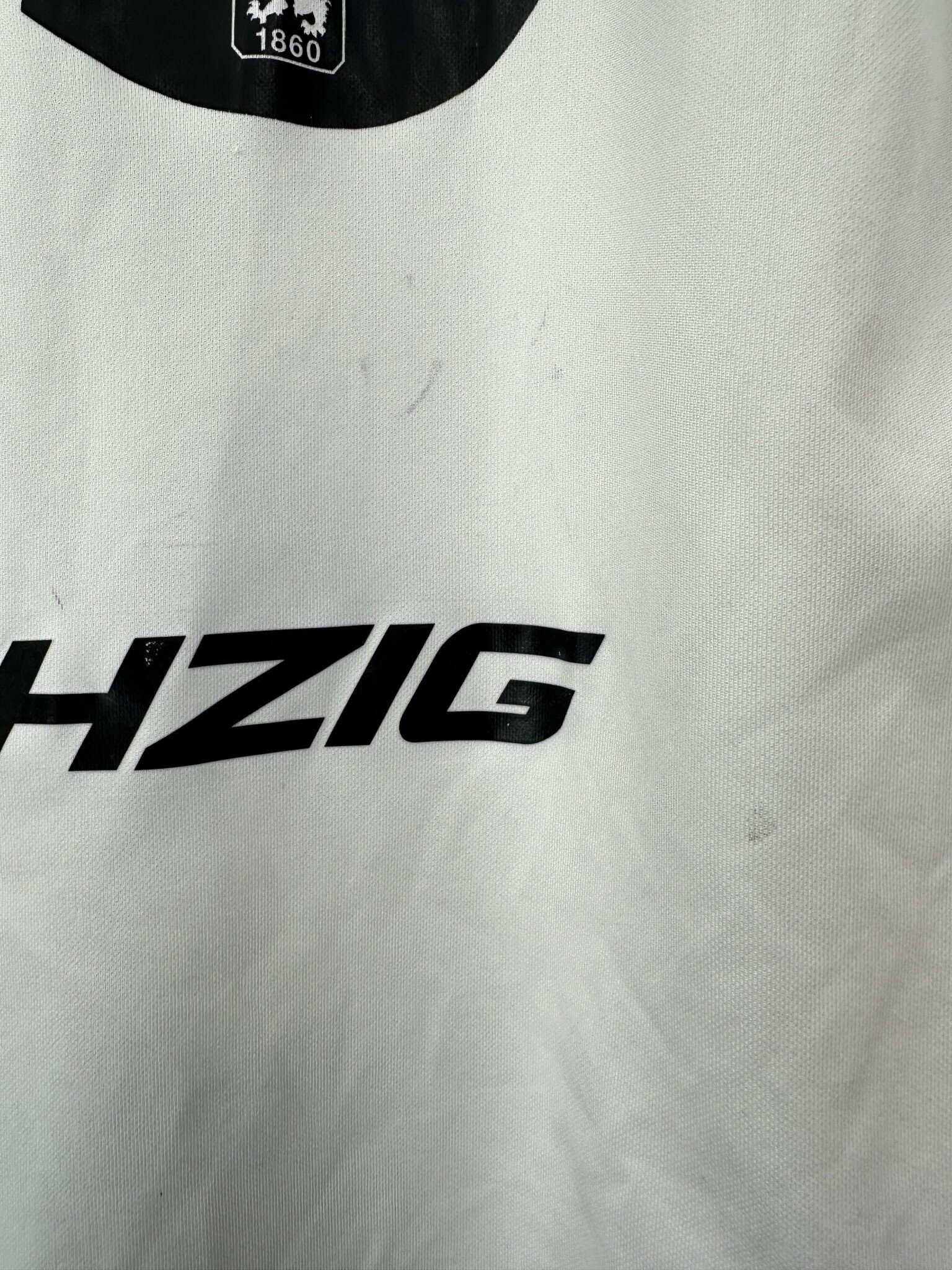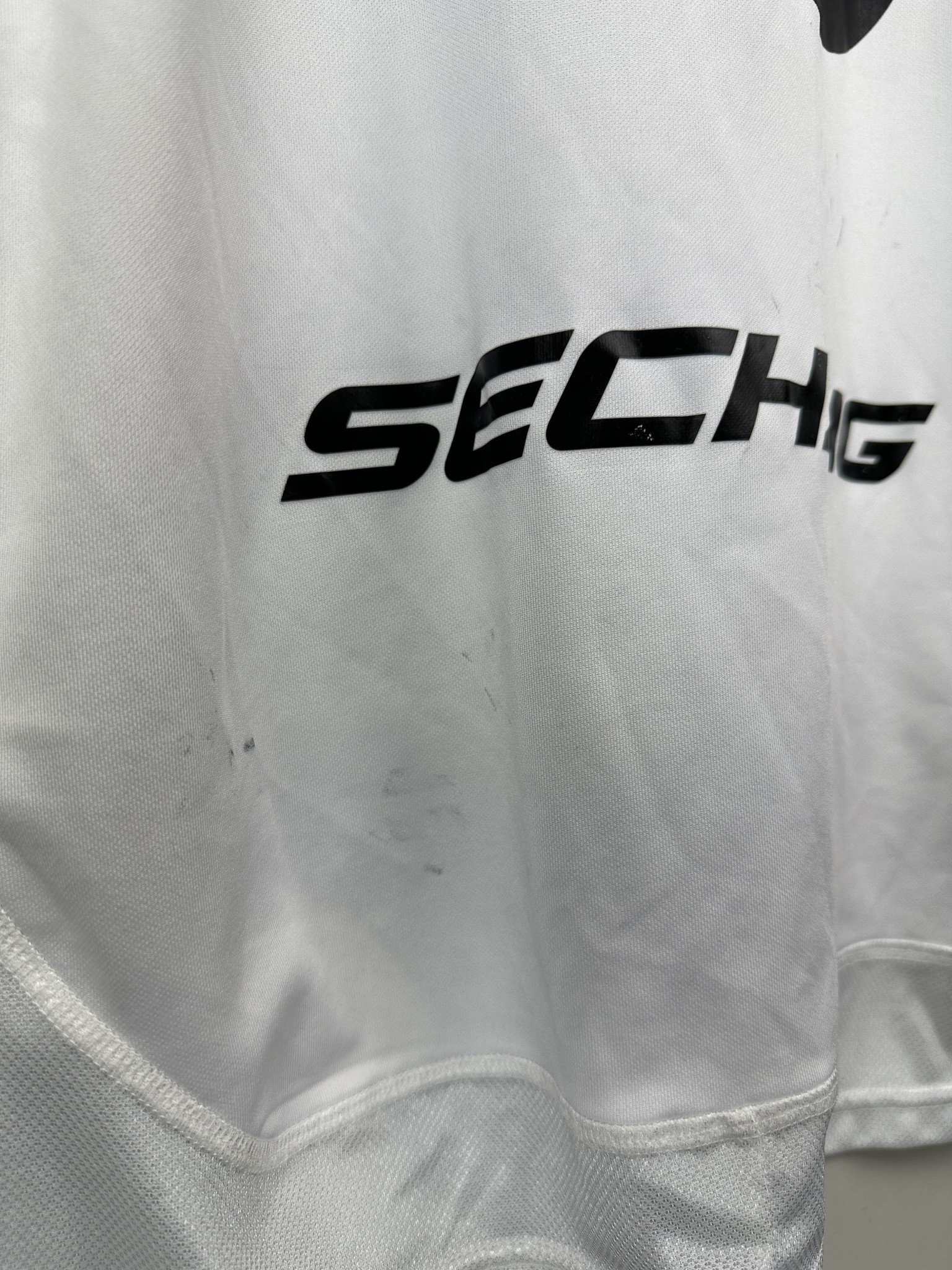 Stan: Dobry – mikro pęknięcia na nadruku sponsora i drobne zaciągnięcie na froncie oraz zabrudzenia na plecach.